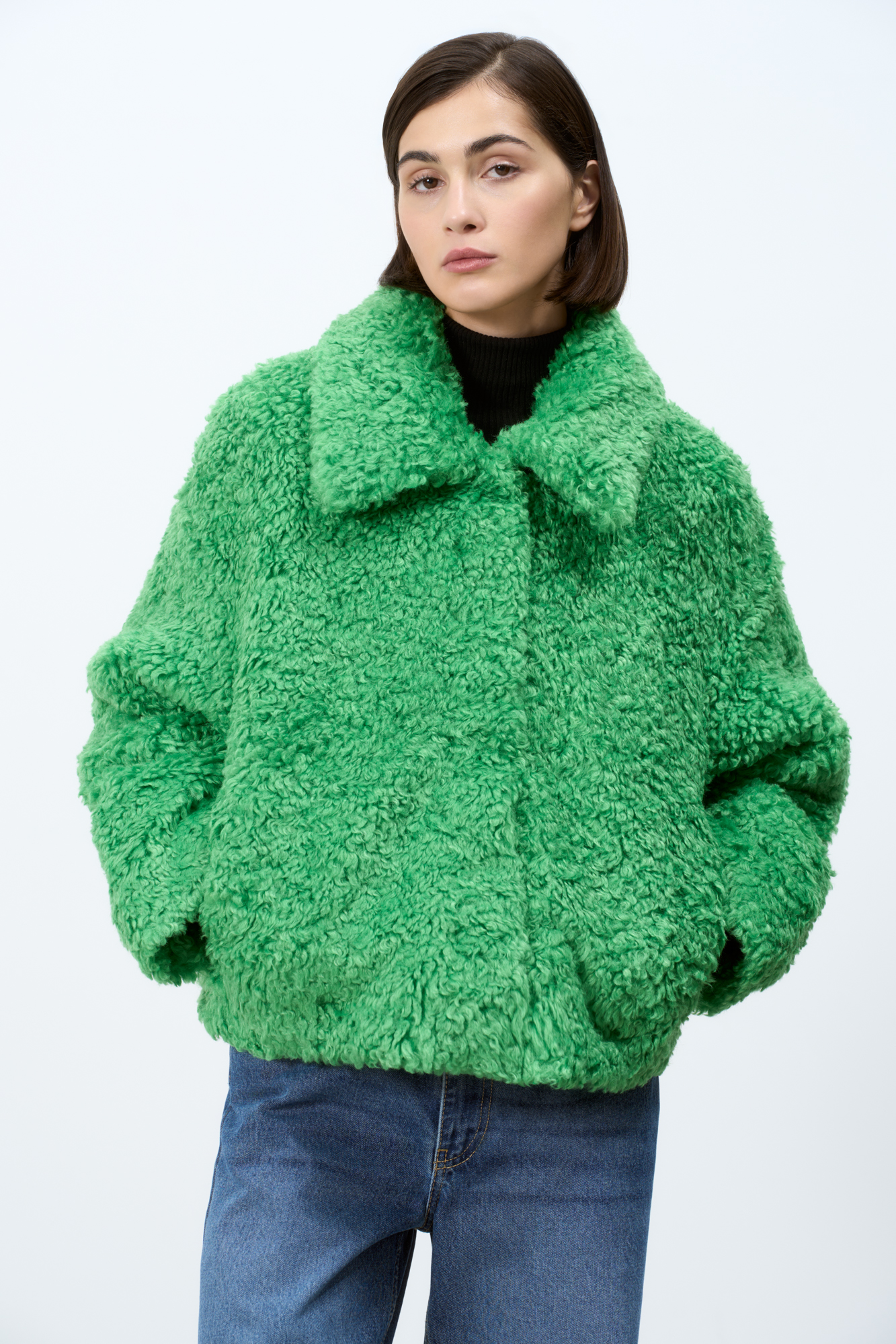 Короткая шуба из искусственного меха с отложным воротом. Застежка на кнопки под планкой. Длинные рукава с трикотажными митенками.