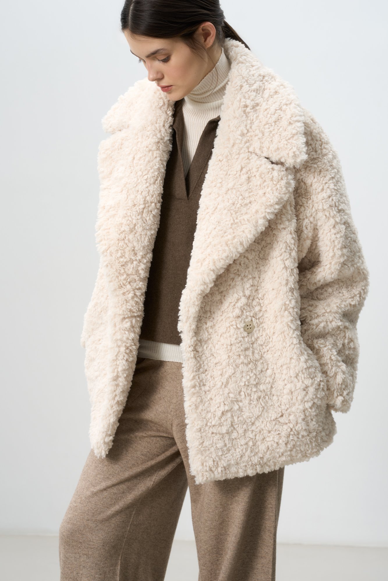 Двубортная шуба из искусственного меха с английским воротником. Изделие декорировано шлевками и тонким поясом из экокожи. Модель на подкладке.