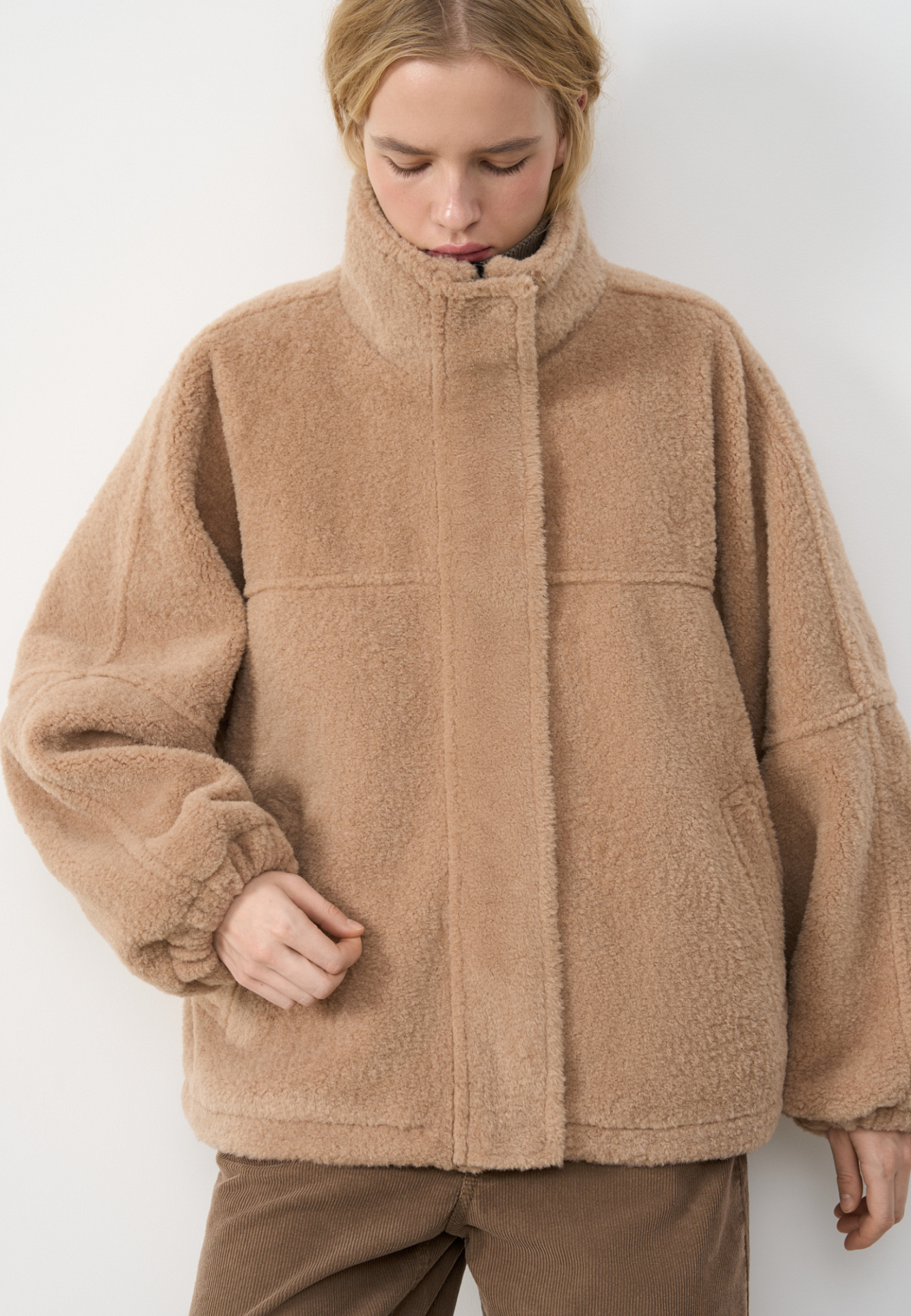 Шуба из экомеха с воротником-стойкой. Модель свободного силуэта с боковыми карманами, объемными швами и манжетами на резинке. Застежка на молнию под планкой с кнопками, декорированной экокожей.