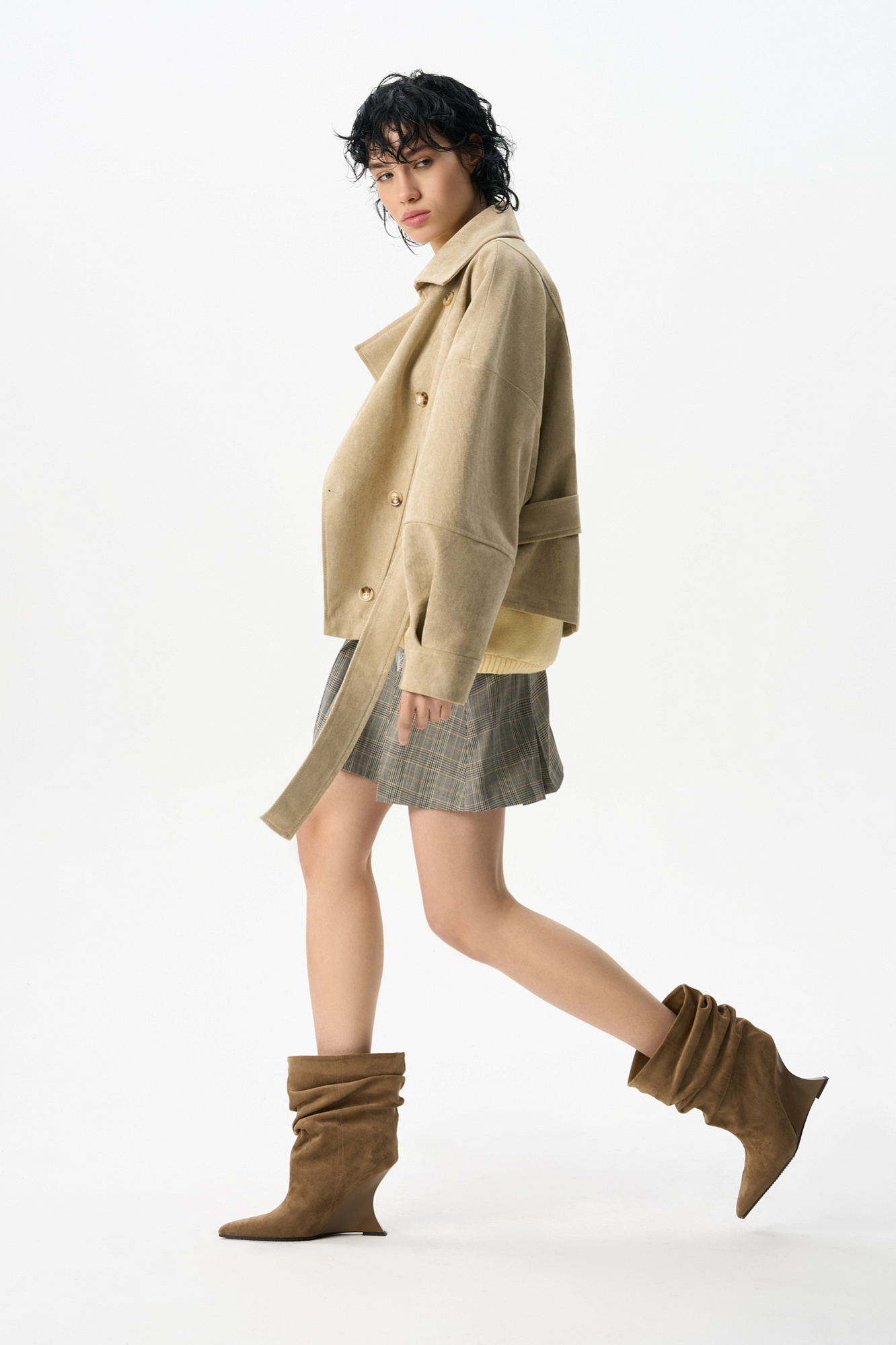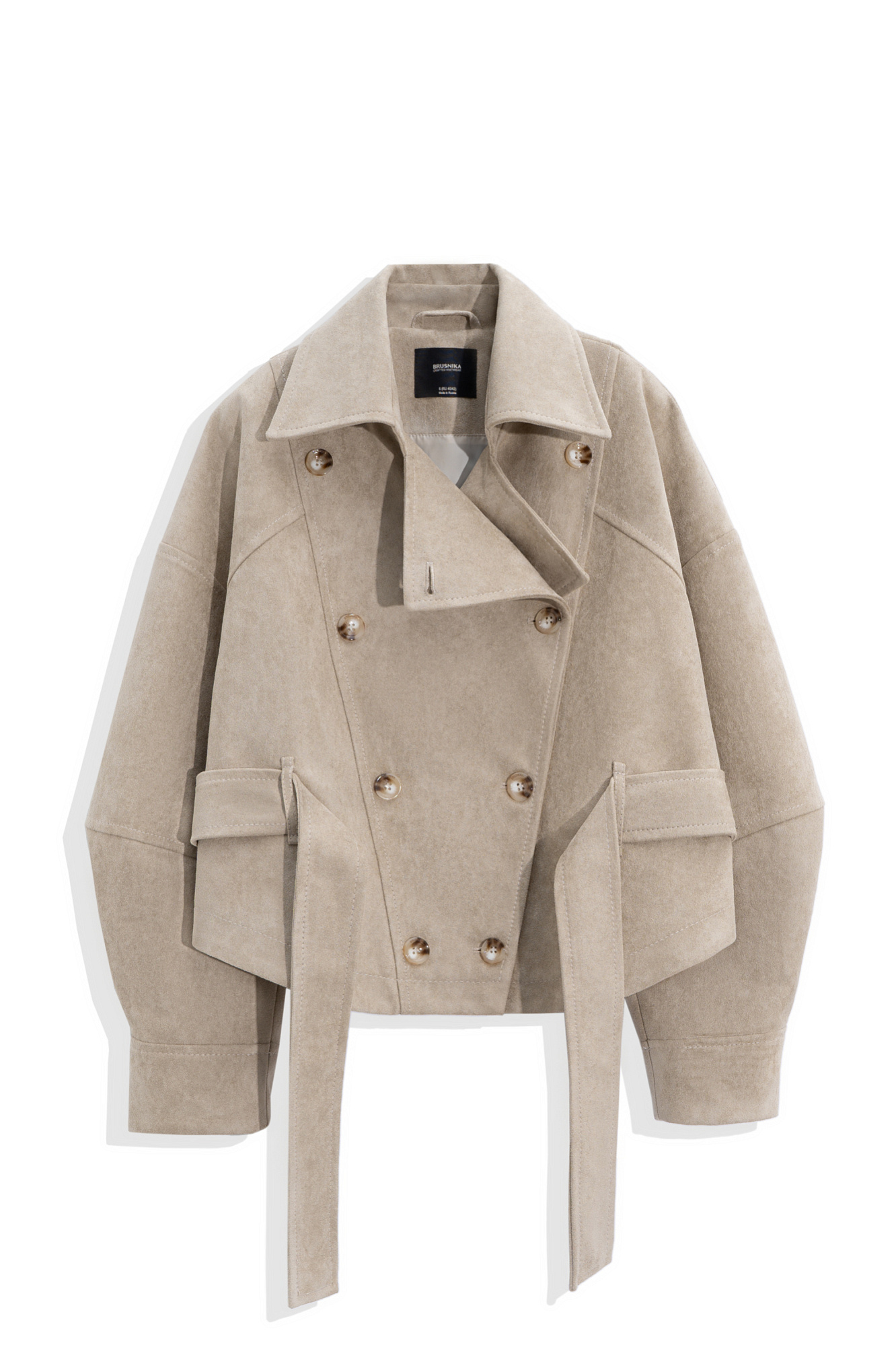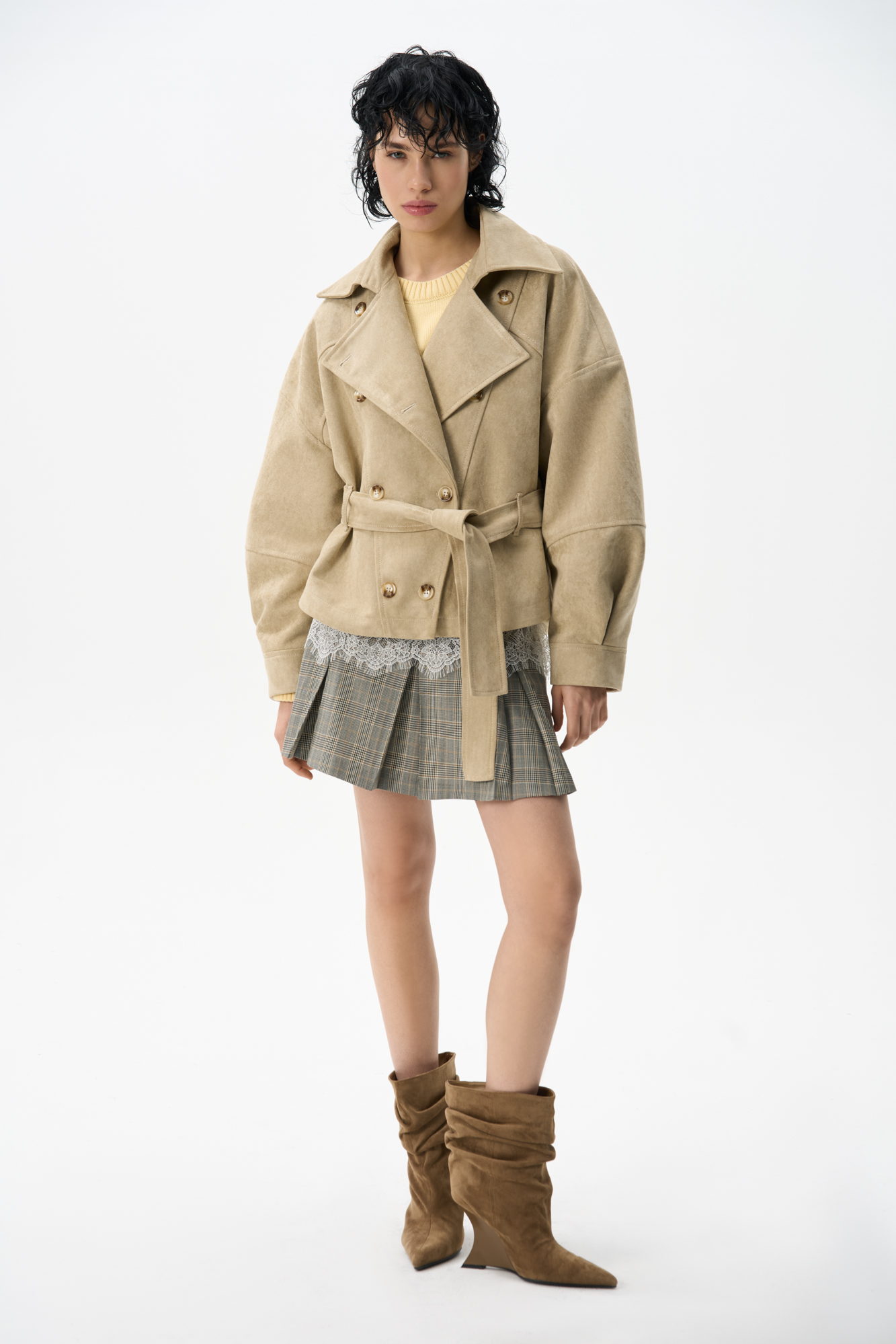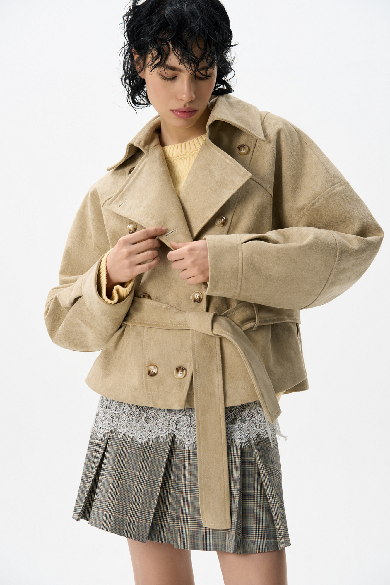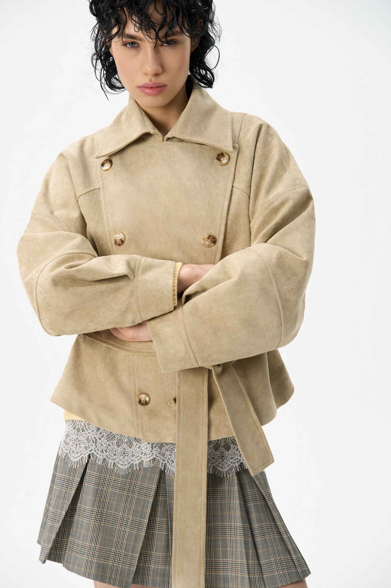 Двубортный короткий тренч сложной геометрии, выполненный из ткани с имитацией внешнего вида и свойств натуральной замши. Модель с отложным воротником, свободными рукавами со спущенной линией плеч, шлевками на поясе и ремнем.