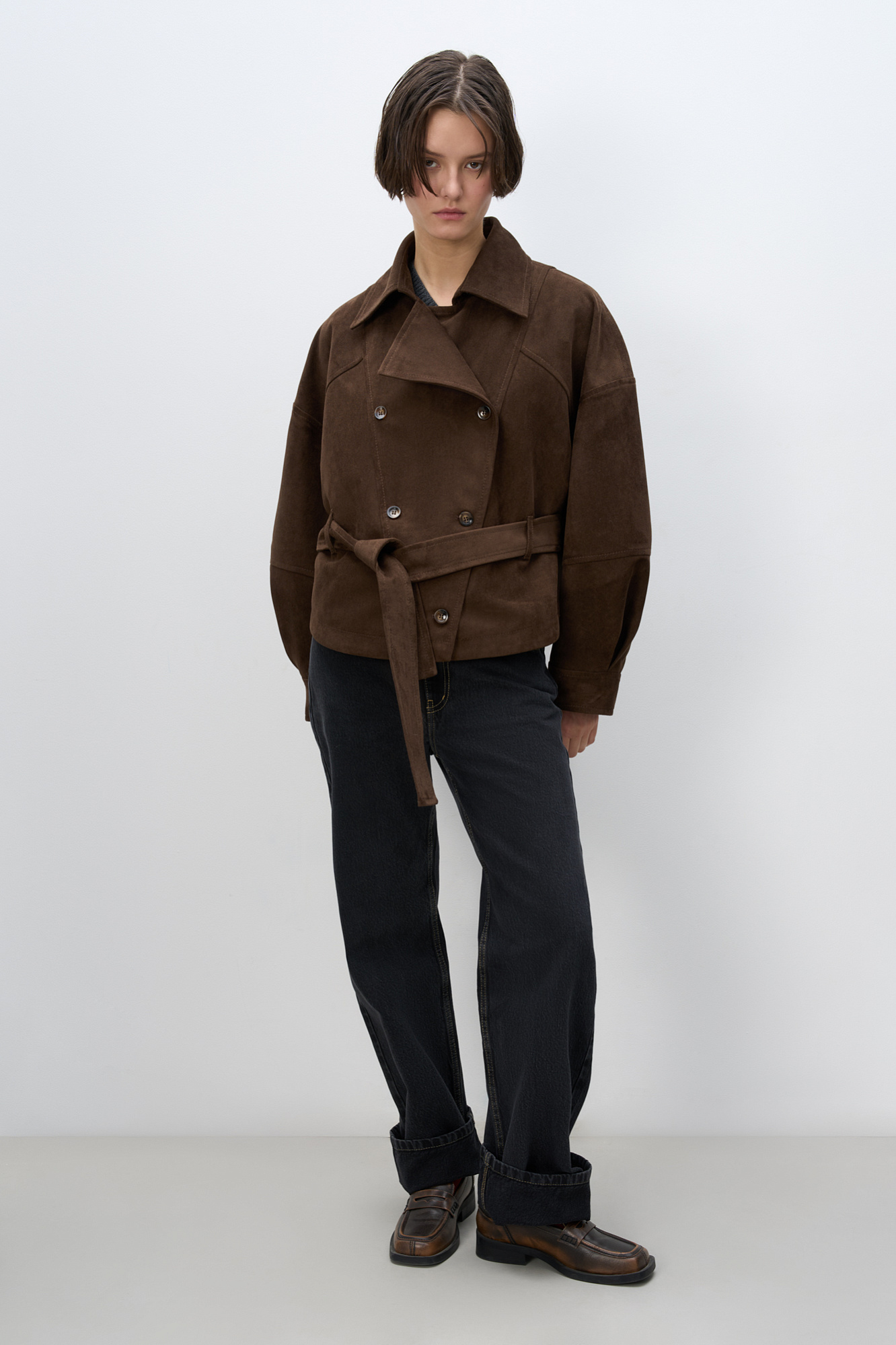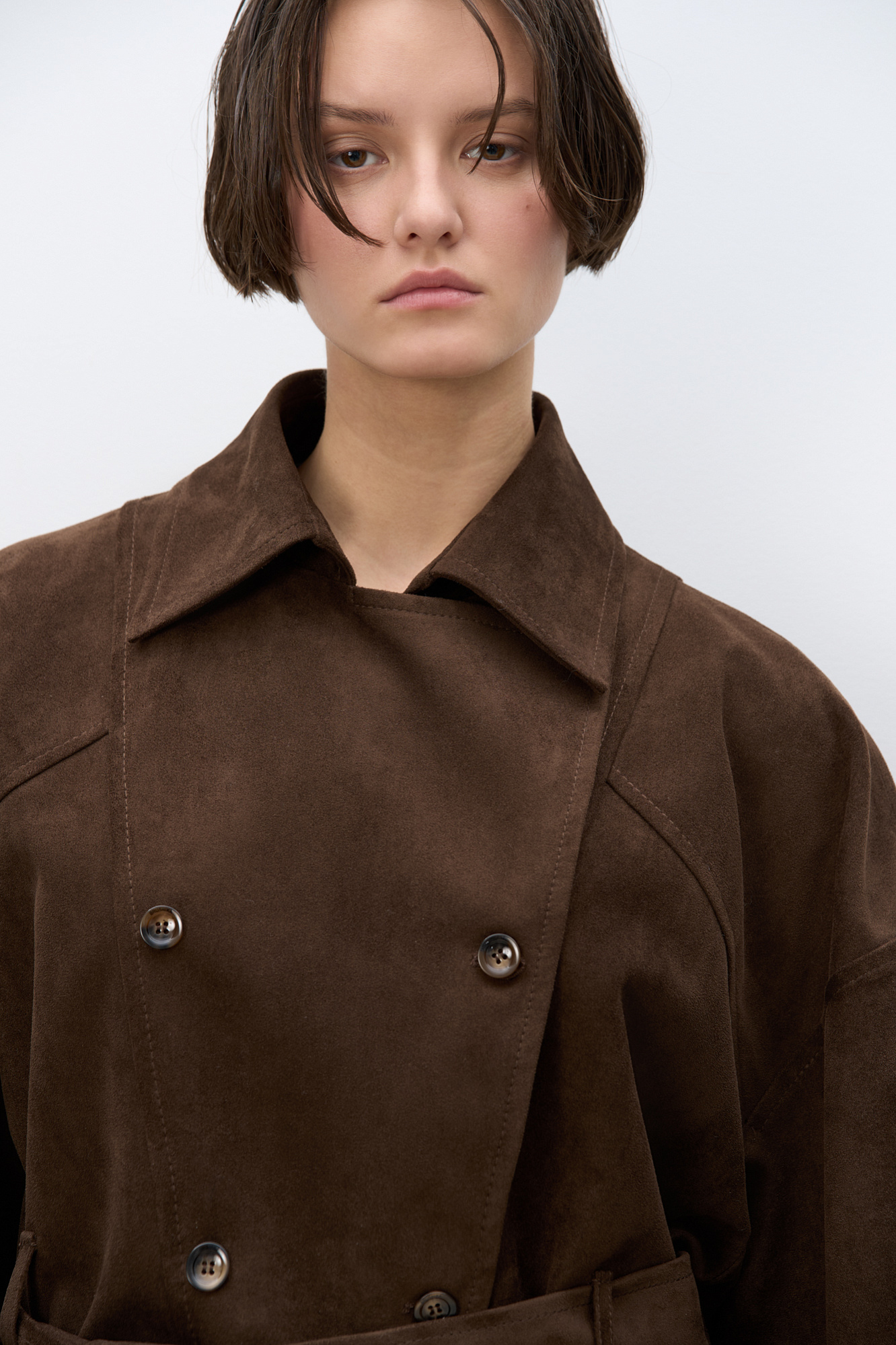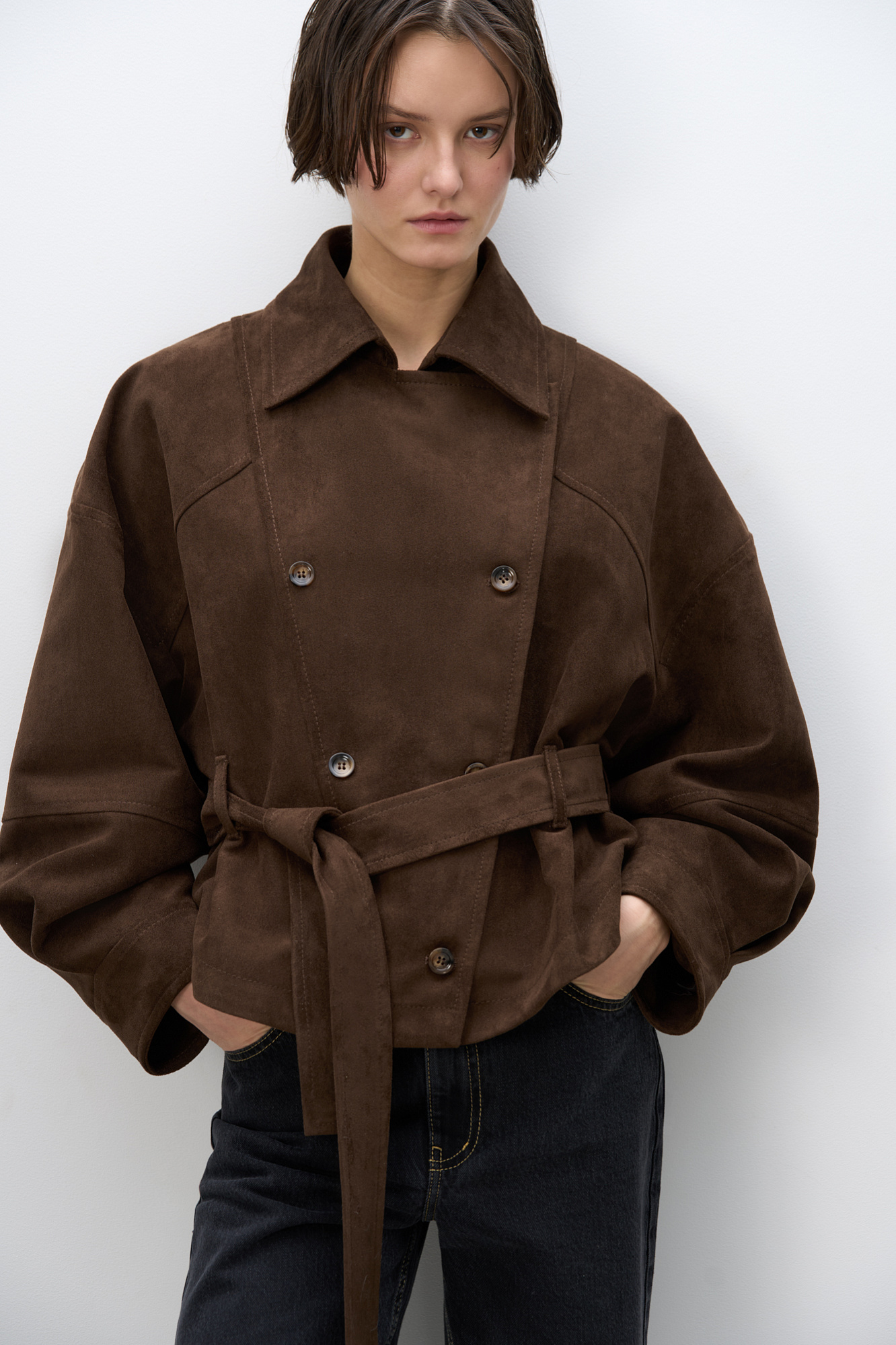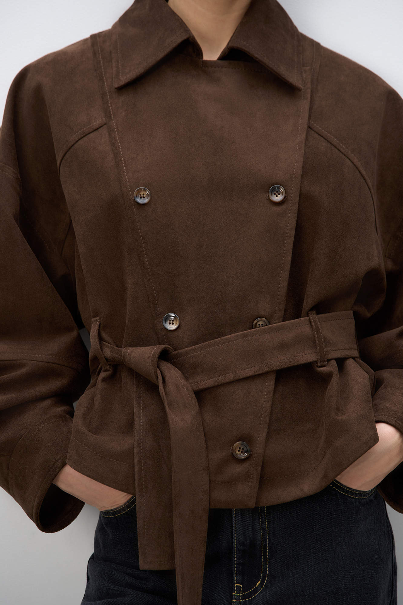 Двубортный короткий тренч сложной геометрии, выполненный из ткани с имитацией внешнего вида и свойств натуральной замши. Модель с отложным воротником, свободными рукавами со спущенной линией плеч, шлевками на поясе и ремнем.