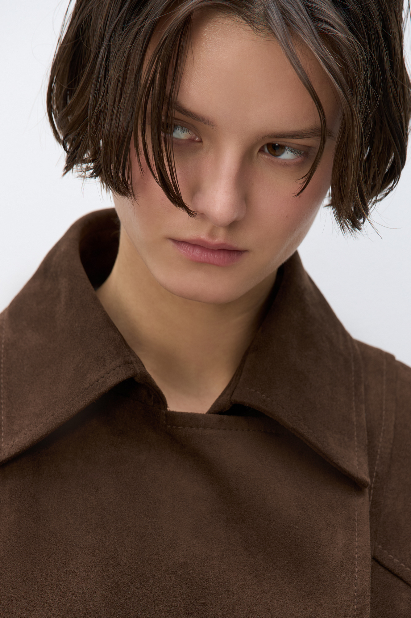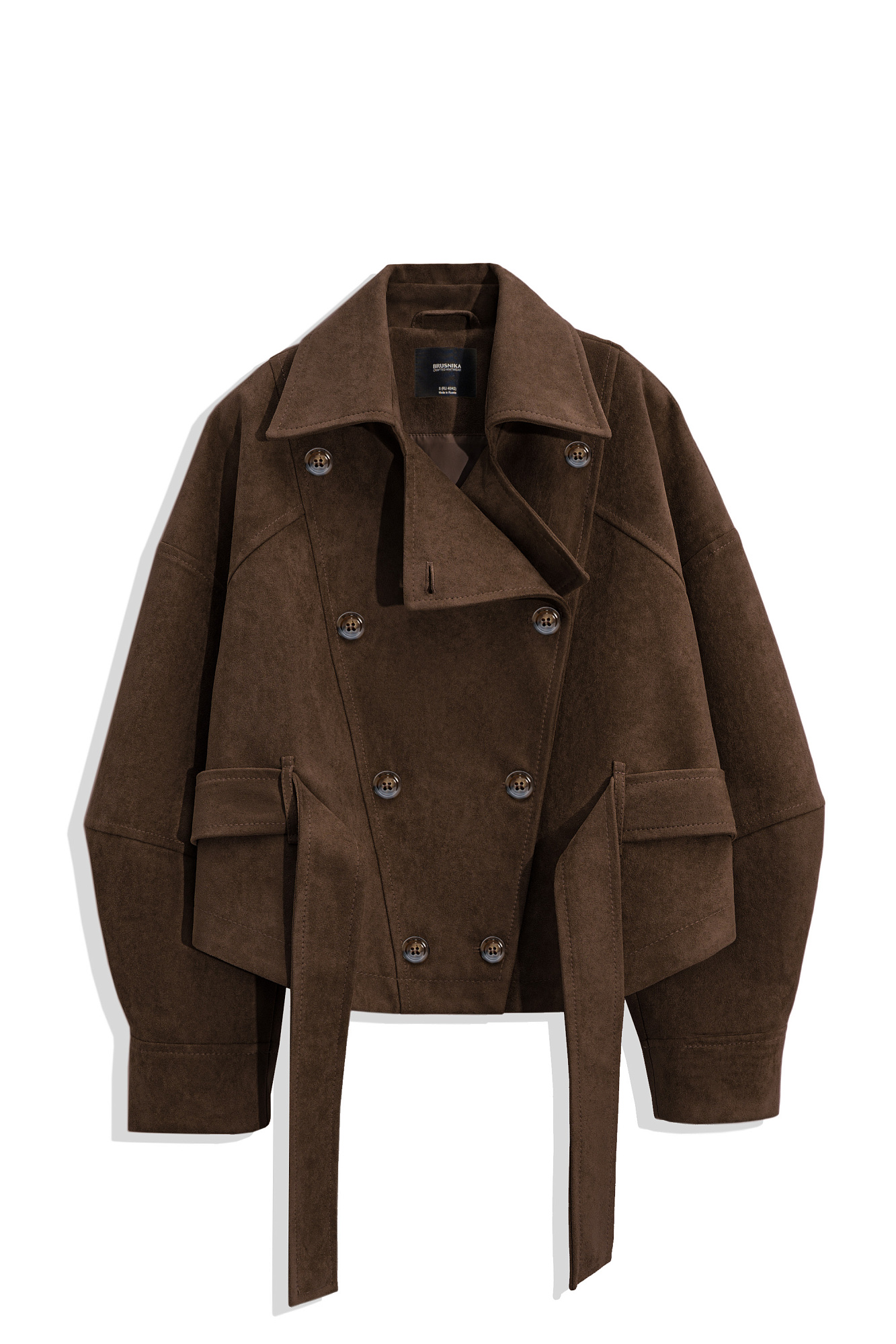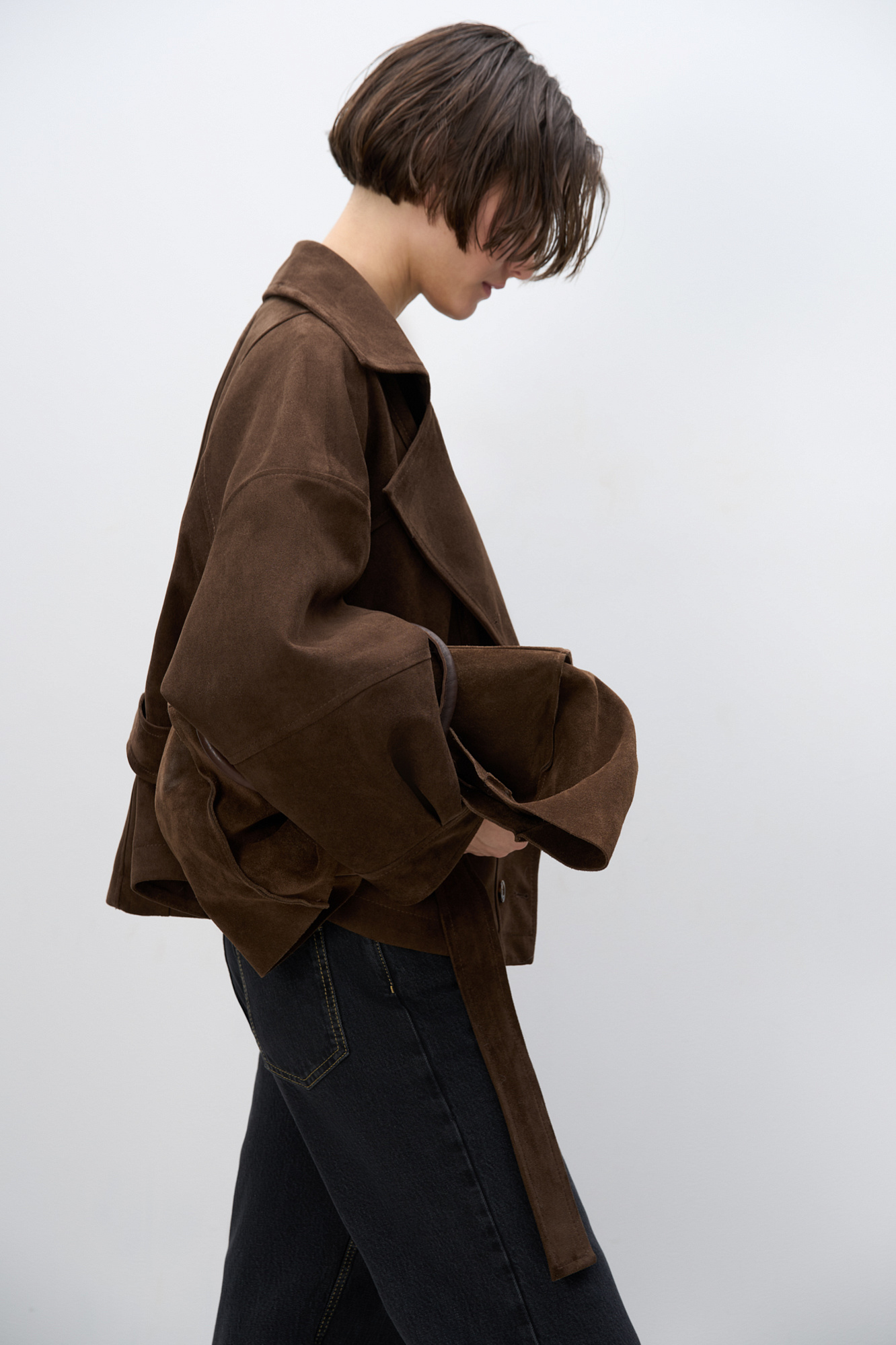 Двубортный короткий тренч сложной геометрии, выполненный из ткани с имитацией внешнего вида и свойств натуральной замши. Модель с отложным воротником, свободными рукавами со спущенной линией плеч, шлевками на поясе и ремнем.