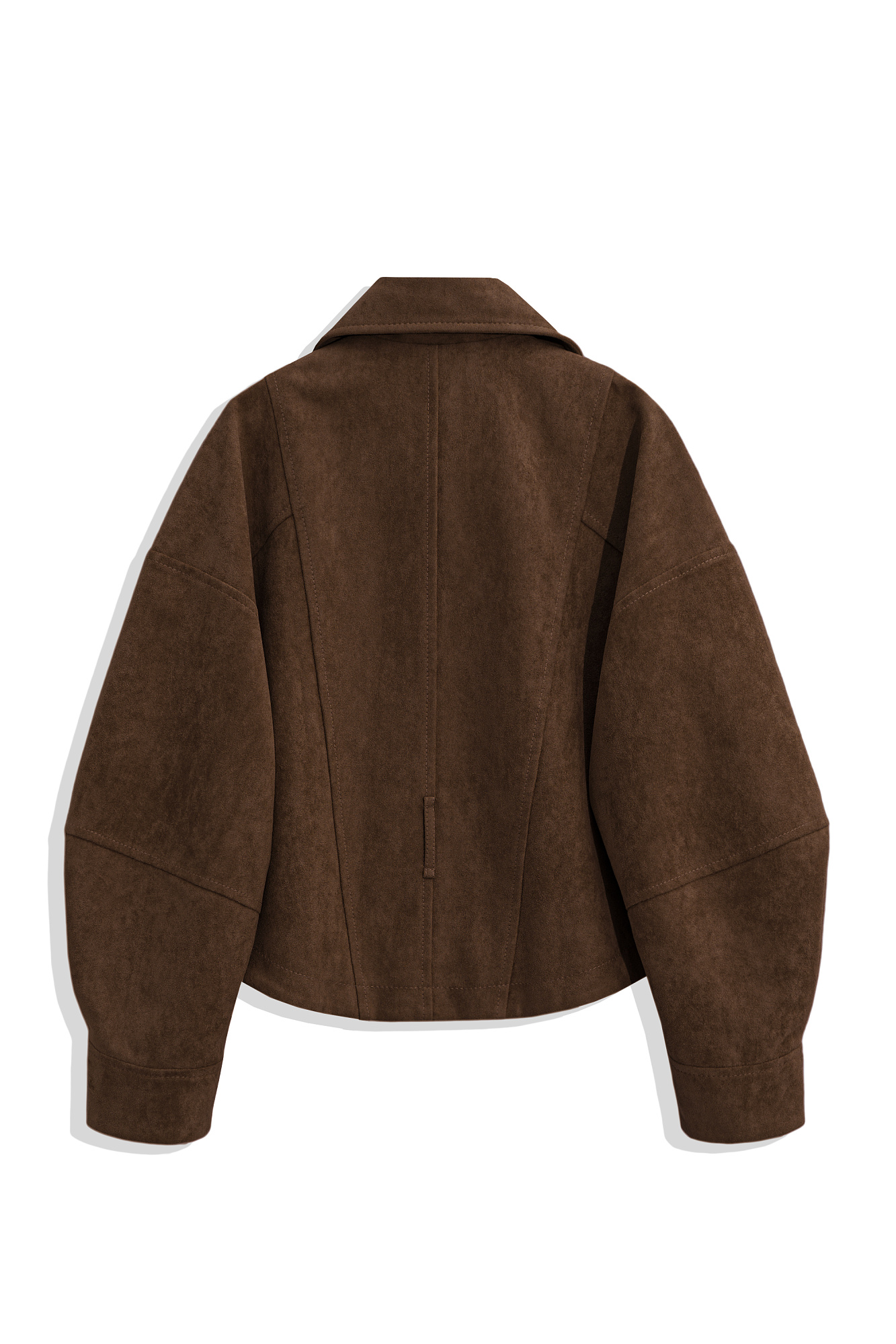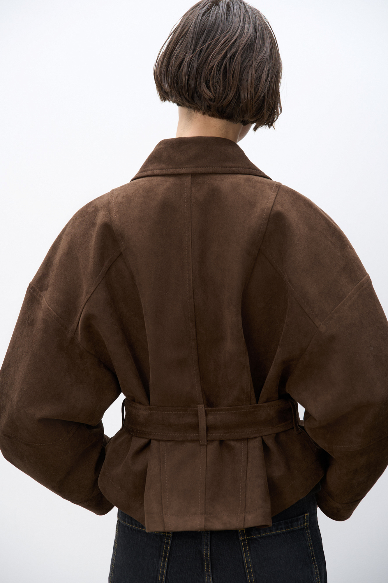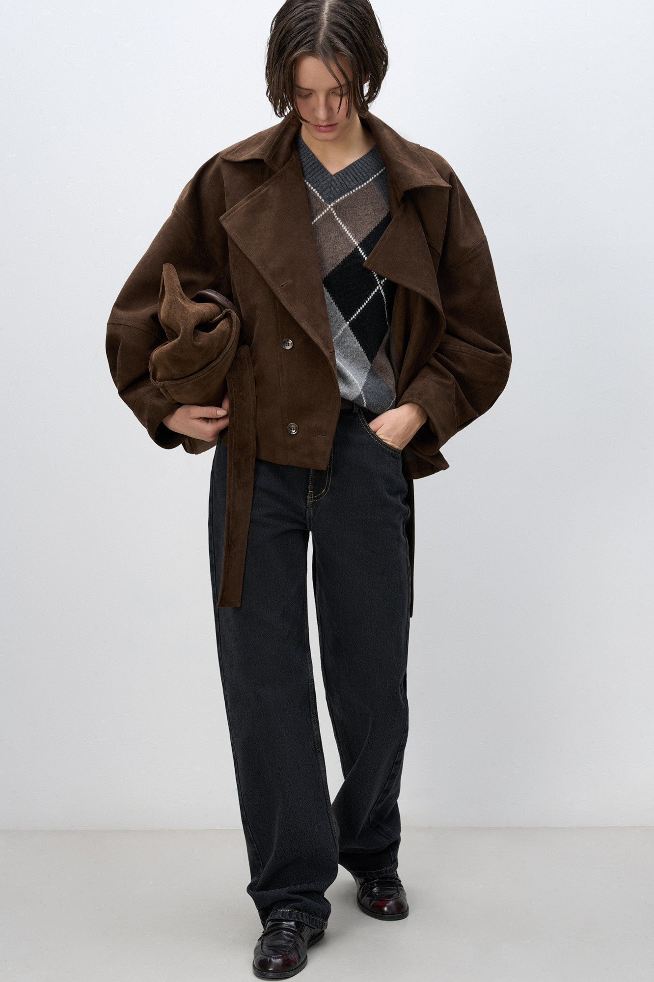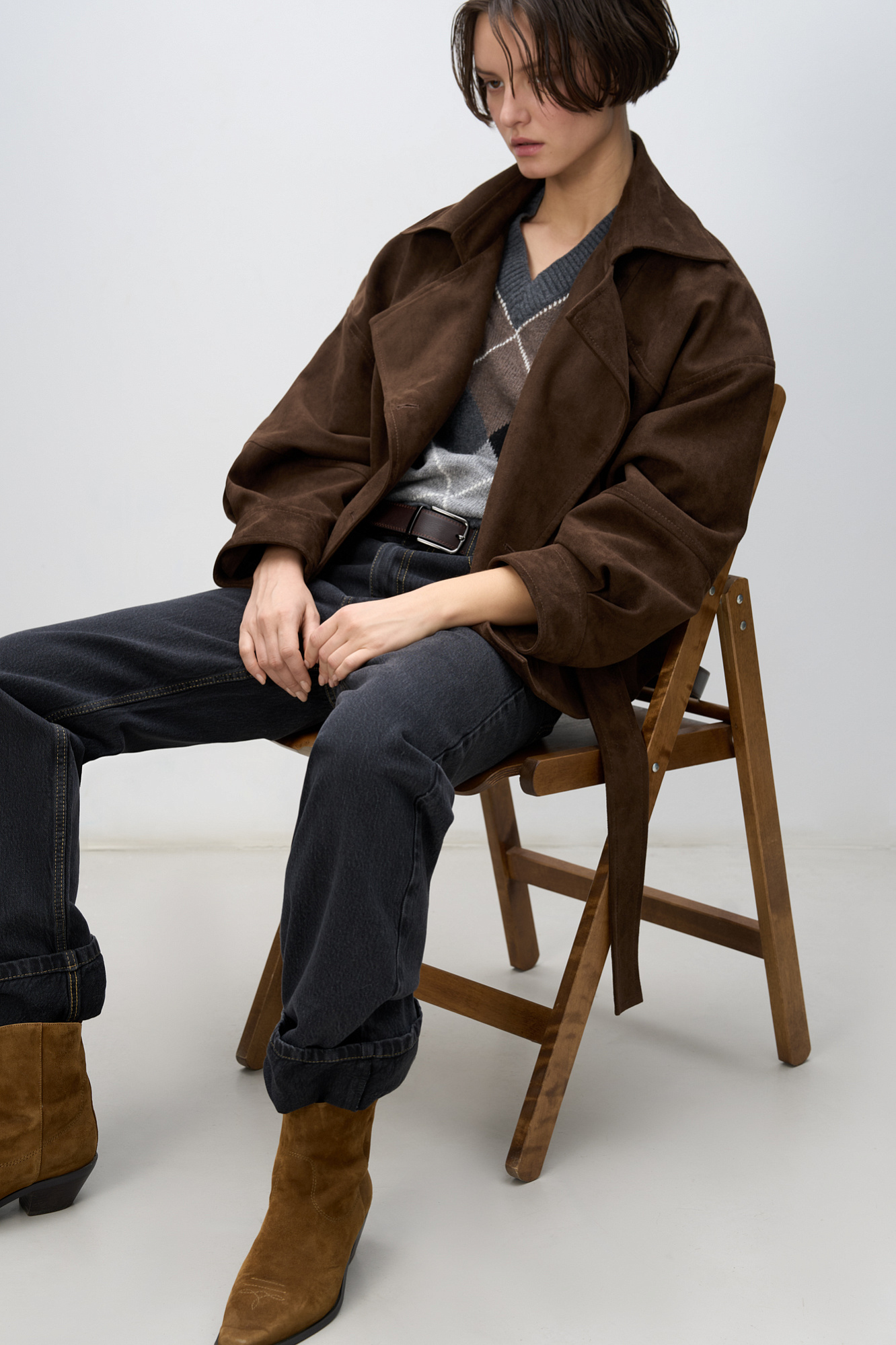 Двубортный короткий тренч сложной геометрии, выполненный из ткани с имитацией внешнего вида и свойств натуральной замши. Модель с отложным воротником, свободными рукавами со спущенной линией плеч, шлевками на поясе и ремнем.