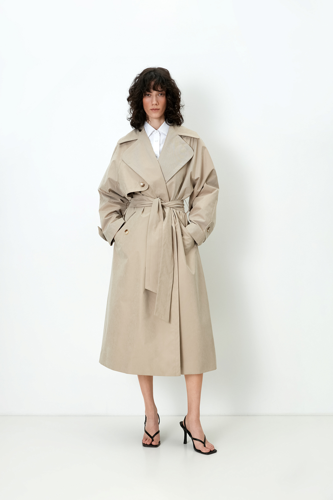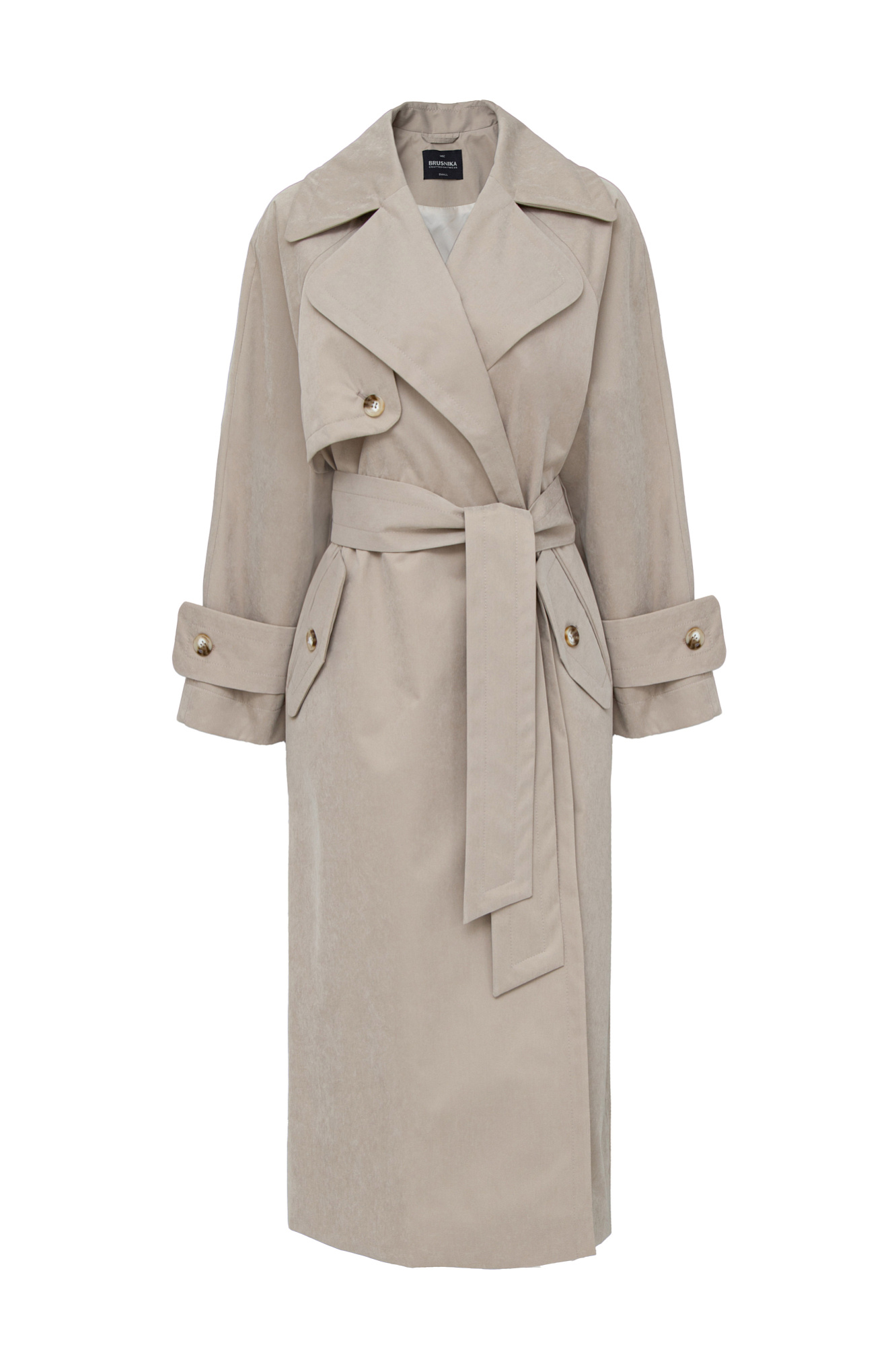 Плащ выполнен из водоотталкивающего текстиля на запах. Модель свободного кроя дополнена поясом в тон, длинные рукава с хлястиками. Дополнить образ можно рубашкой и шортами.