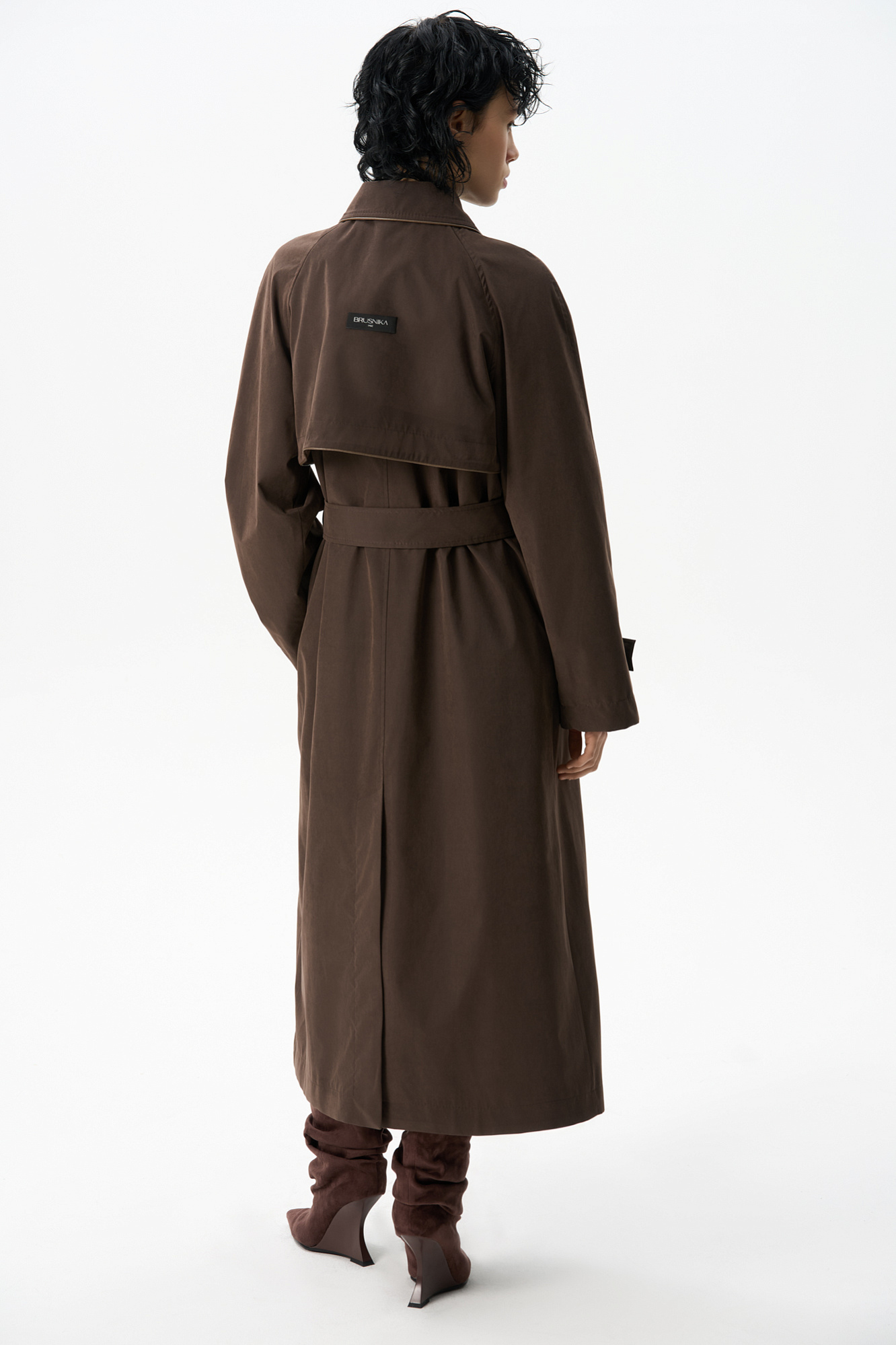 Двубортный длинный тренч прямого кроя. Модель с отложным воротником, декорированным металлической перемычкой, отлетной кокеткой, патами с пуговицами на манжетах, карманами и шлевками на талии для пояса.