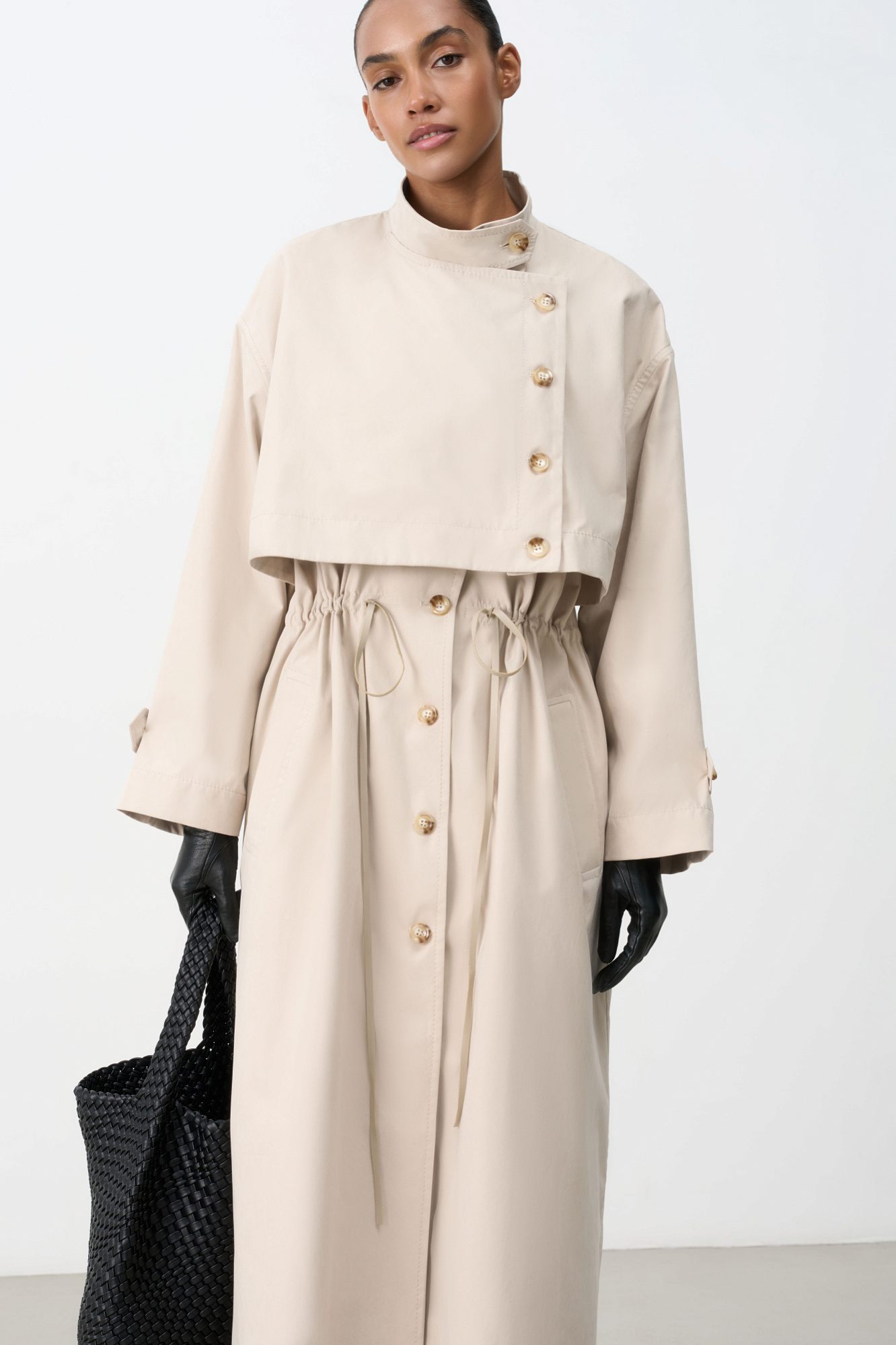 Однобортный тренч с асимметричной отлетной кокеткой. Модель свободного кроя, с воротником-стойкой, патами на манжетах и боковыми карманами. Акцент на талию с помощью регулируемой кулиски. Изделие без подкладки. Застежка на пуговицы.