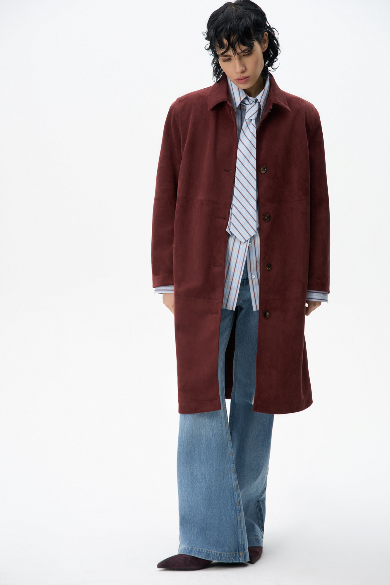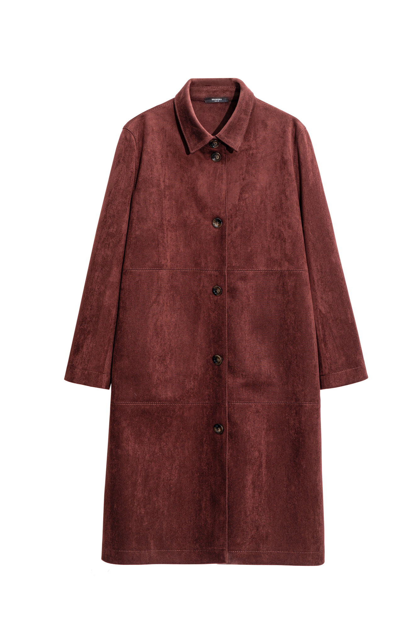 Тренч из ткани с имитацией внешнего вида и свойств натуральной замши. Модель прямого кроя с отложным воротником. Застежка на крупные пуговицы.