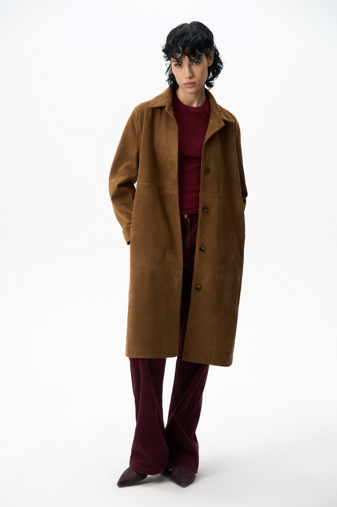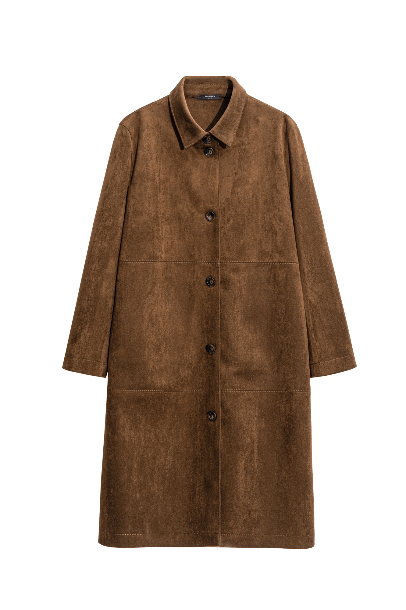 Тренч из ткани с имитацией внешнего вида и свойств натуральной замши. Модель прямого кроя с отложным воротником. Застежка на крупные пуговицы.