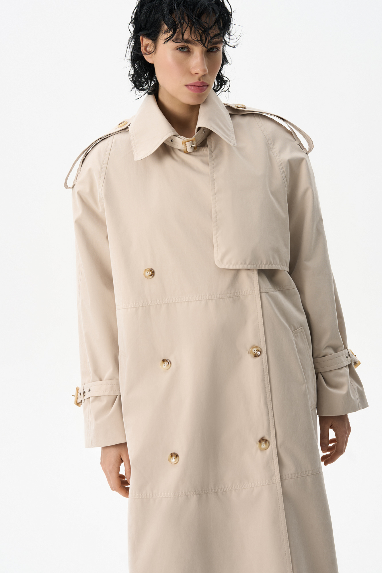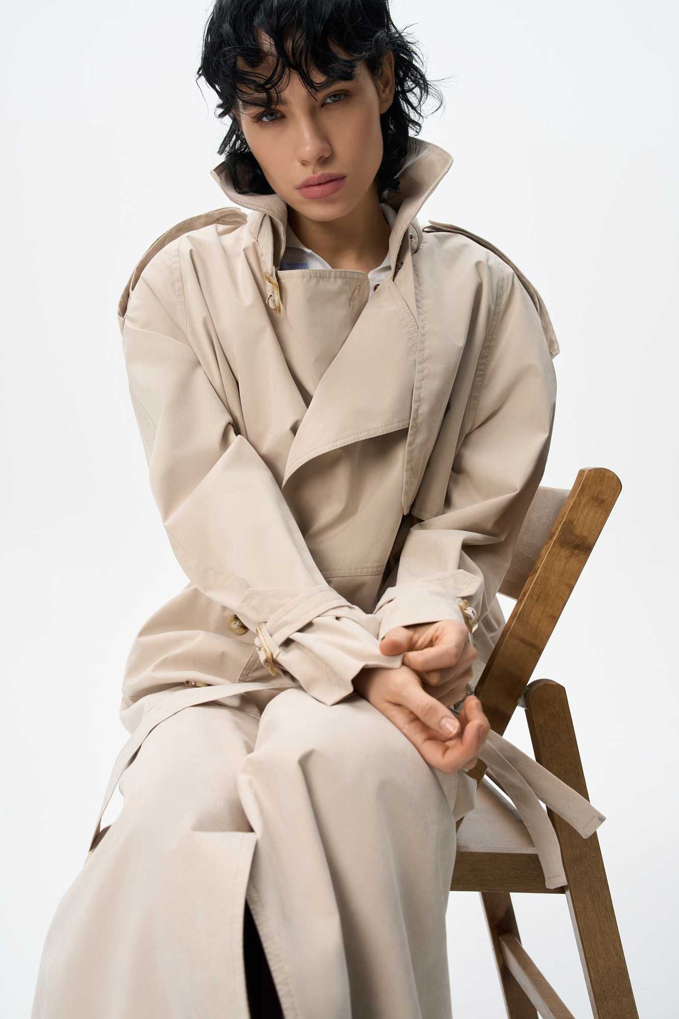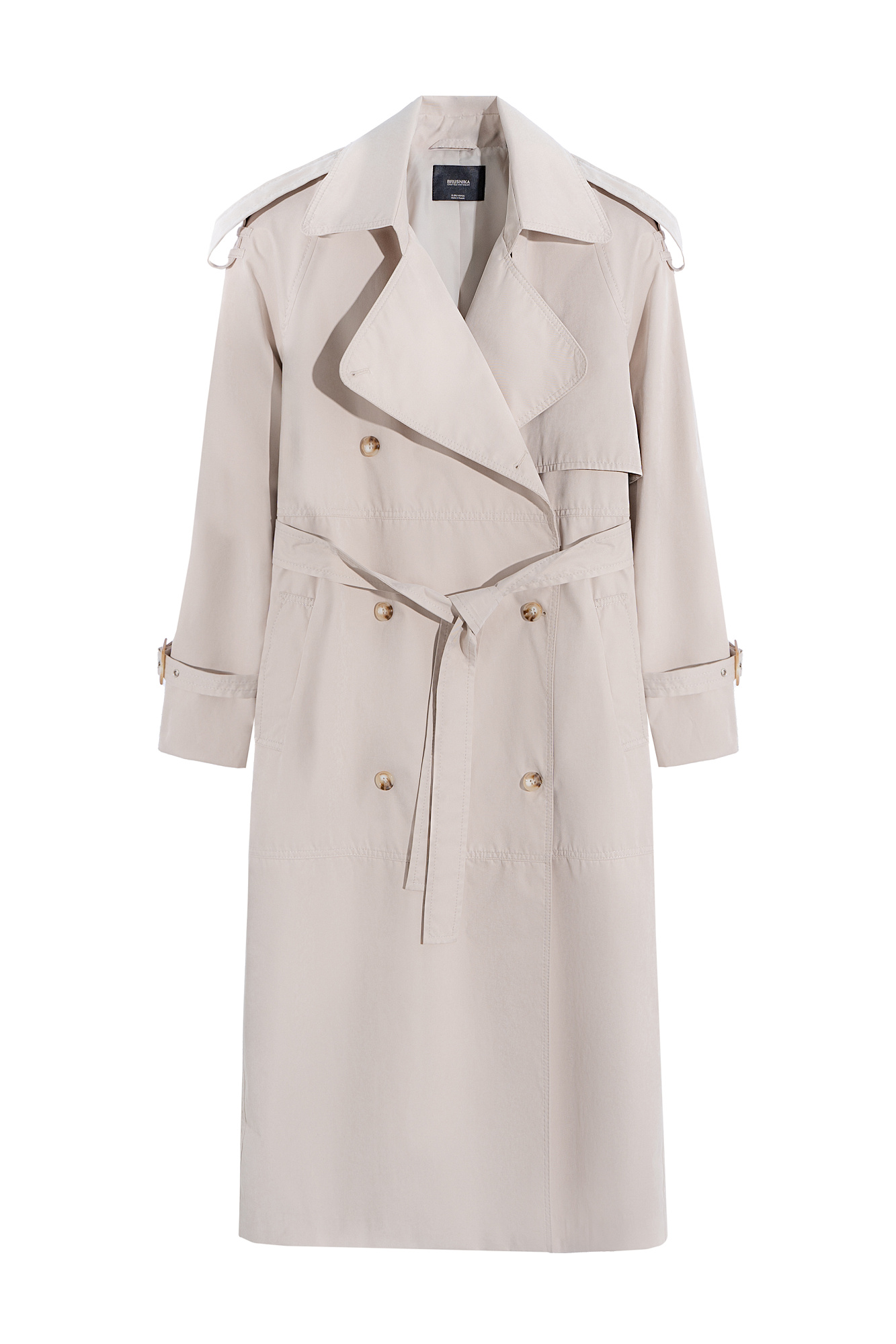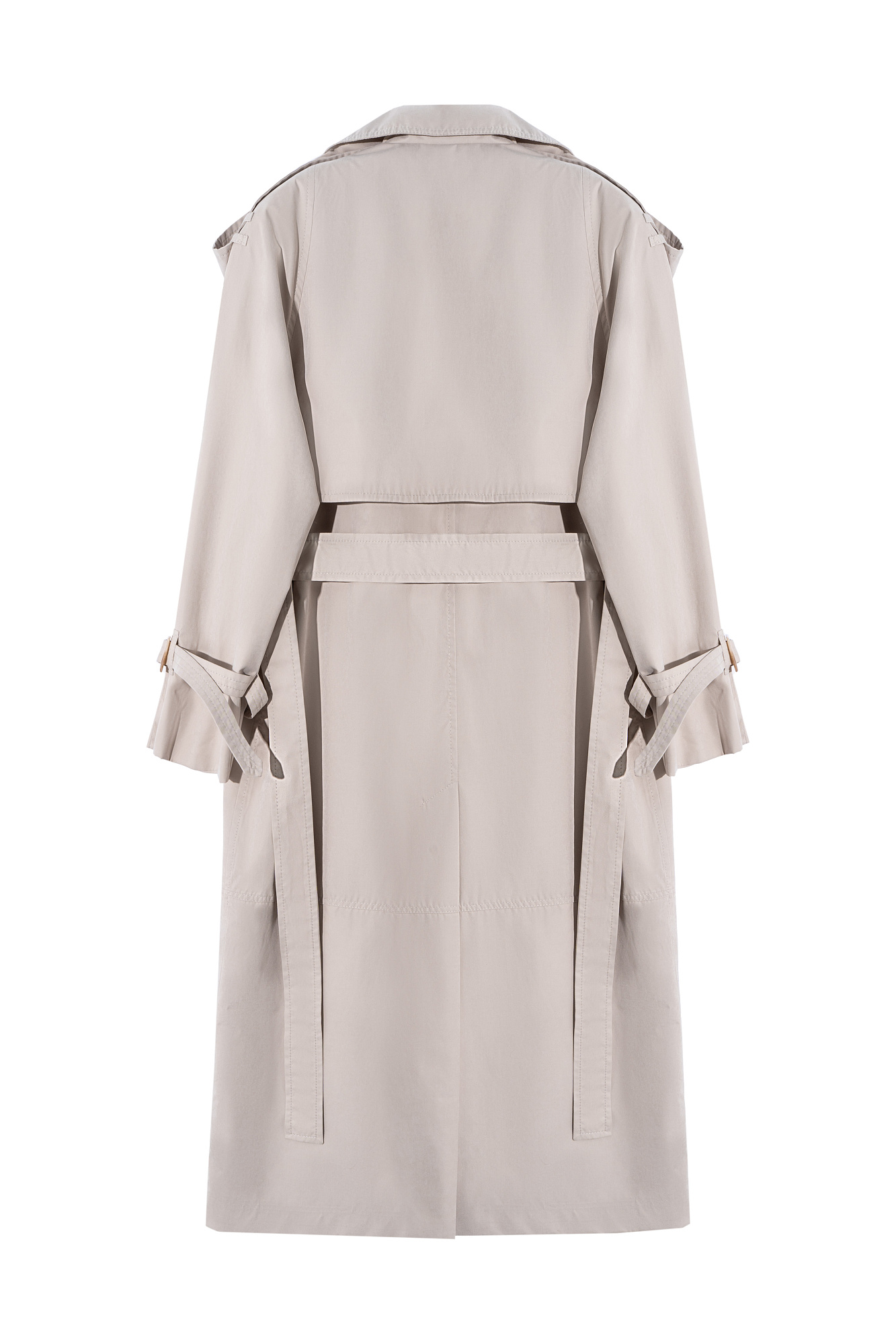 Двубортный тренч с подплечниками. Модель прямого свободного кроя с широкими лацканами и кокеткой. Изделие декорировано патами на плечах и манжетах рукавов. Шлевки на талии для пояса. Изделие выполнено на подкладке.