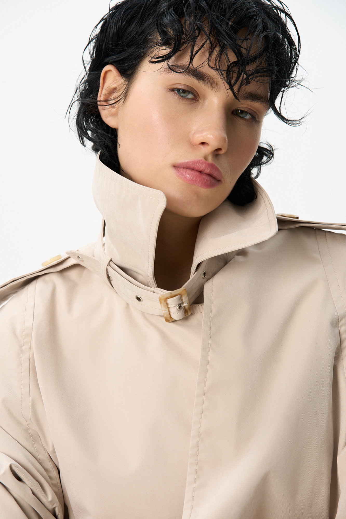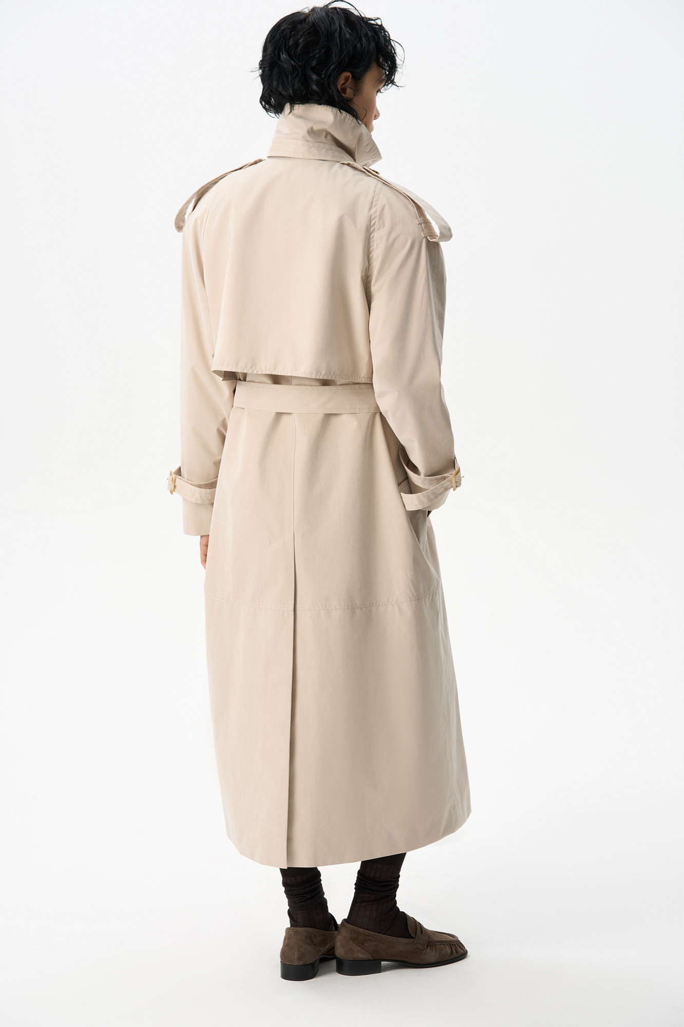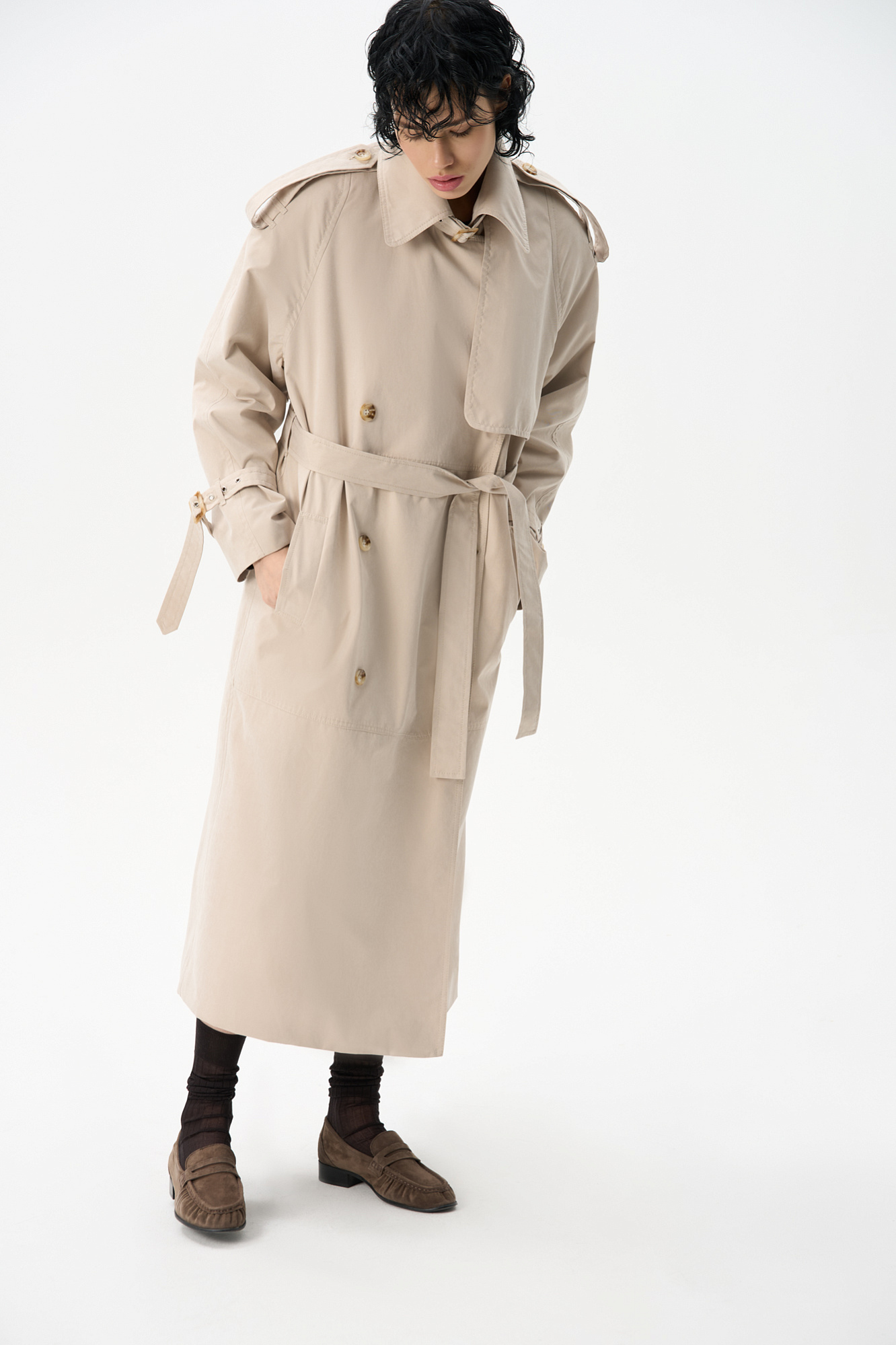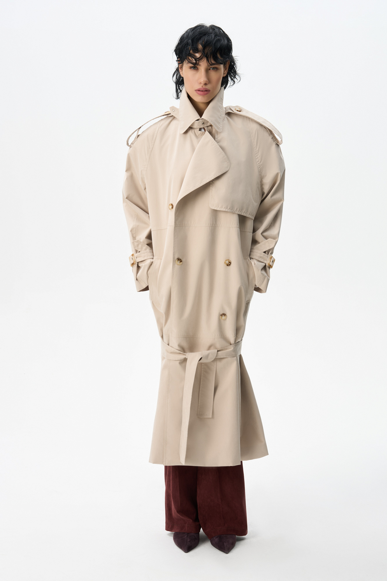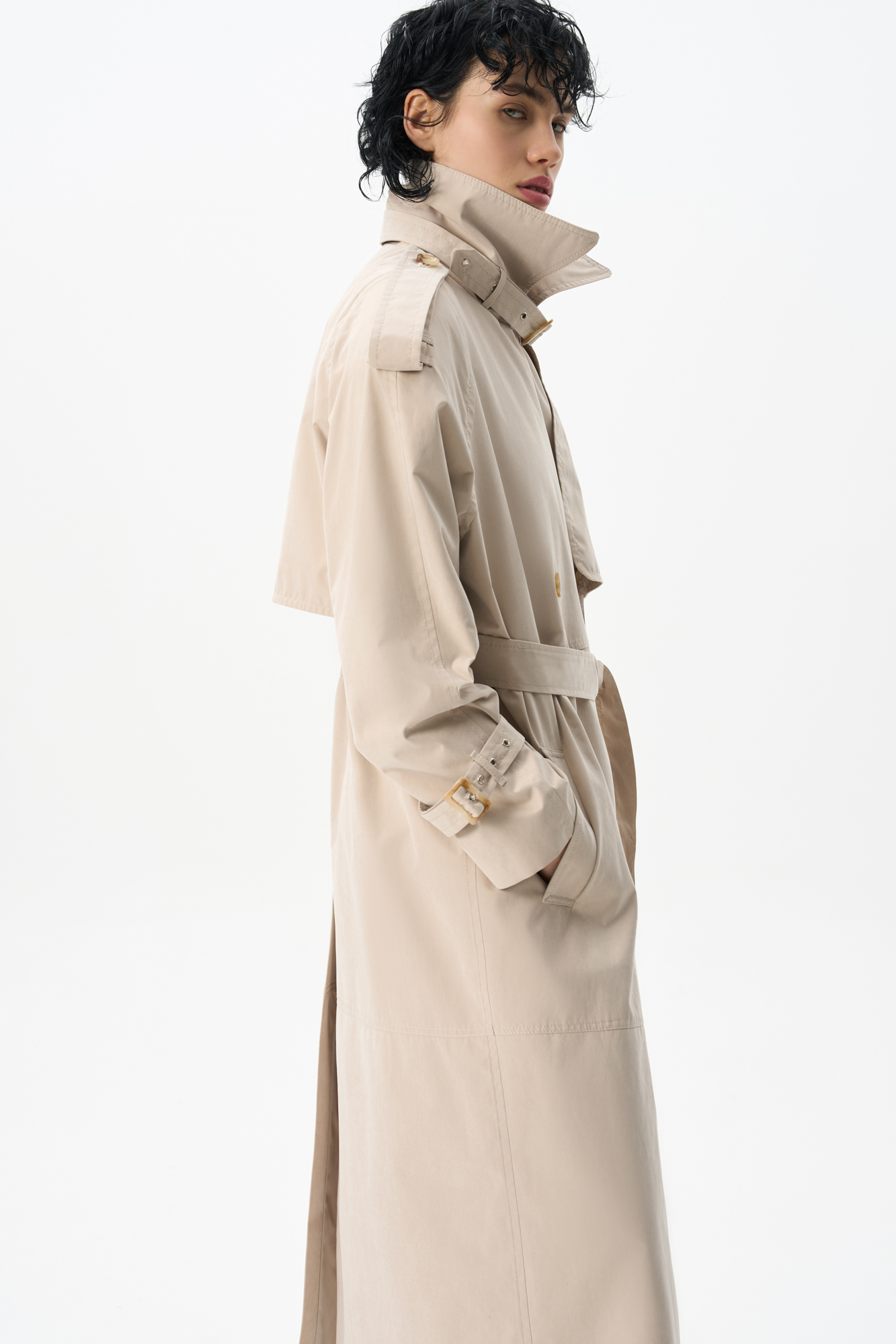 Двубортный тренч с подплечниками. Модель прямого свободного кроя с широкими лацканами и кокеткой. Изделие декорировано патами на плечах и манжетах рукавов. Шлевки на талии для пояса. Изделие выполнено на подкладке.