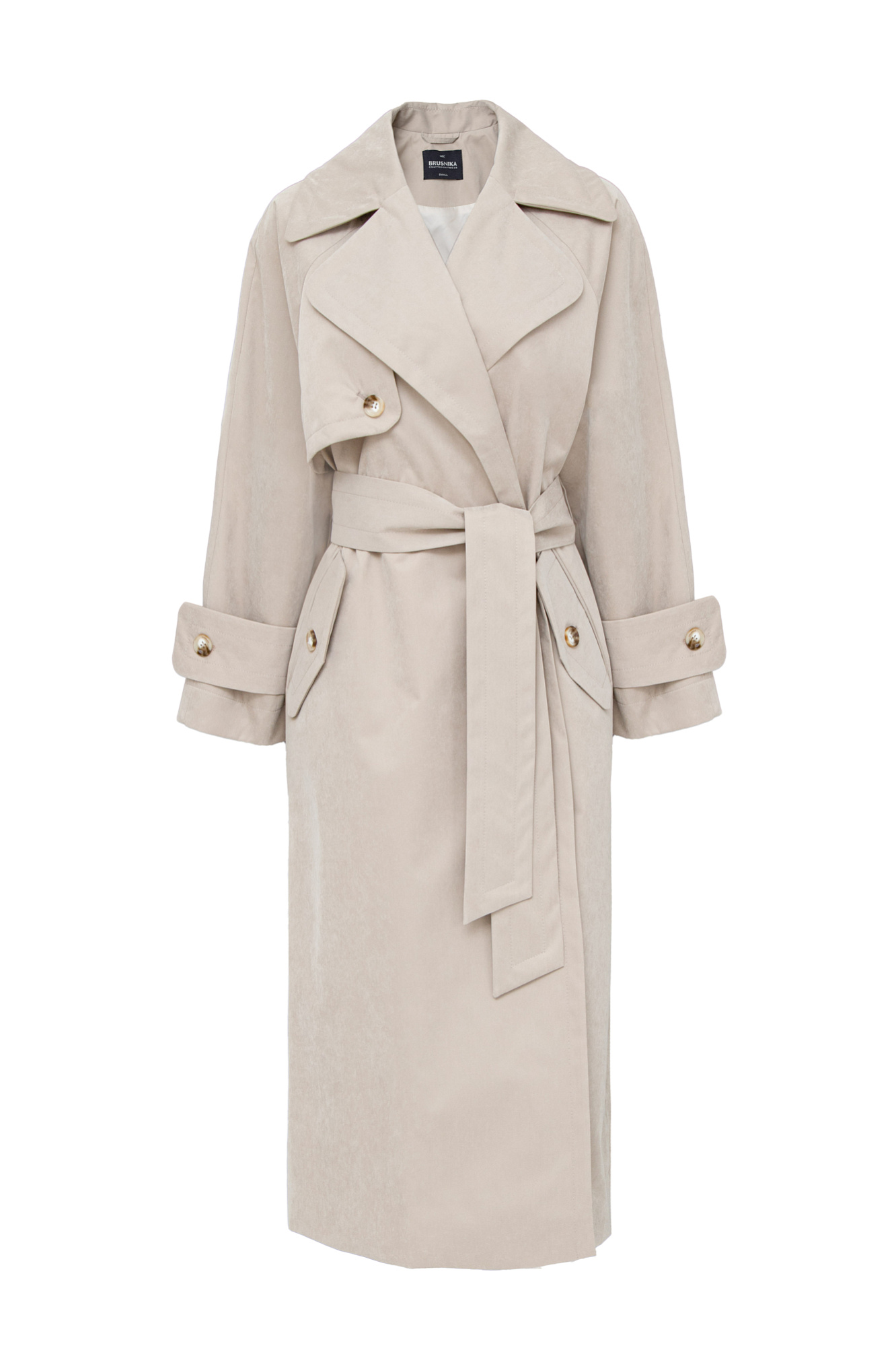 Плащ выполнен из водоотталкивающего текстиля на запах. Модель свободного кроя дополнена поясом в тон, длинные рукава с хлястиками.