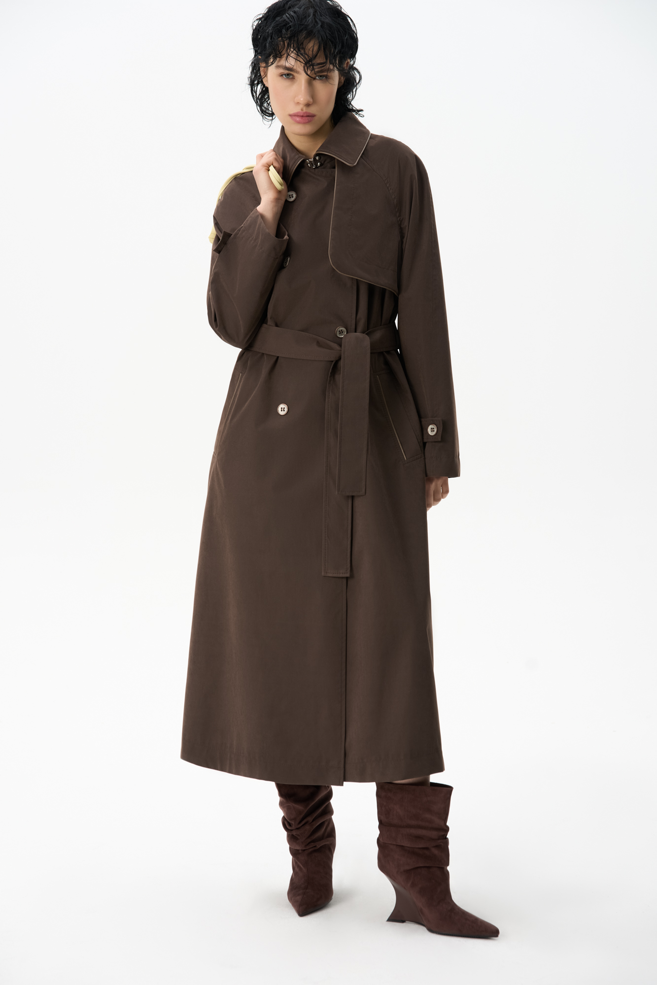 Двубортный длинный тренч прямого кроя. Модель с отложным воротником, декорированным металлической перемычкой, отлетной кокеткой, патами с пуговицами на манжетах, карманами и шлевками на талии для пояса.