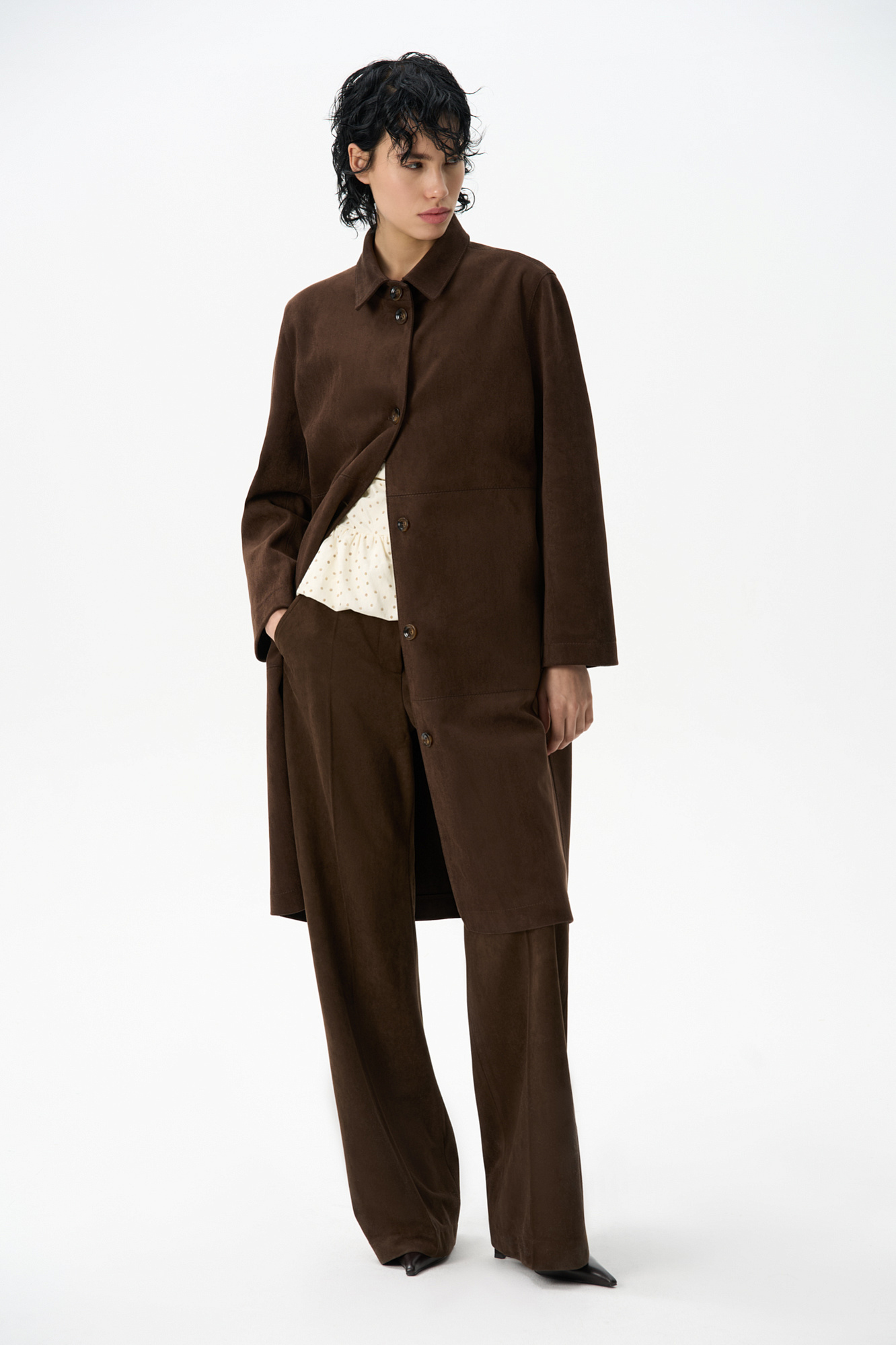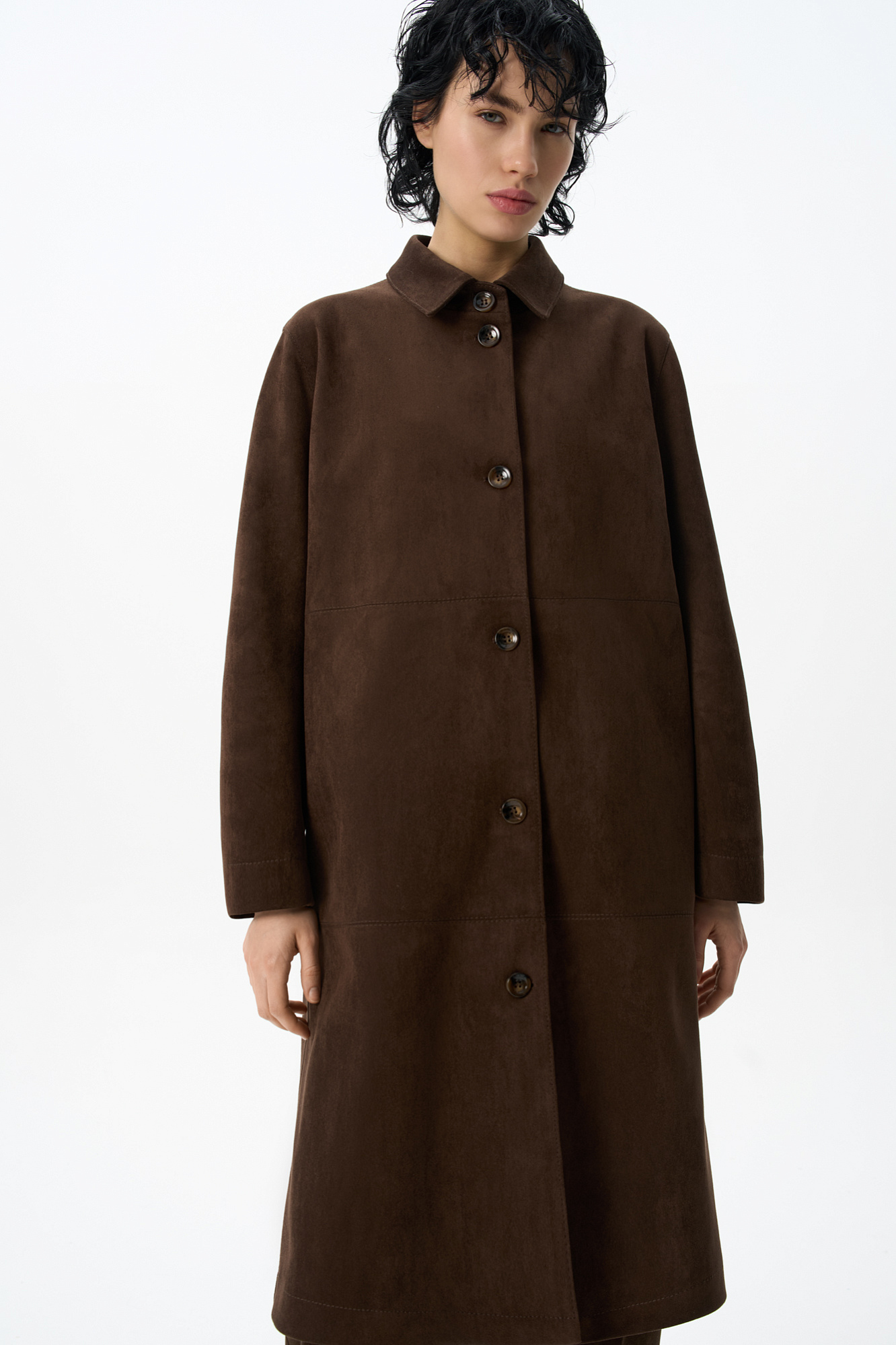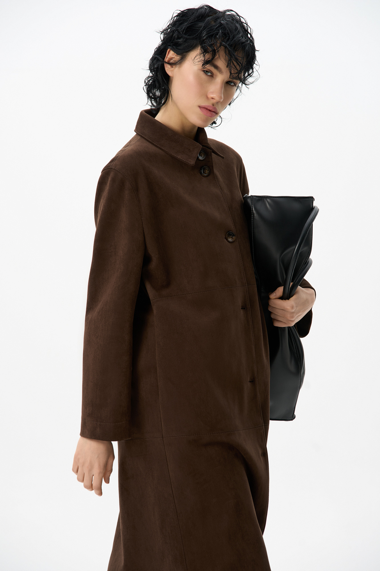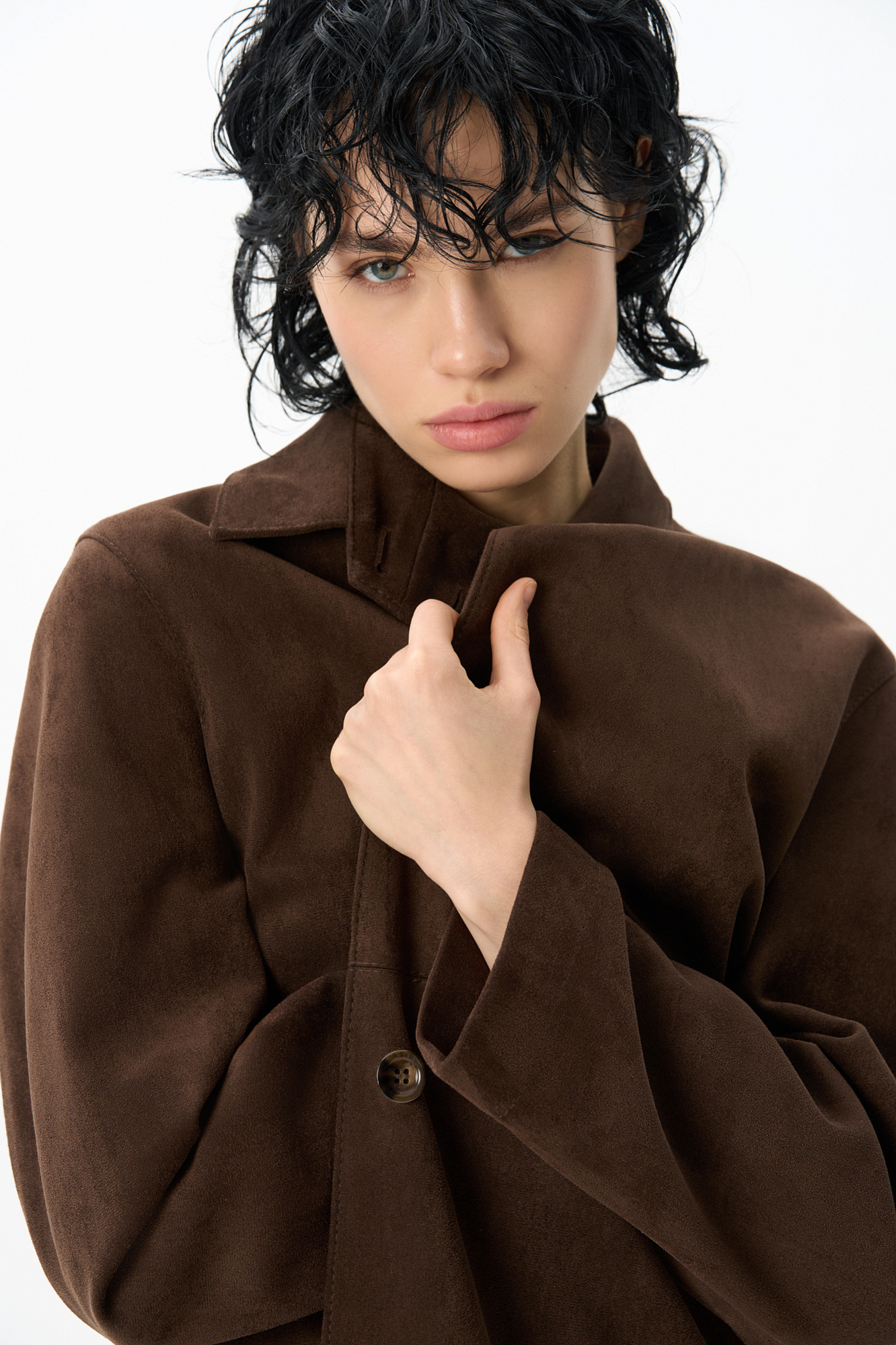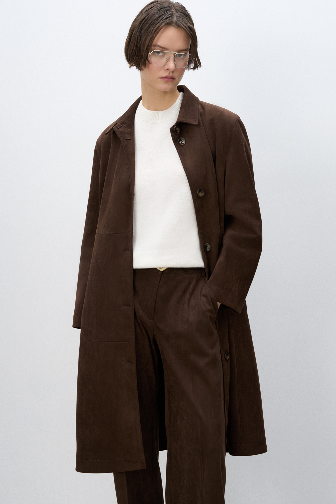 Тренч из ткани с имитацией внешнего вида и свойств натуральной замши. Модель прямого кроя с отложным воротником. Застежка на крупные пуговицы.