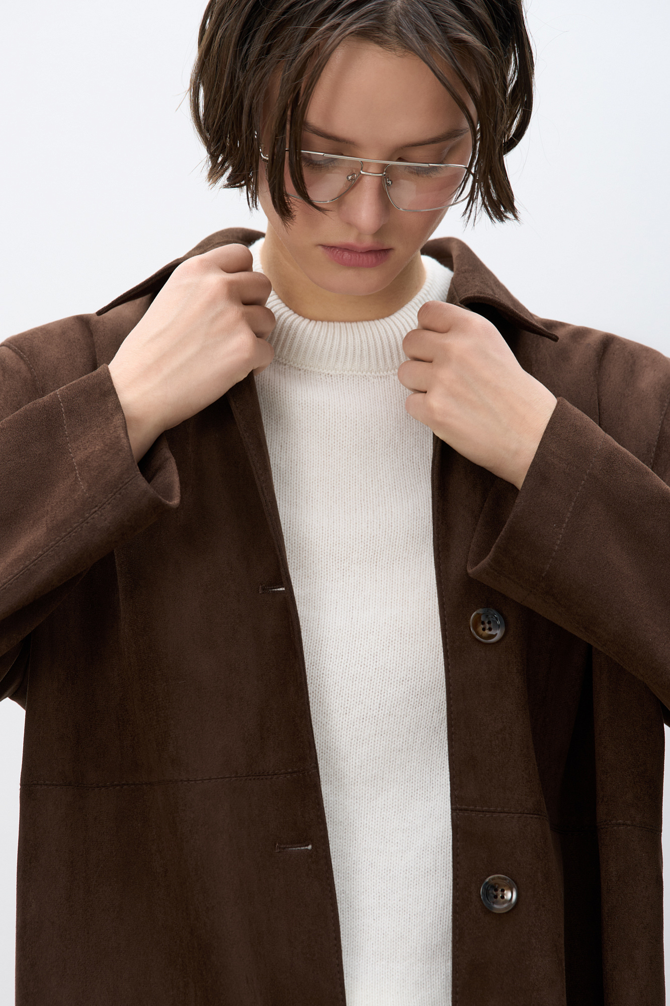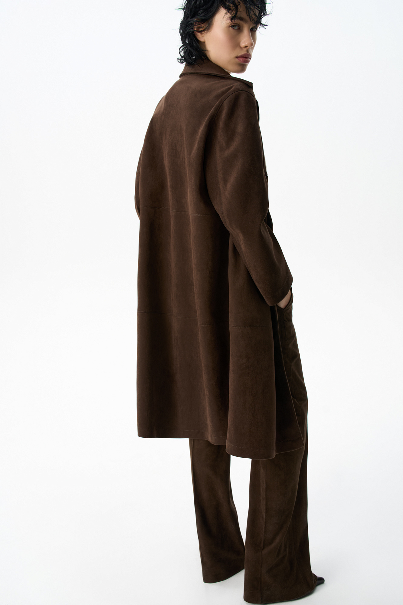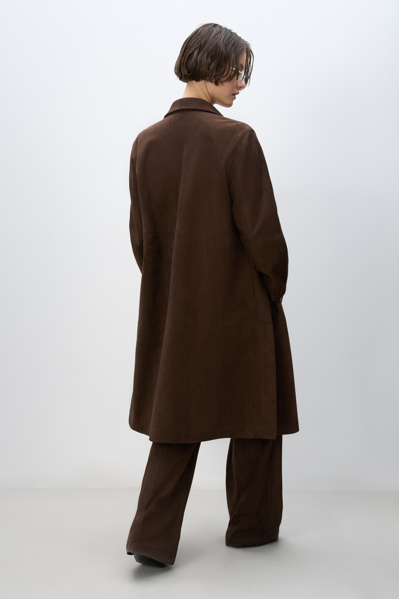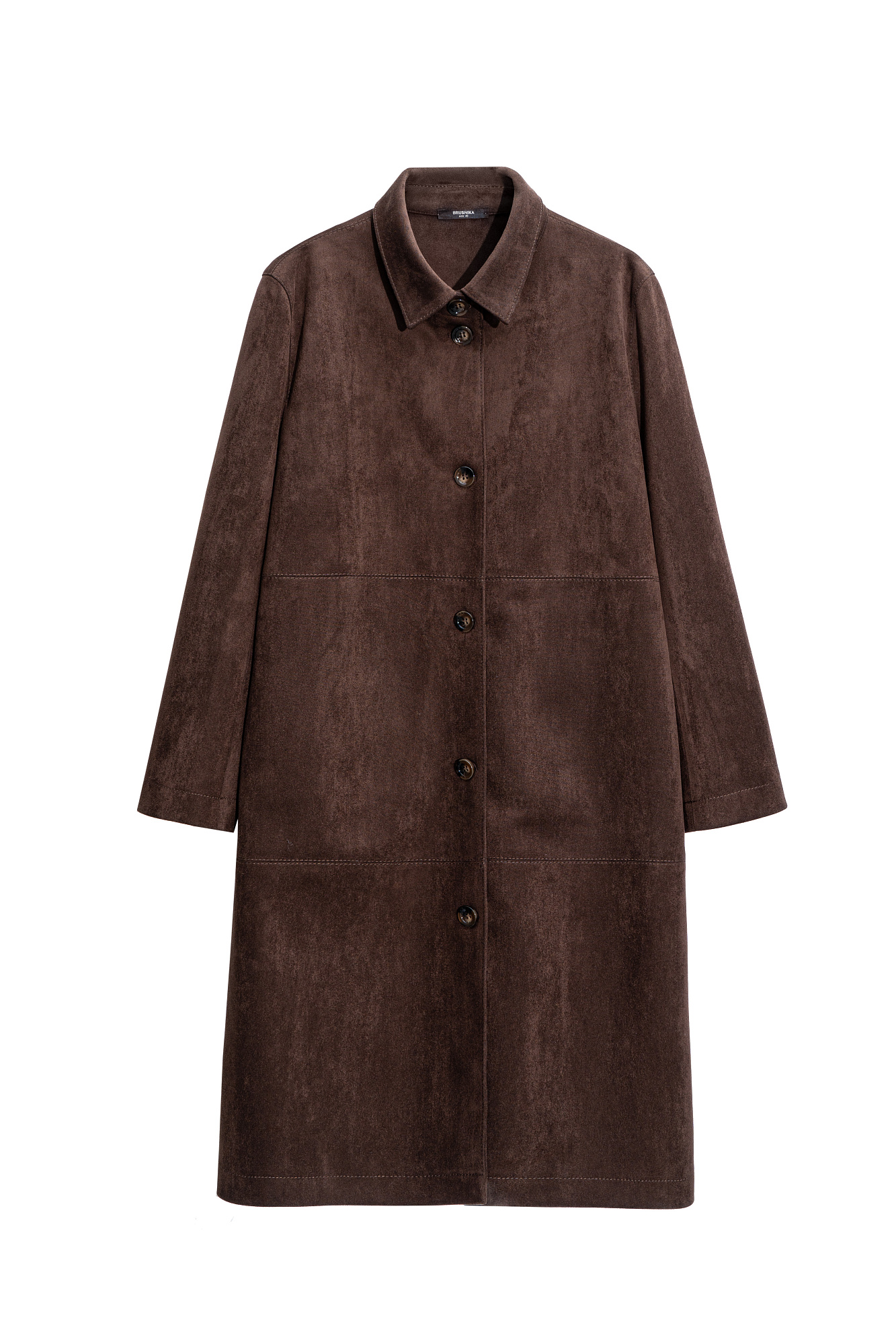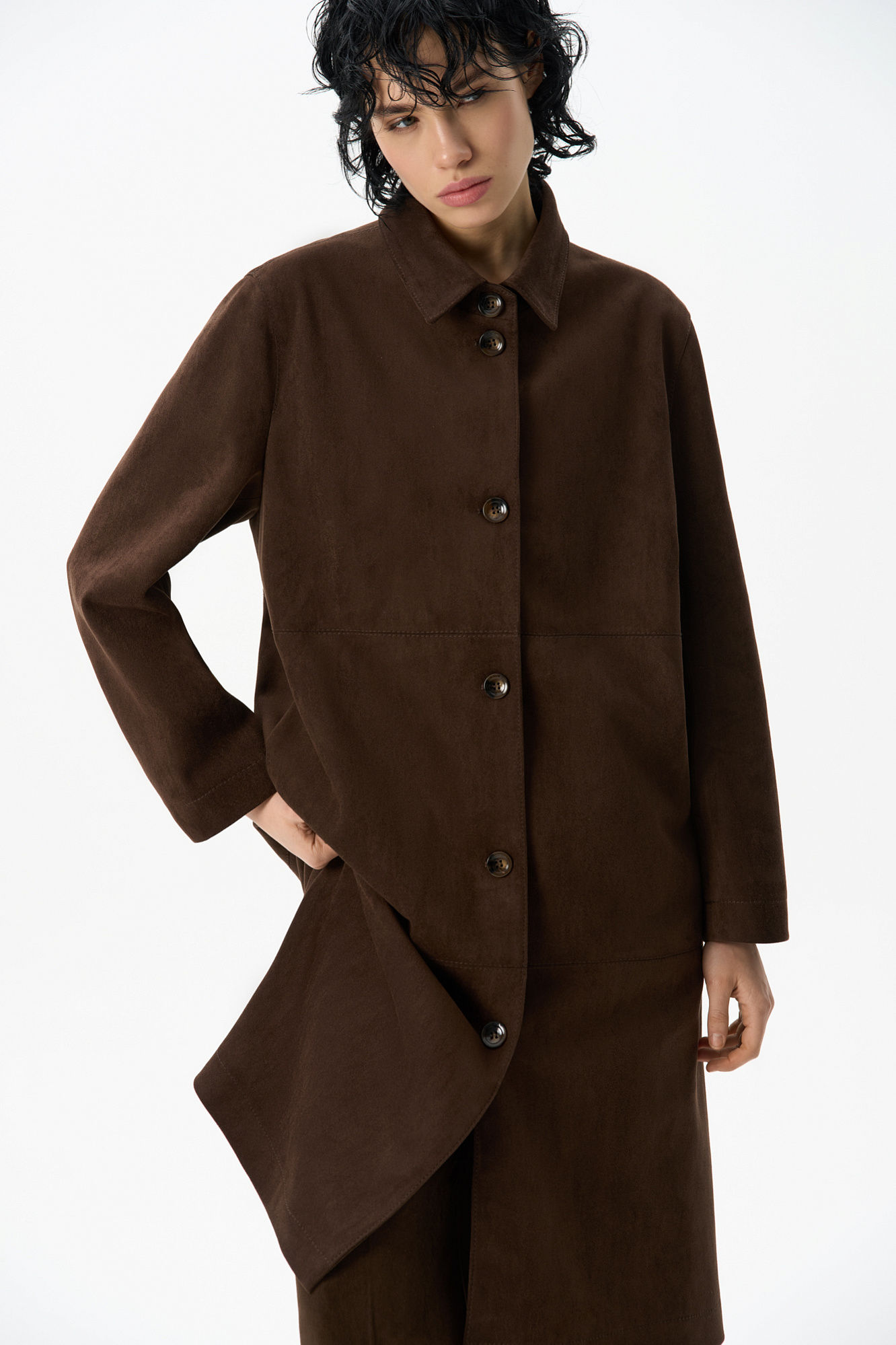 Тренч из ткани с имитацией внешнего вида и свойств натуральной замши. Модель прямого кроя с отложным воротником. Застежка на крупные пуговицы.