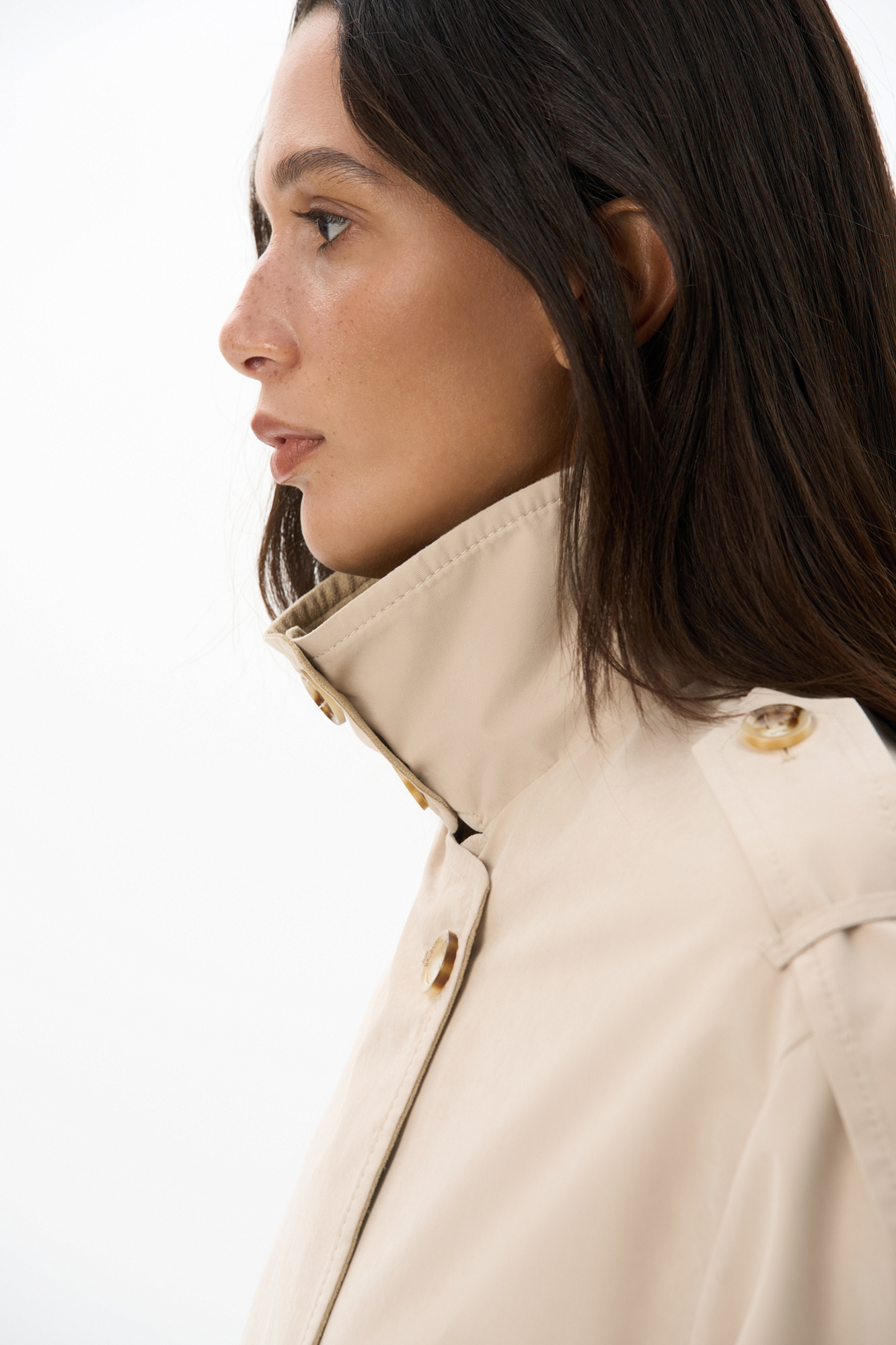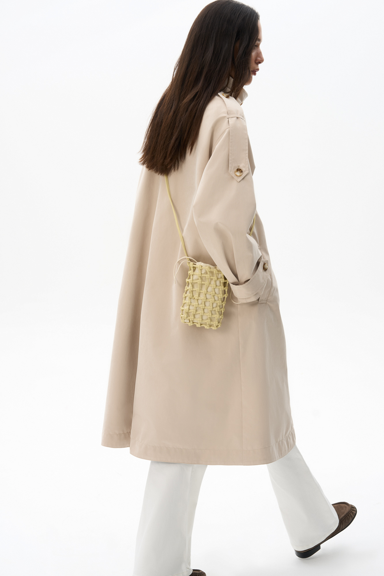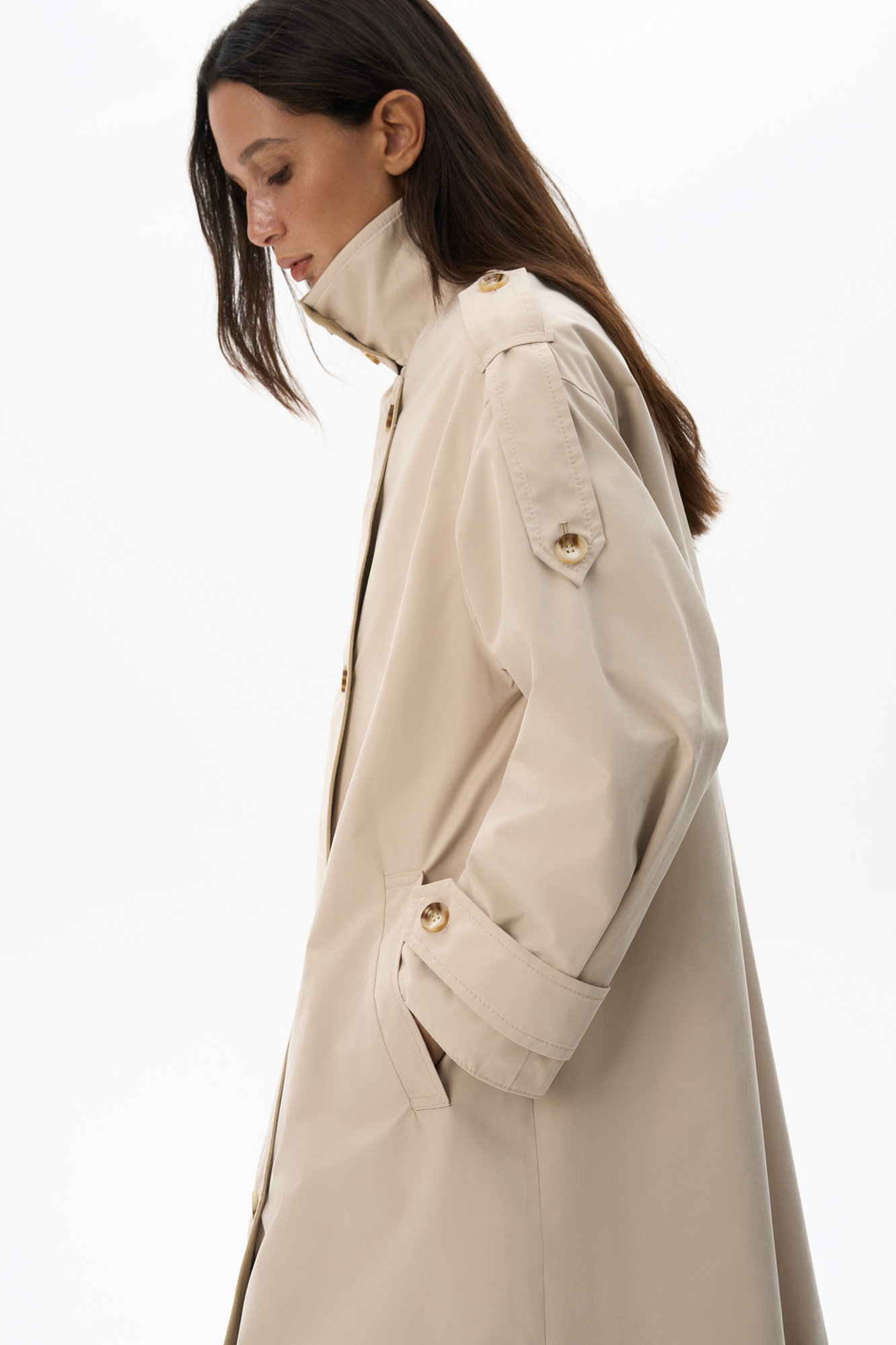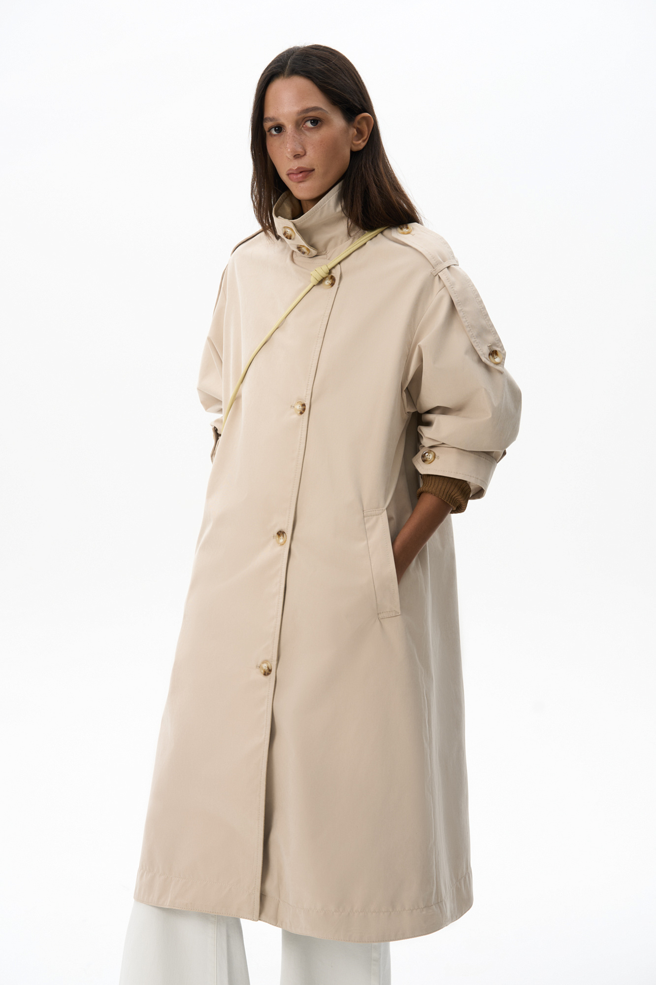 Двусторонний однобортный тренч с воротником-стойкой. Модель формы трапеция свободного кроя, глубокими карманами, патами на плечах и манжетах рукавов. Застежка на пуговицы. Одна сторона выполнена из гладкой плащевой ткани, вторая - из принтованной ткани в клетку с отделкой лацконов и планки под замшу.