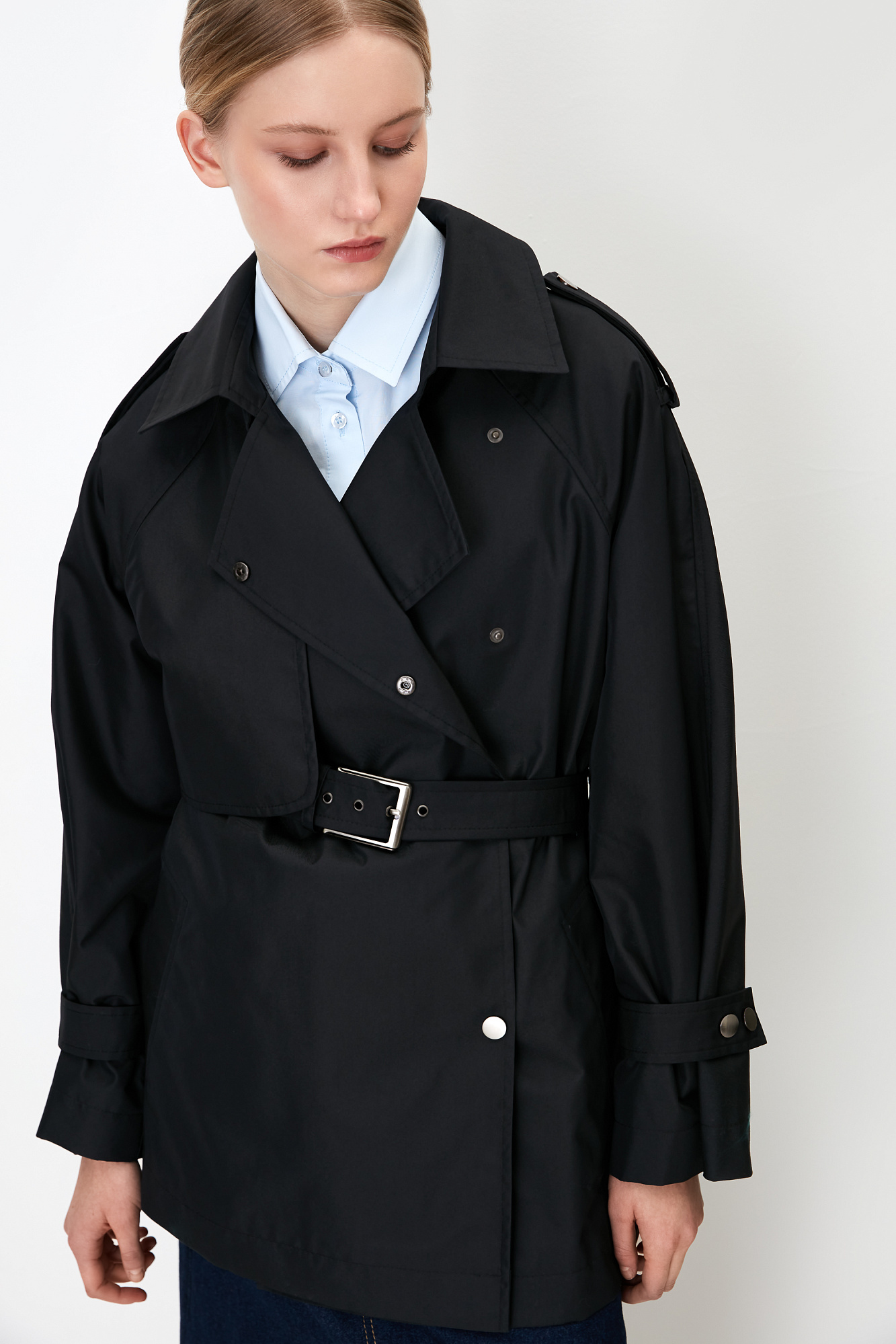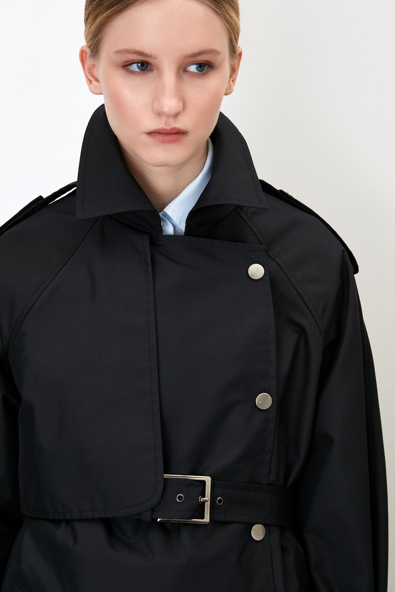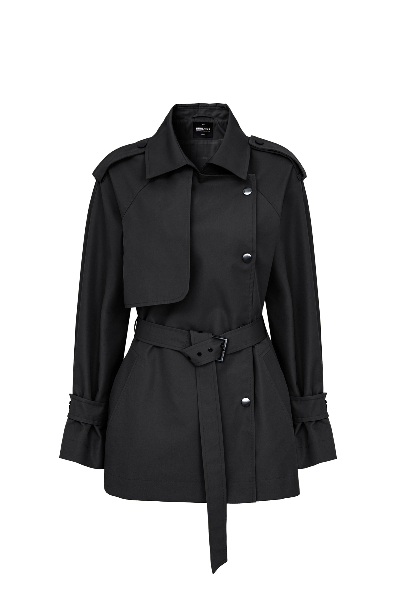 Укороченный тренч с отложным воротником и широким запахом. Модель свободного кроя с поясом из основного материала, асимметричной отлетной кокеткой и боковыми карманами. Паты на манжетах и плечах. На подкладке. Застежка на пуговицы.