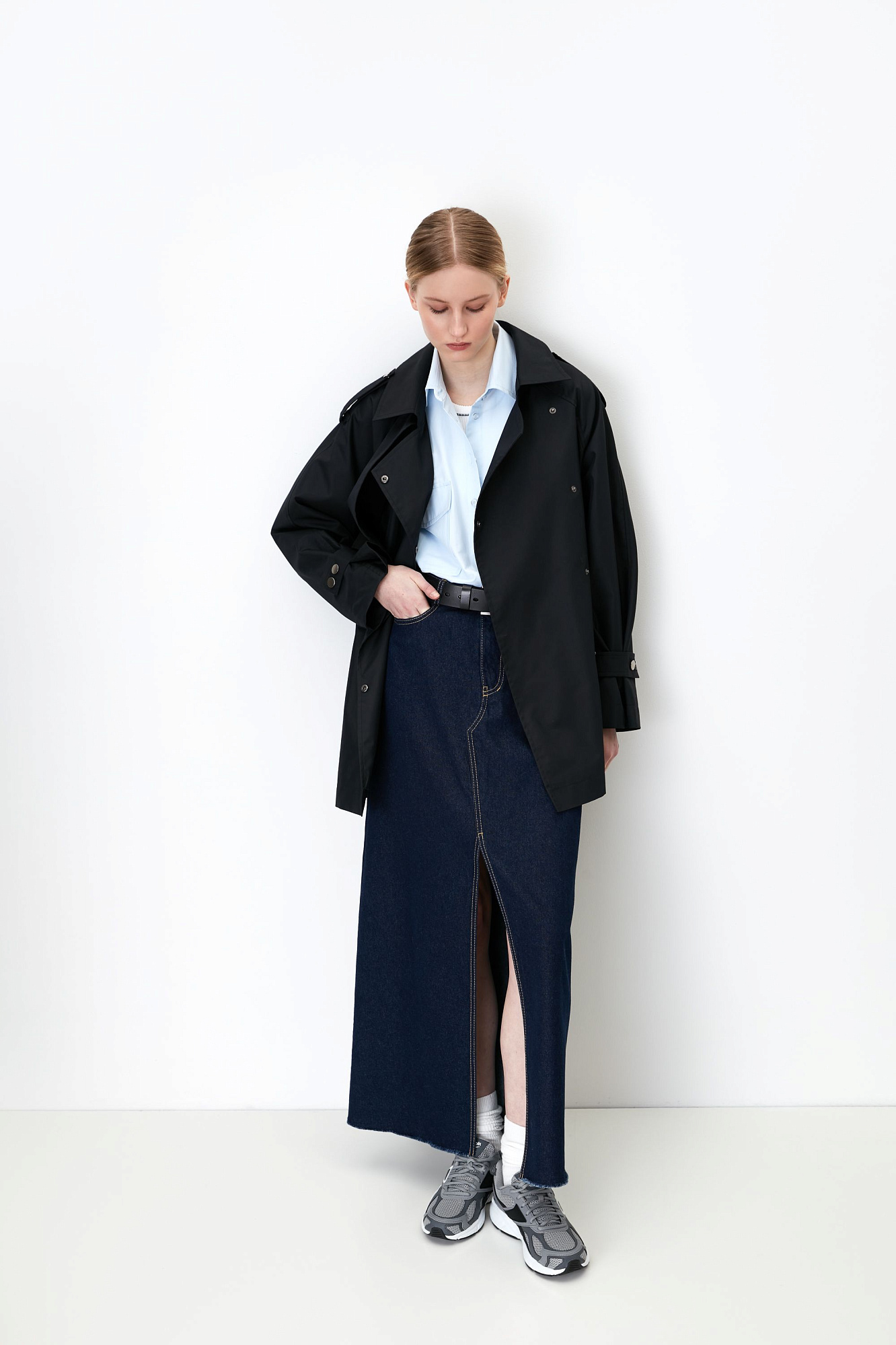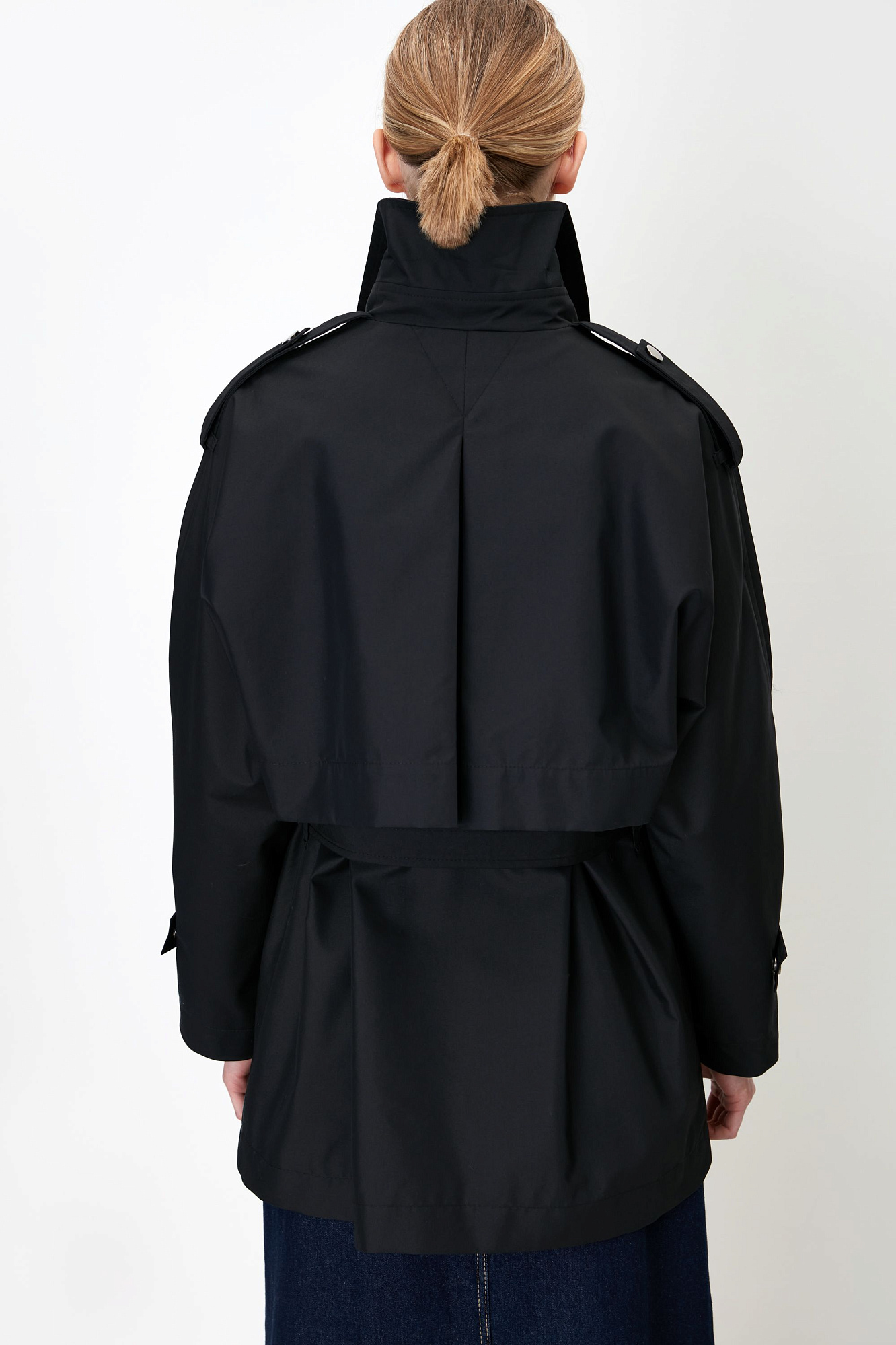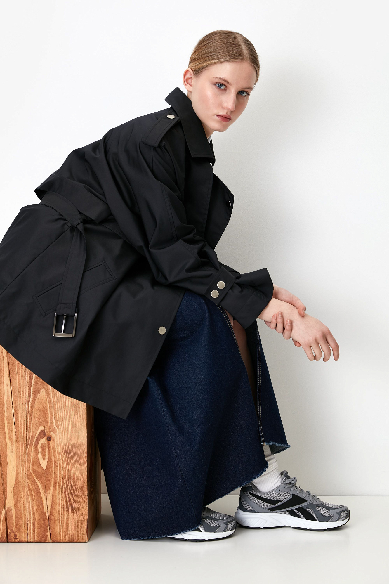 Укороченный тренч с отложным воротником и широким запахом. Модель свободного кроя с поясом из основного материала, асимметричной отлетной кокеткой и боковыми карманами. Паты на манжетах и плечах. На подкладке. Застежка на пуговицы.