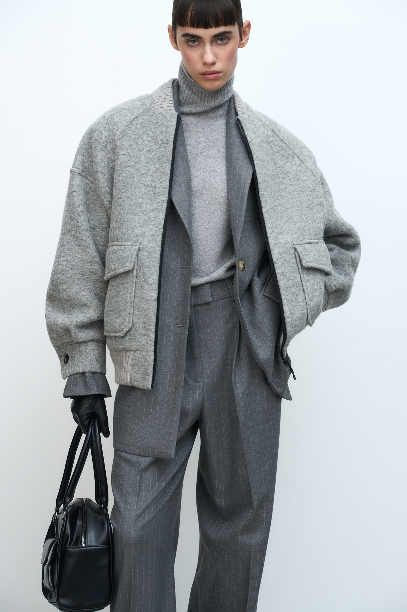 Свободный бомбер из валяной шерсти. Горловина и низ на резинке, манжеты застегиваются на пуговицы. Два передних кармана на клапанах. Застежка на молнию.