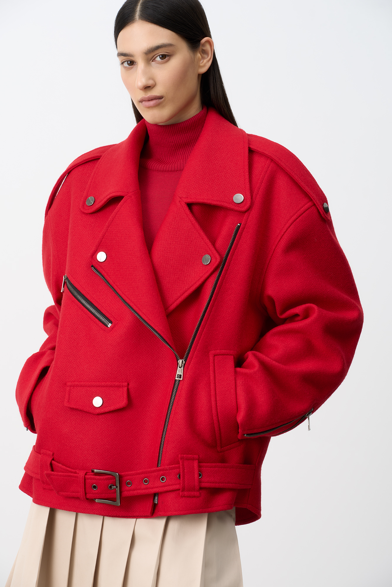 Жакет-косуха из смесовой шерсти. Модель свободного силуэта со спущенной линией плеч и косой застежкой. Изделие декорировано эполетами на плечах, широким поясом с пряжкой на талии, боковыми и нагрудным карманом. Изделие на подкладке.