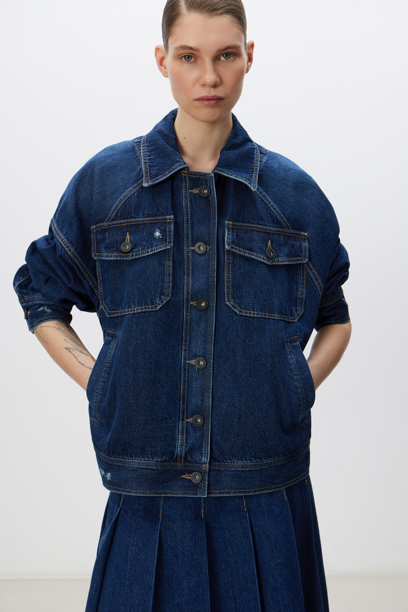 Джинсовый жакет из 100% хлопка. Модель прямого кроя с отложным воротником, боковыми и накладными карманами с клапанами на груди. Застежка на пуговицы. Изделие декорировано небольшими потертостями и брендированным ярлыком из экокожи на спине.