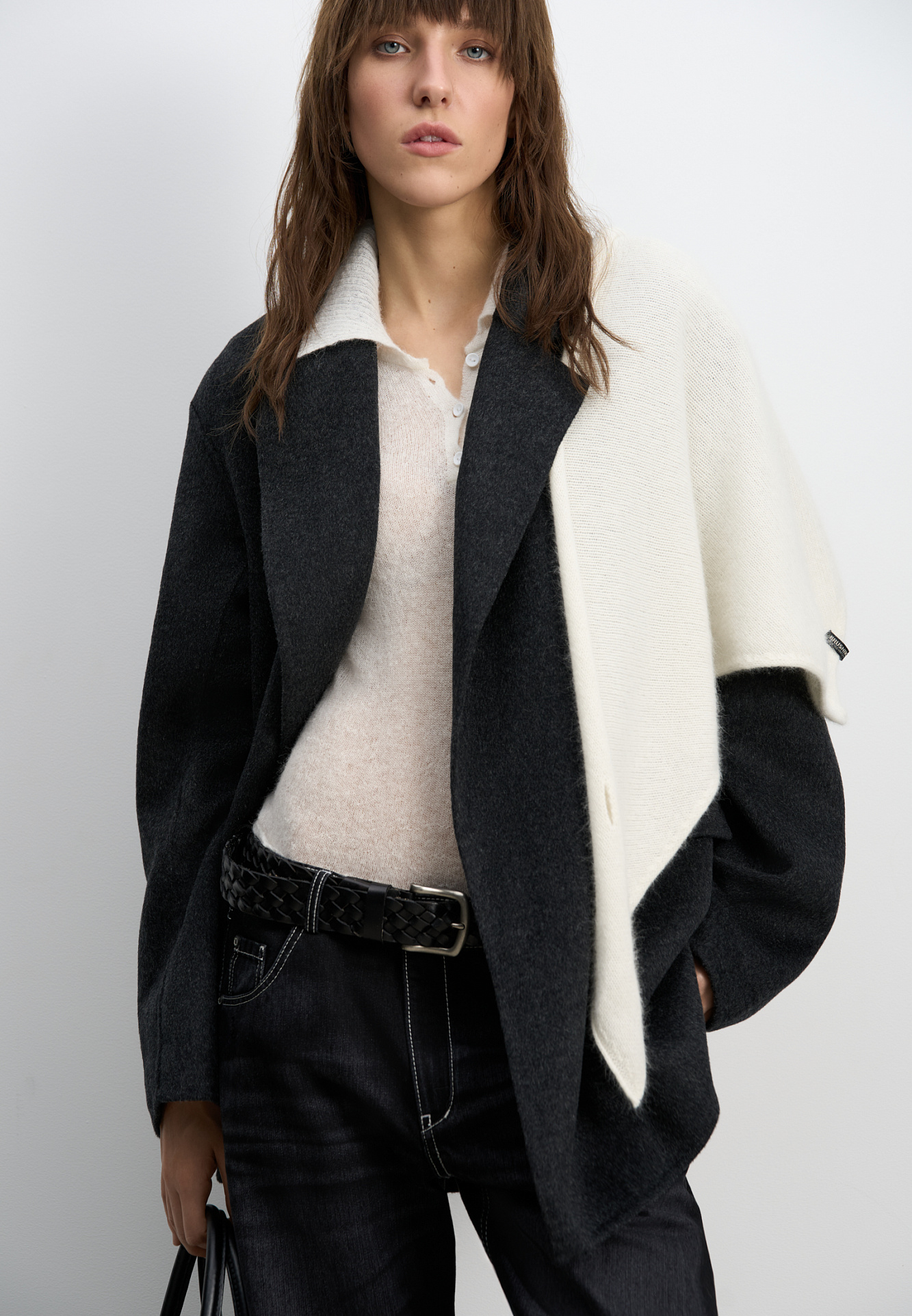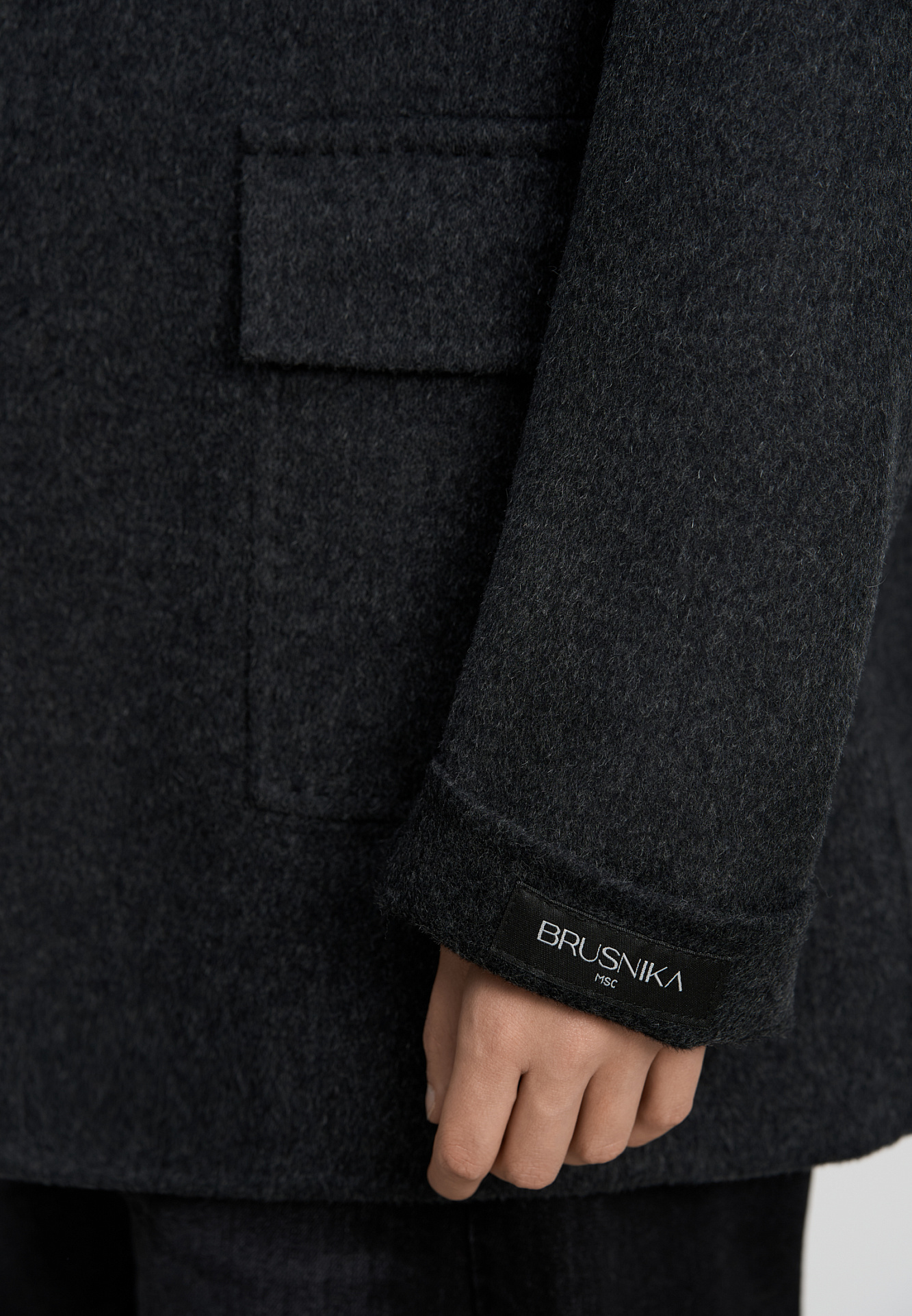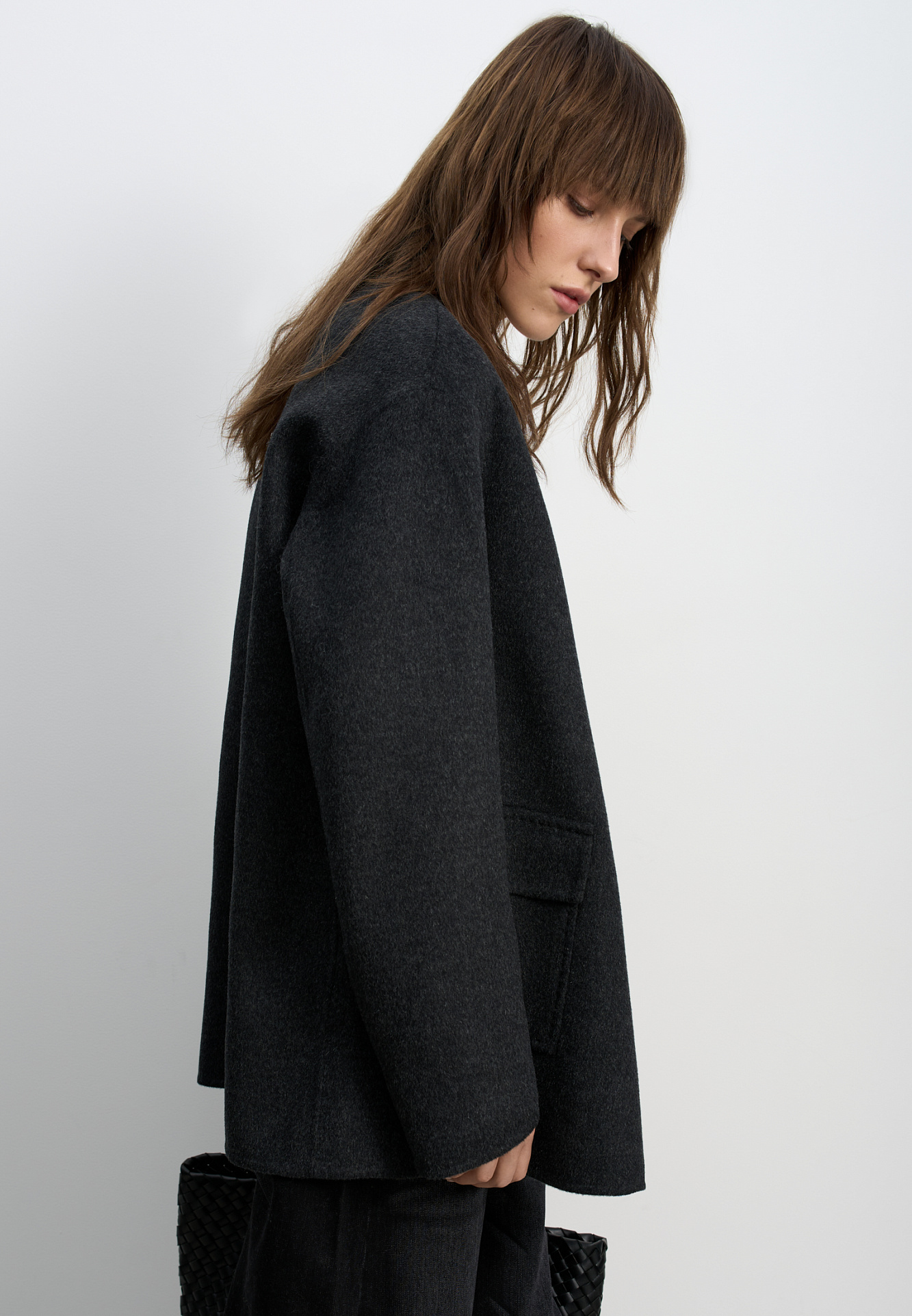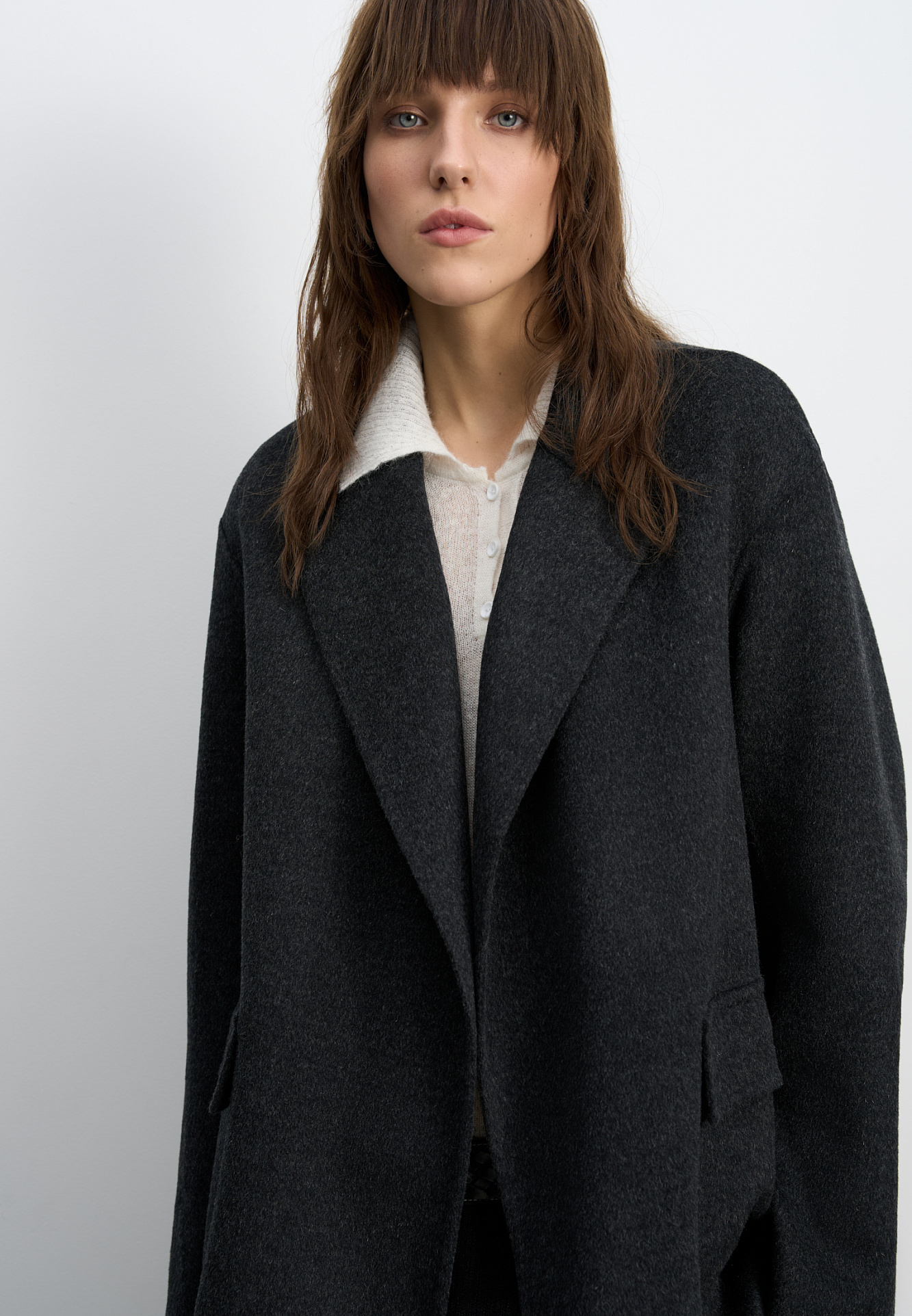 Жакет из двусторонней шерстной ткани на запах. Модель прямого кроя с отложным воротником и накладными карманами с клапанами. Изделие выполнено без подкладки. Тонкий пояс из экокожи в комплекте.