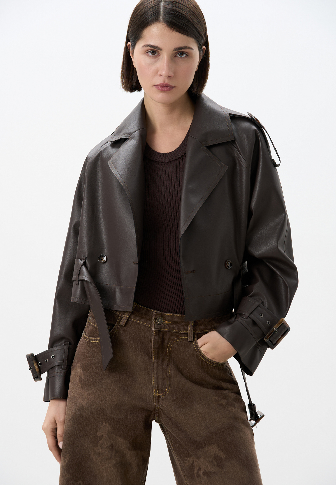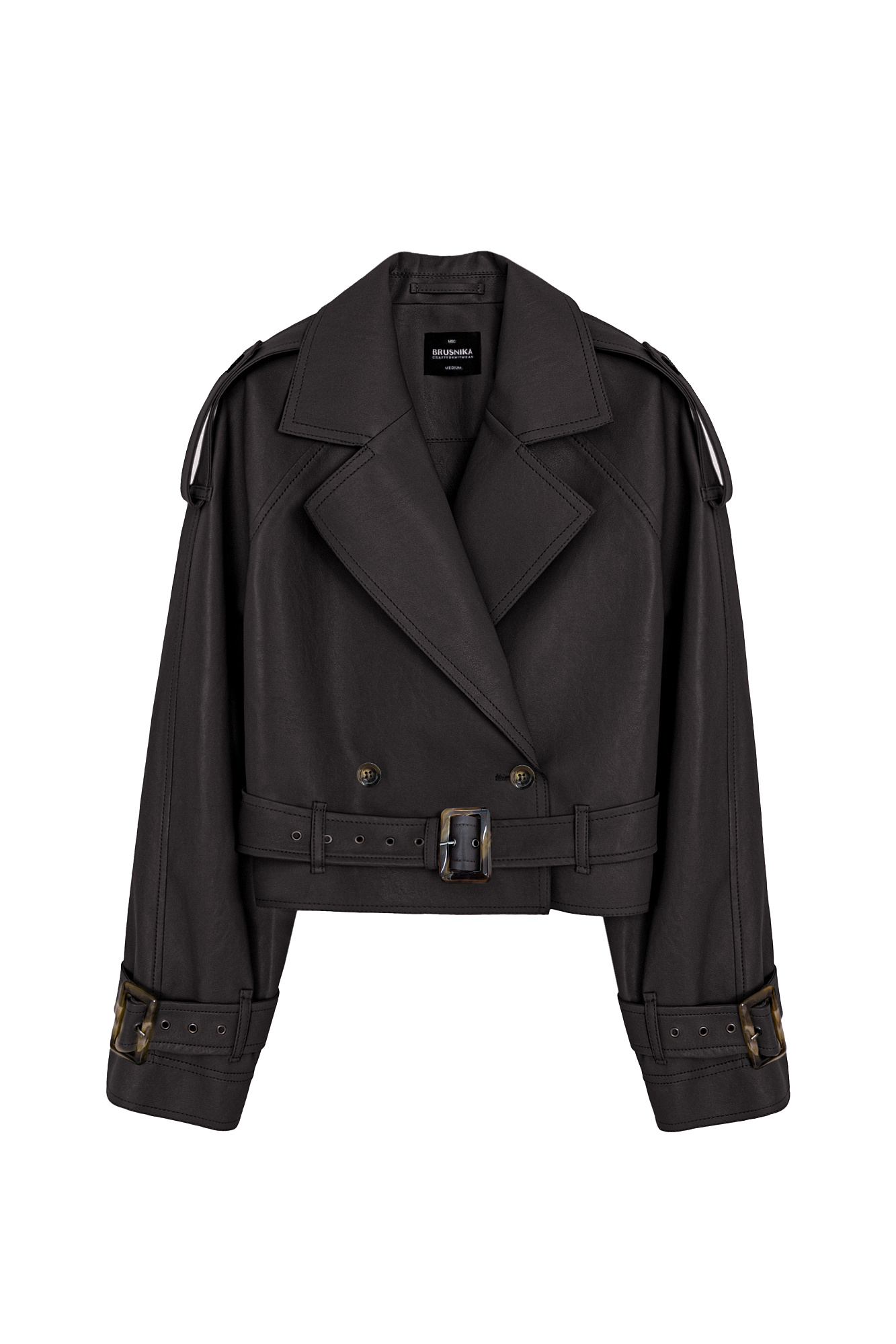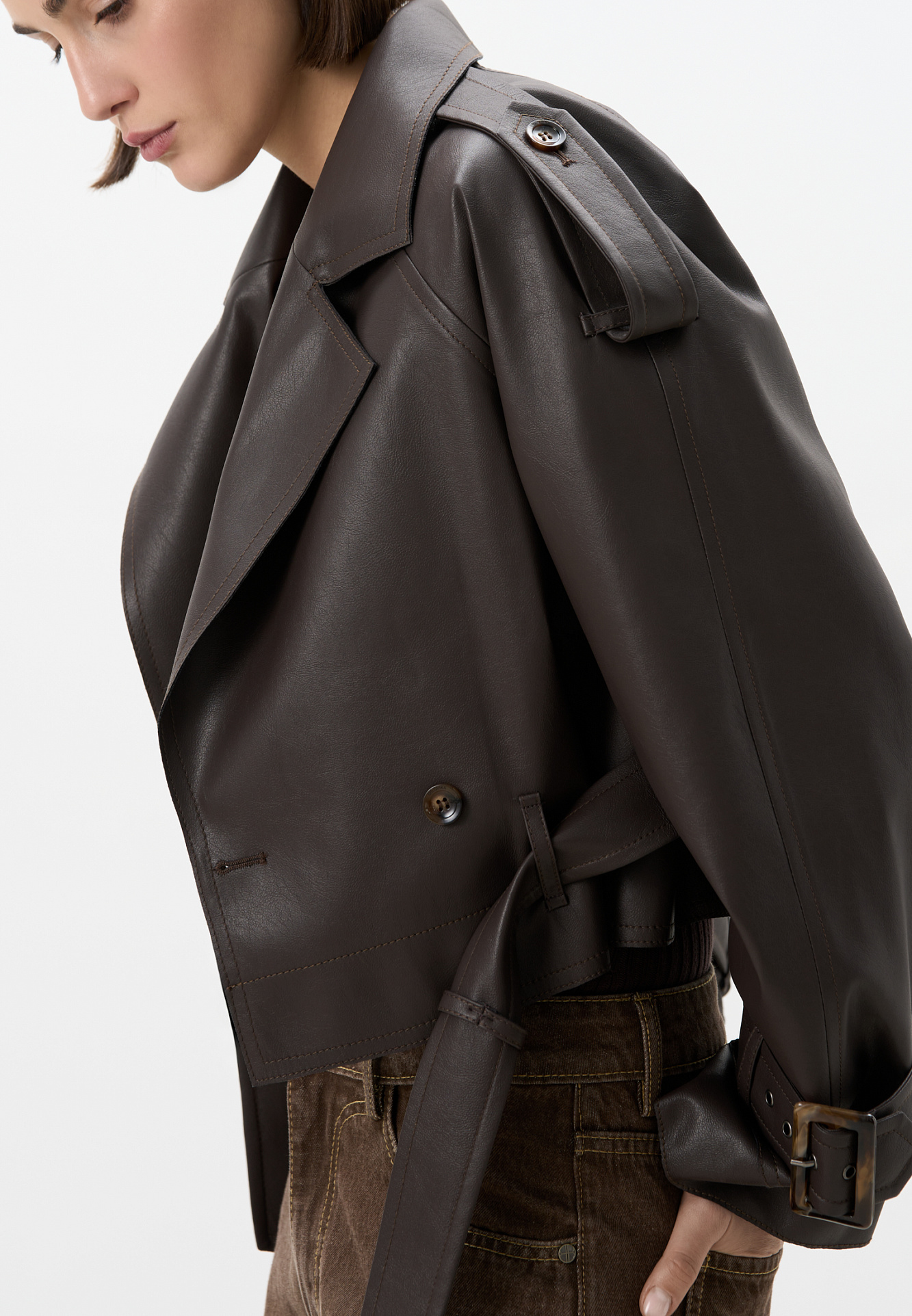 Двубортный жакет-косуха из двусторонней экокожи. Модель свободного силуэта со спущенным плечом и широкими лацканами. Изделие декорировано патами на плечах и ремнями с крупными пряжками на поясе и рукавах.