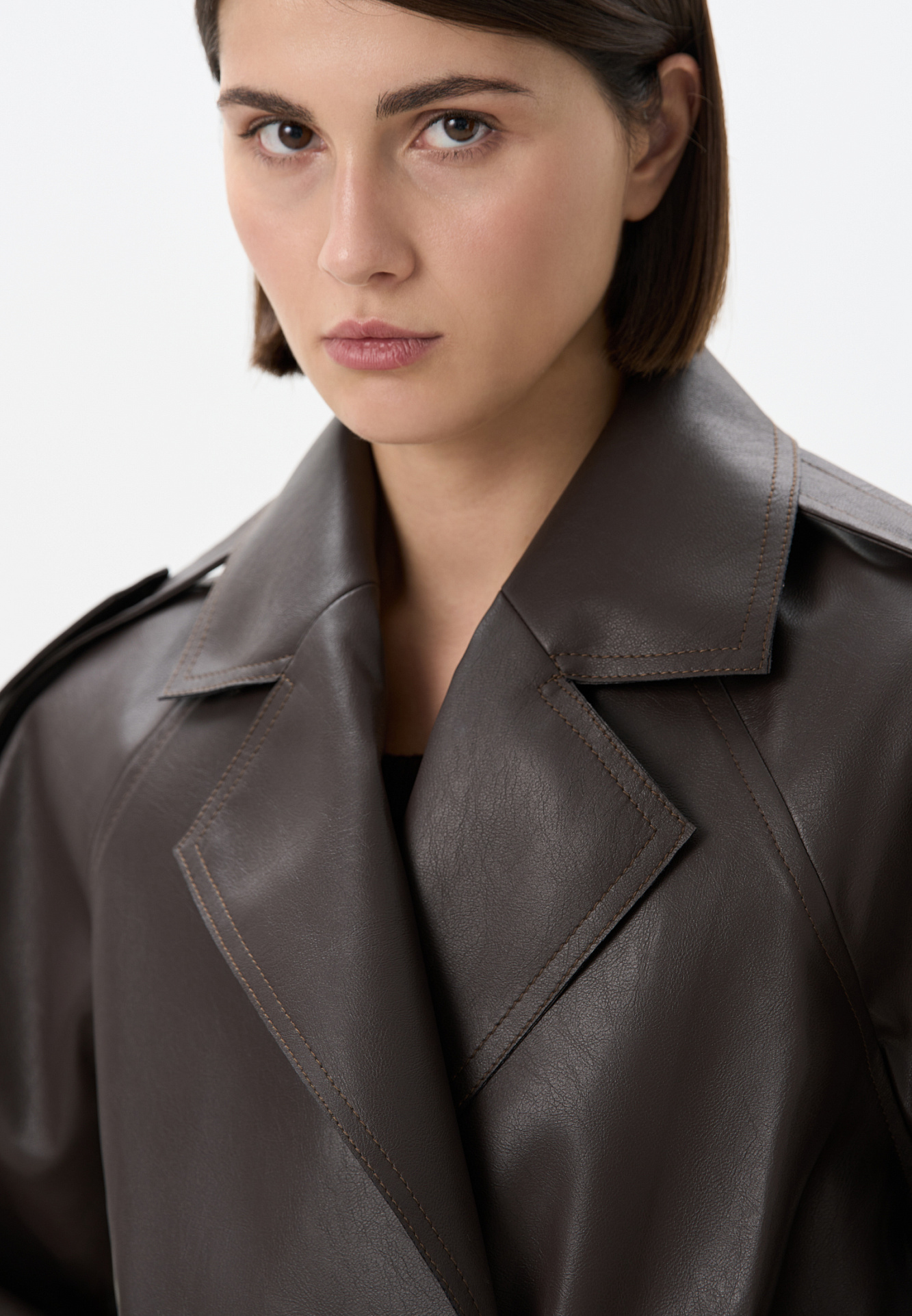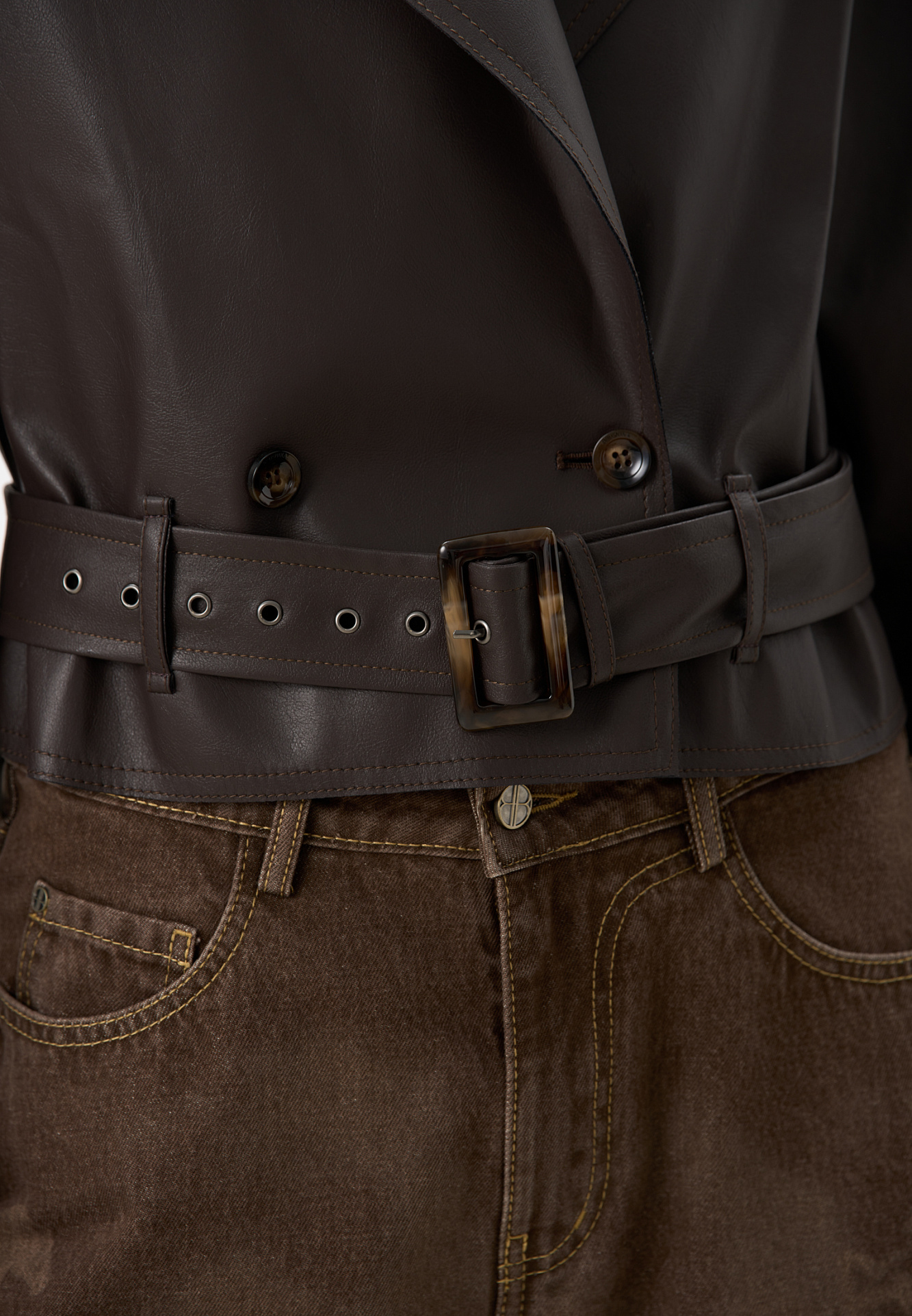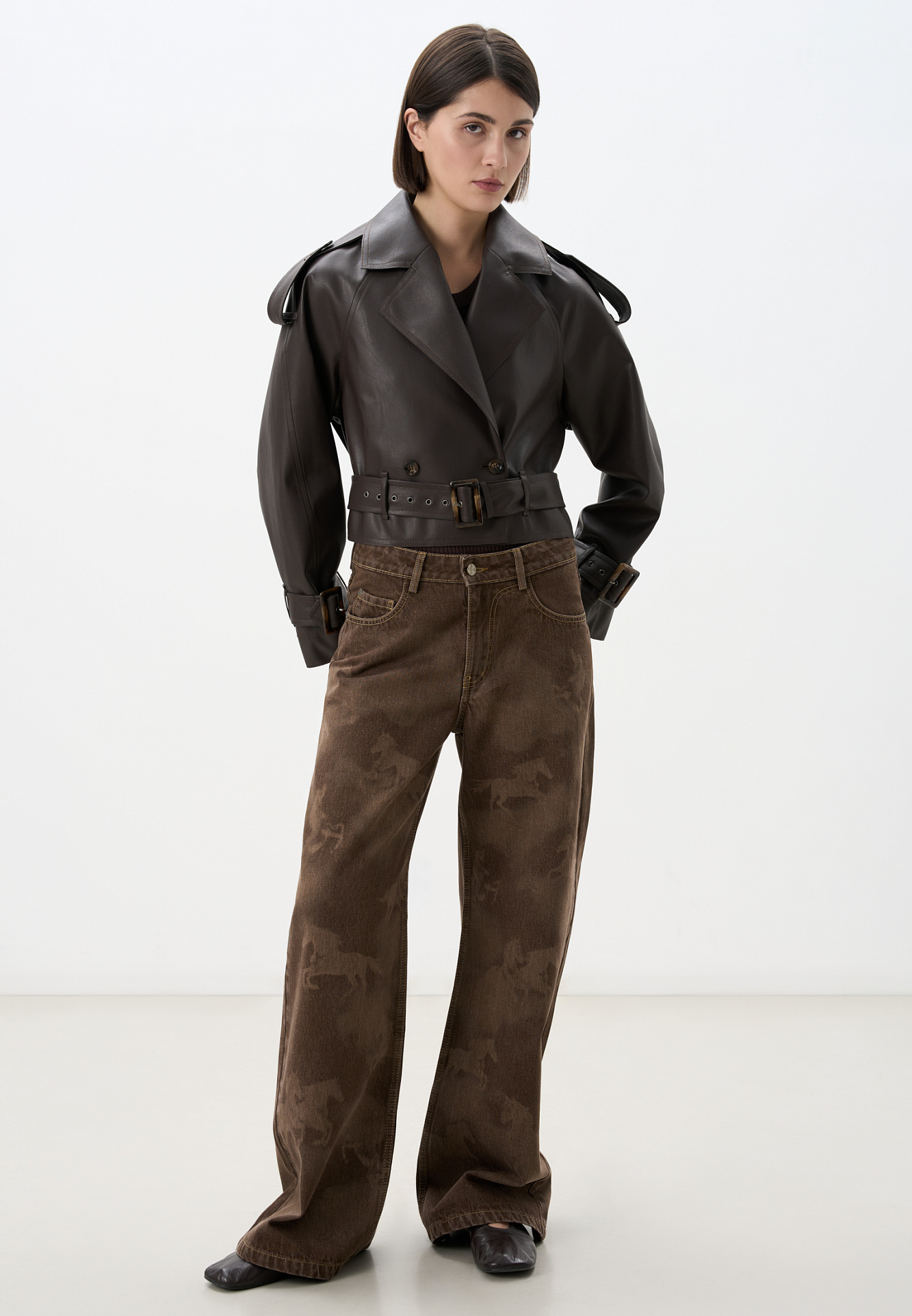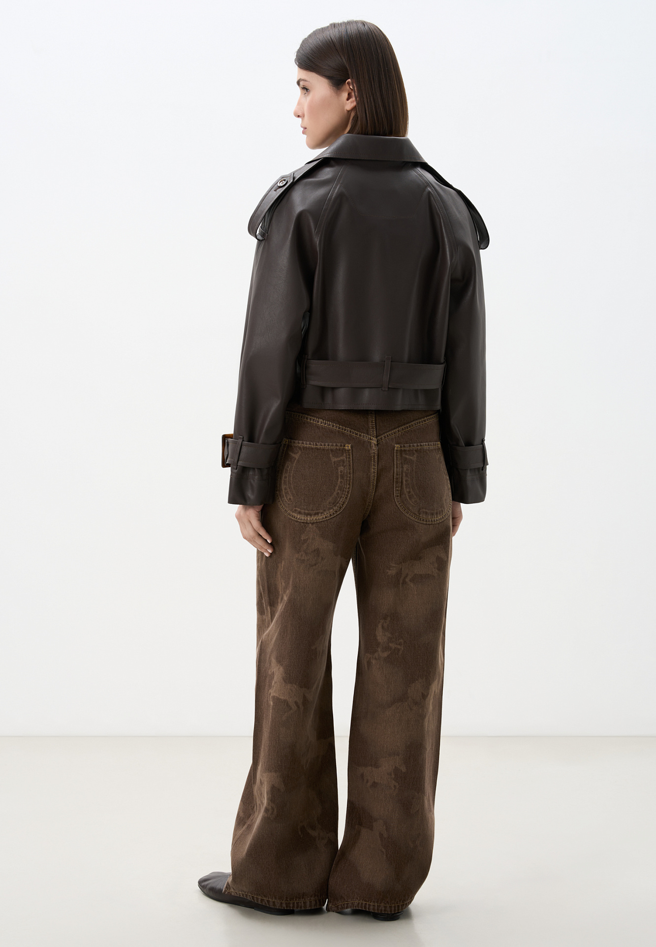 Двубортный жакет-косуха из двусторонней экокожи. Модель свободного силуэта со спущенным плечом и широкими лацканами. Изделие декорировано патами на плечах и ремнями с крупными пряжками на поясе и рукавах.