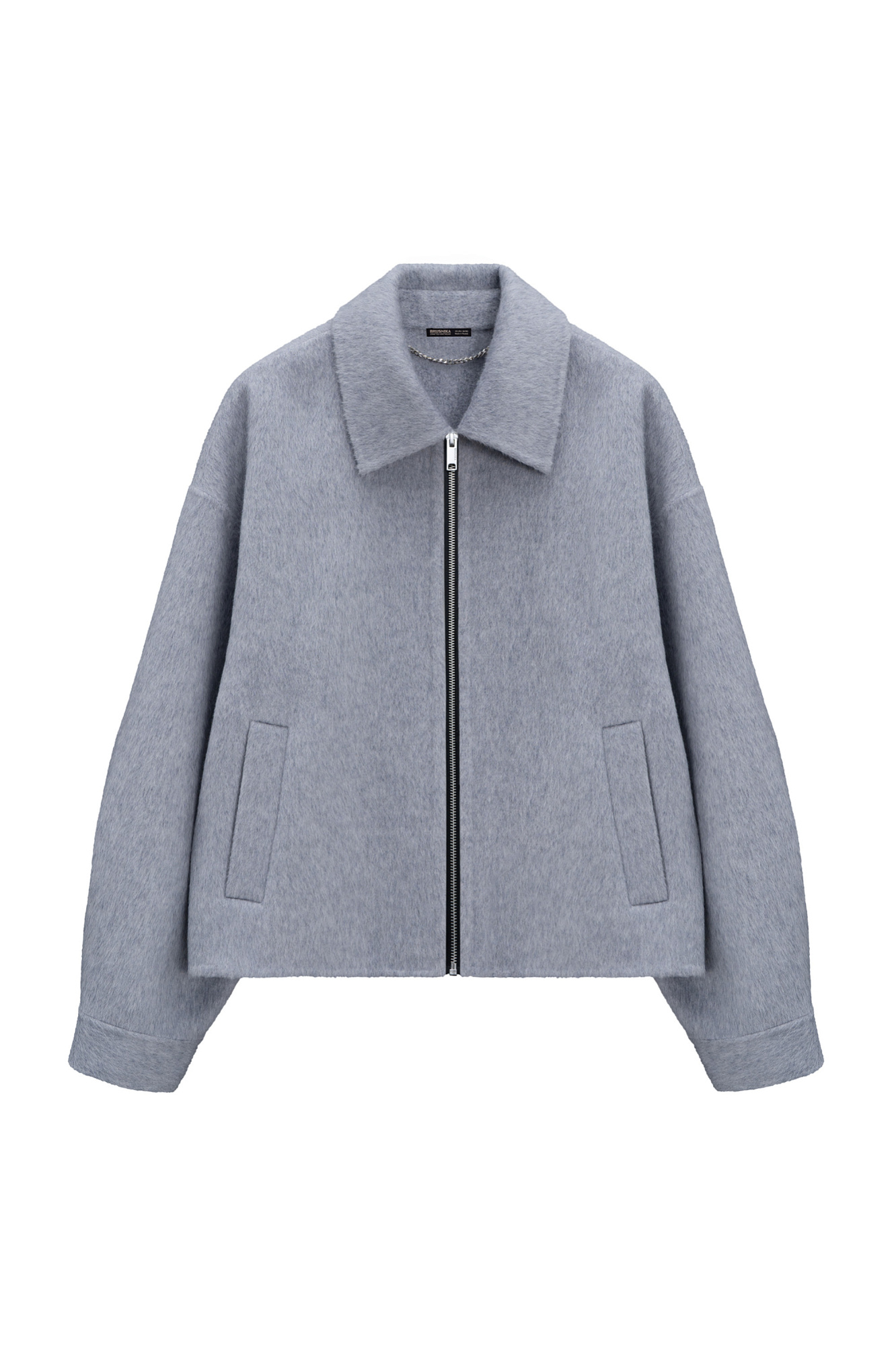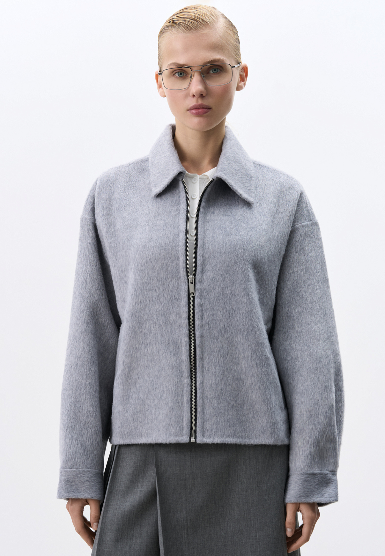 Жакет на молнии из 100% шерсти. Модель свободного кроя с отложным воротником, спущенной линией плеч и двумя боковыми карманами. Застежка на молнию. Брендированный ярлык на спине.