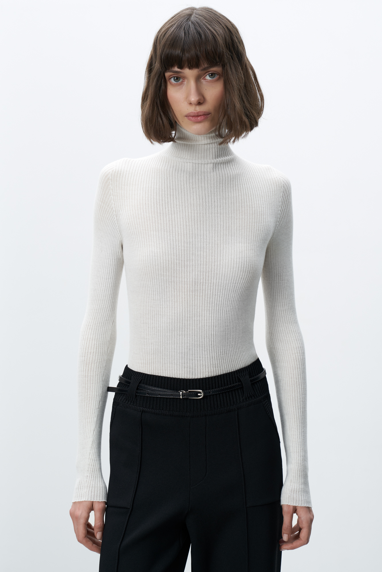 Бесшовная трикотажная водолазка из шерсти мериноса экстрафайн. Модель приталенного силуэта, с длинными рукавами и высоким воротником-стойкой.