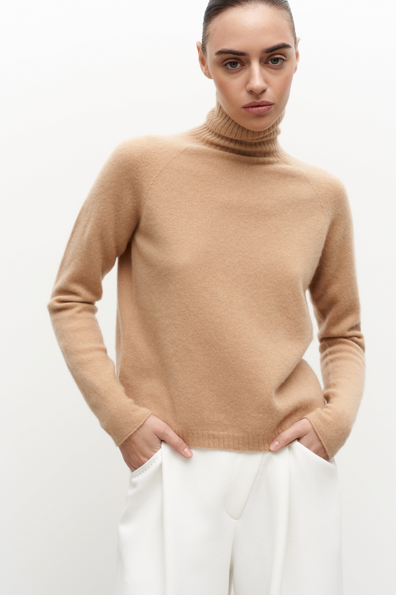 Джемпер из 100% кашемира. Модель с высоким воротником и рукавом реглан. Низ изделия и воротник выполены в рубчик.