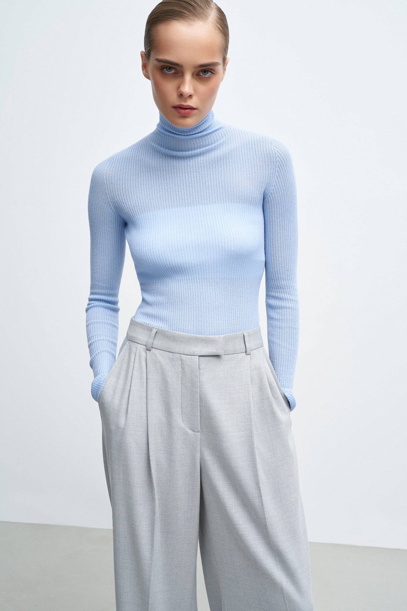 Бесшовная трикотажная водолазка из шерсти мериноса экстрафайн. Модель приталенного силуэта, с длинными рукавами и высоким воротником-стойкой.