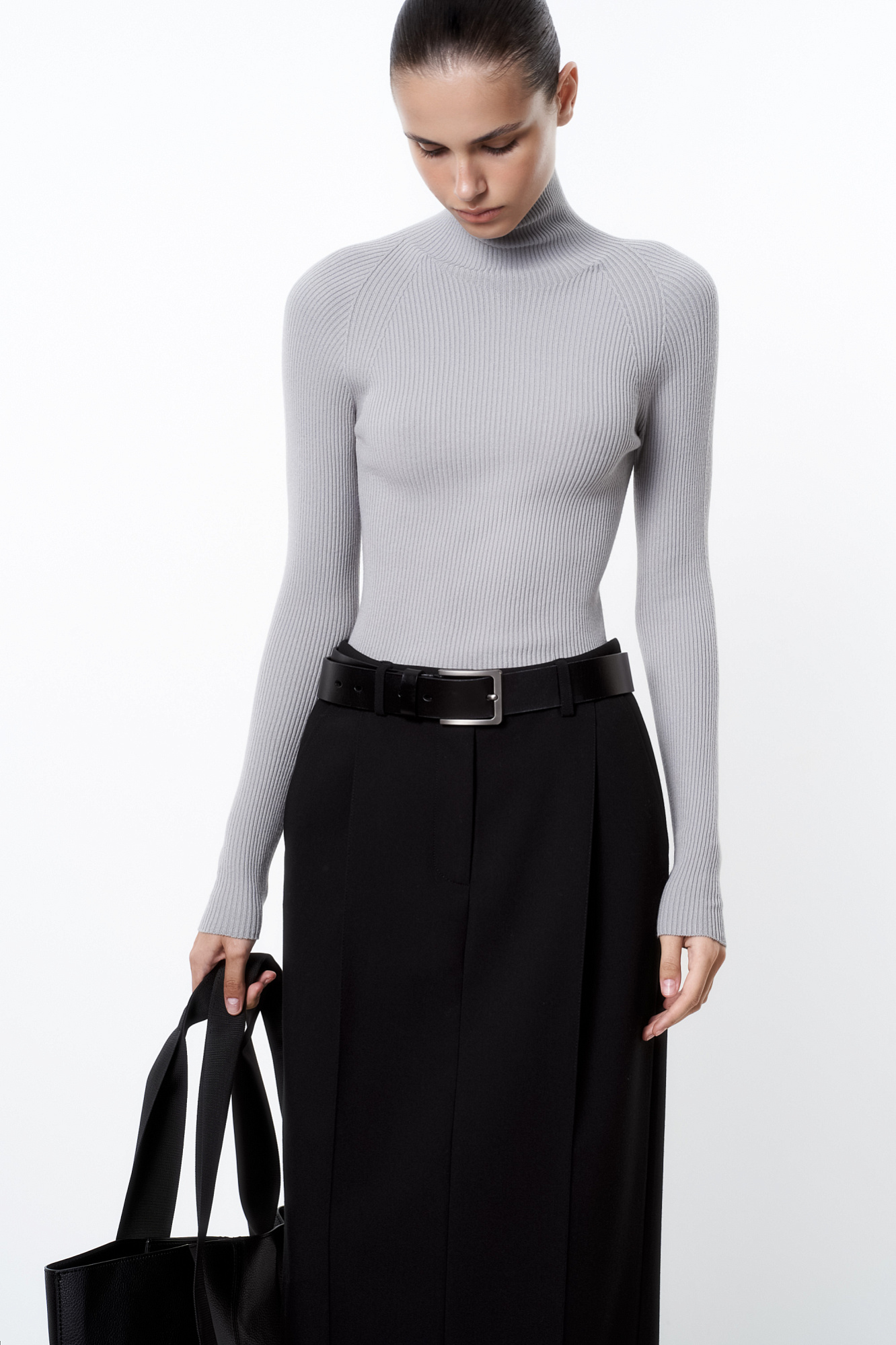 Трикотажная бесшовная водолазка из эластичной вискозы. Модель приталленого силуэта, с высоким воротником-стойкой и длинными рукавами. Изделие выполнено в рубчик.