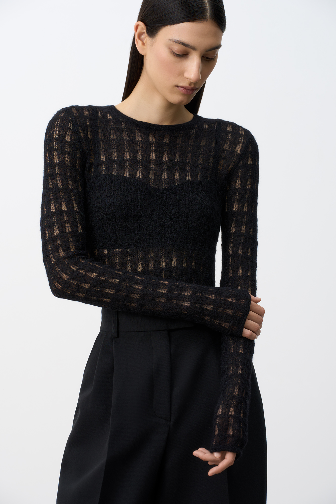 Ажурная водолазка из тонкого супер кид мохера и беби альпака. Модель с длинными рукавами и круглым неглубоким вырезом горловины.