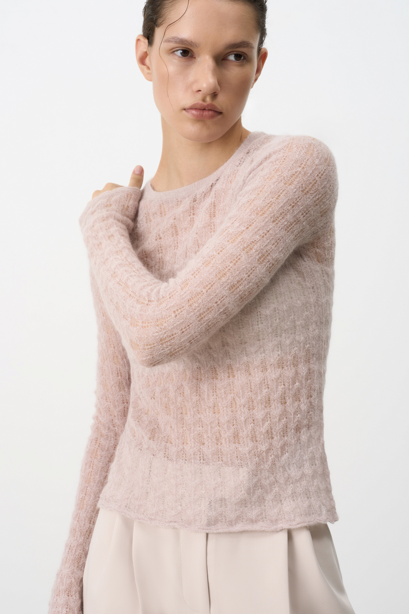 Ажурная водолазка из тонкого супер кид мохера и беби альпака. Модель с длинными рукавами и круглым неглубоким вырезом горловины.