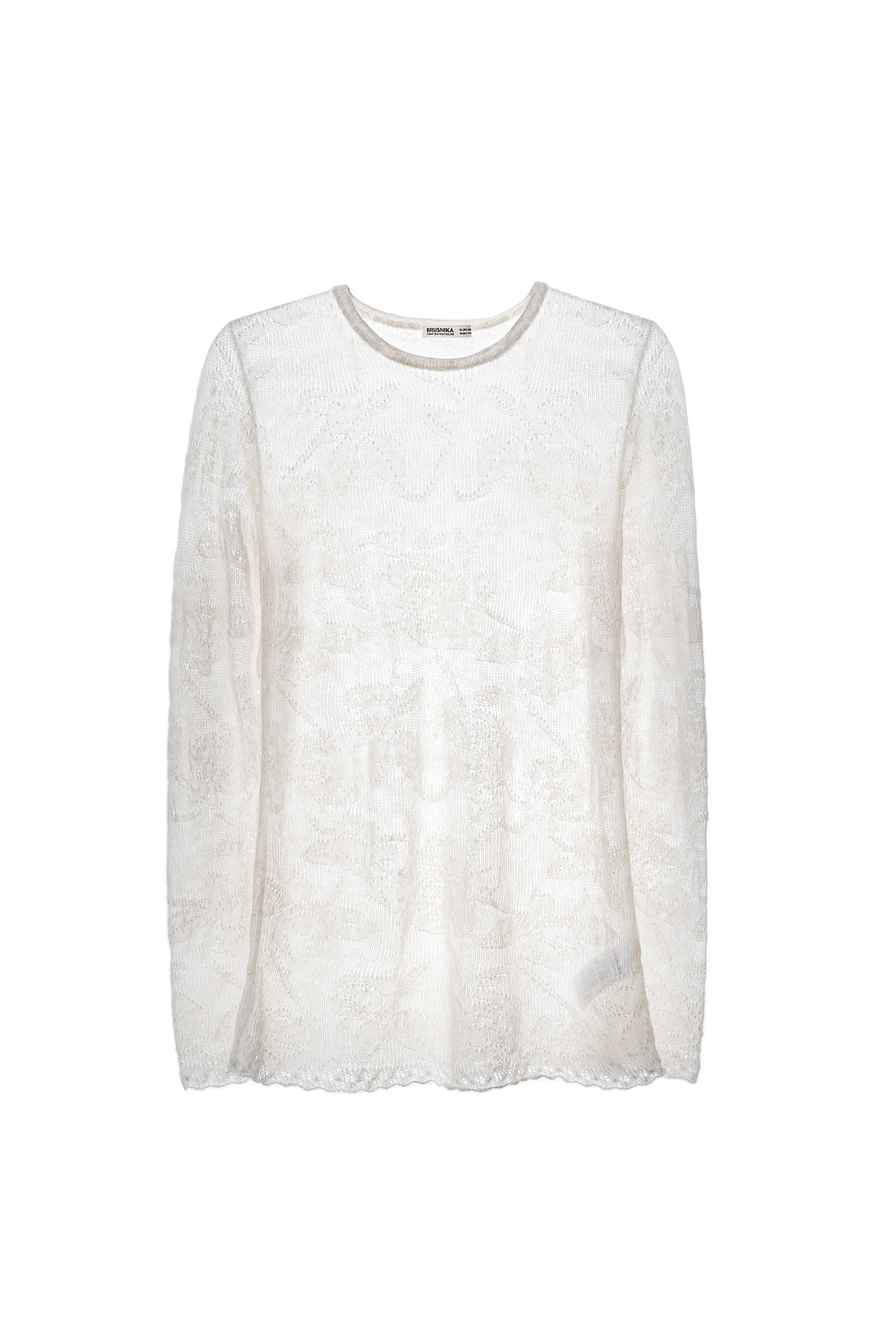 Ажурная водолазка из мягкой пряжи из беби альпака и супер кид мохера с вывязанным цветочным узором. Модель приталенного силуэта с длинными рукавами и круглым вырезом горловины. Манжеты рукавов и низ изделия декорированы ажурной каймой.