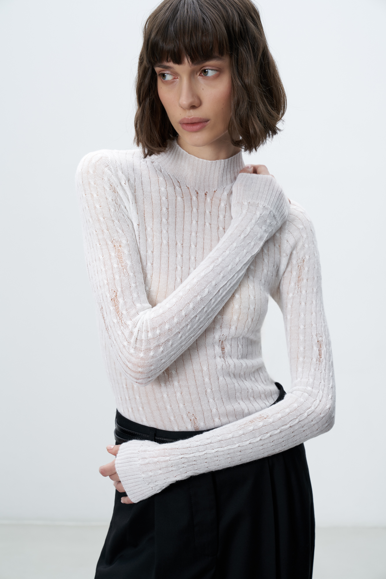 Бесшовная водолазка в стиле гранж из шерсти мериноса экстрафайн. Модель с невысоким воротником-стойкой. Манжеты рукавов, воротник и низ изделия выполнены в рубчик.