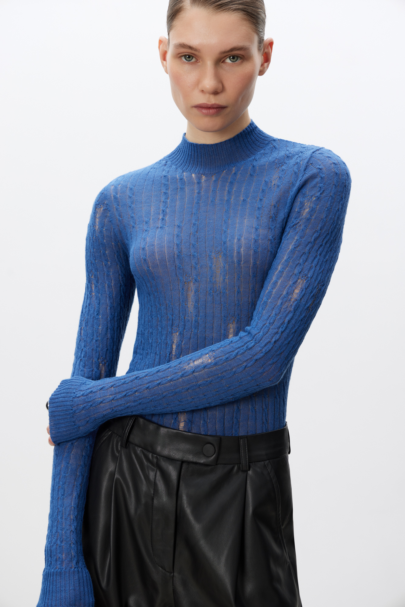 Бесшовная водолазка в стиле гранж из шерсти мериноса экстрафайн. Модель с невысоким воротником-стойкой. Манжеты рукавов, воротник и низ изделия выполнены в рубчик.
