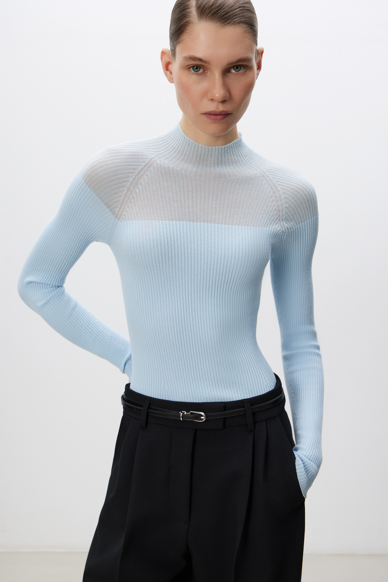 Цельновязаная водолазка из вискозы. Модель приталенного силуэта с длинным рукавом и невысоким воротником.