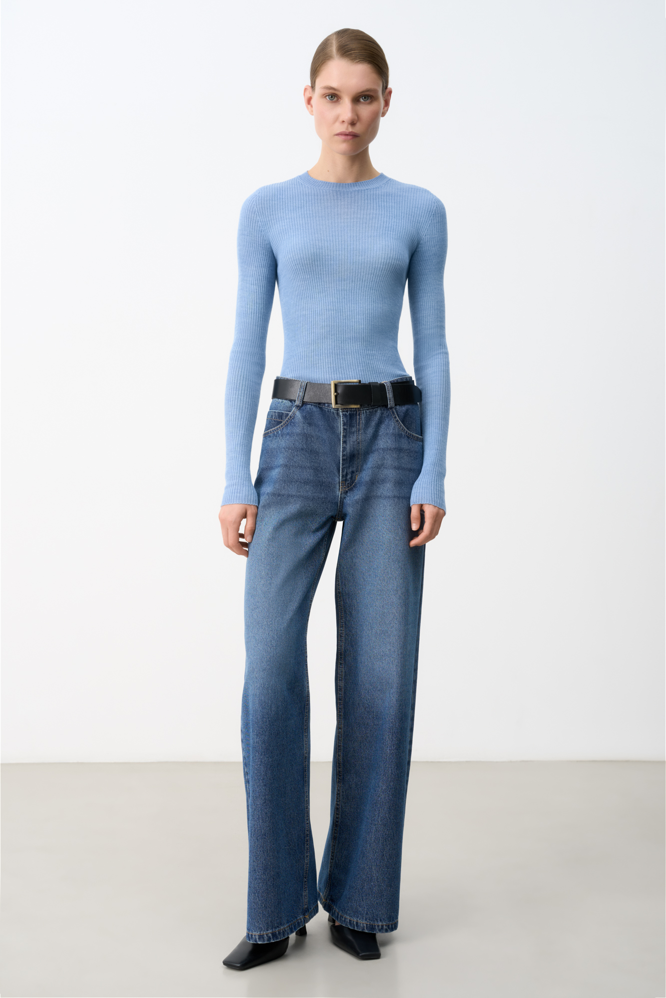 Цельновязаная полупрозрачная водолазка из шерсти. Модель с длинными рукавами и круглым вырезом. Изделие выполнено в рубчик.