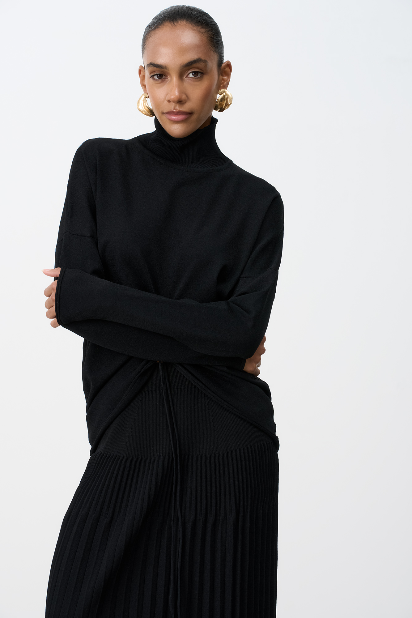 Трикотажная водолазка из вискозы. Модель свободного силуэта, со спущенной линией плеча, длинными рукавами и воротником-гольф в рубчик. Изделие декорировано драпировкой, регулируемой кулиской.