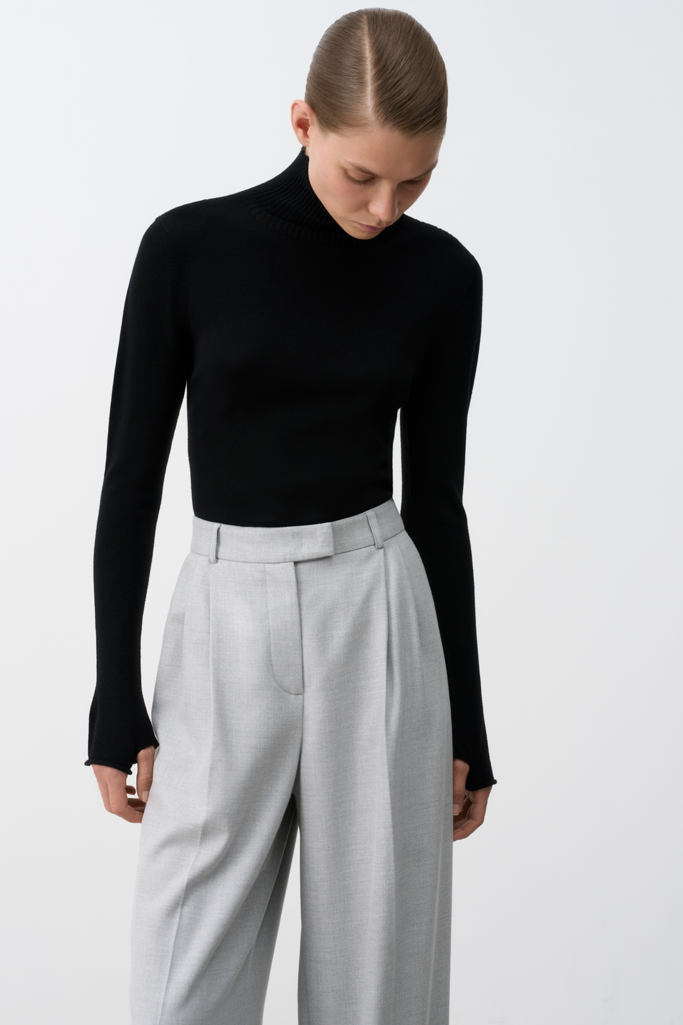 Классическая водолазка из вискозы облегающего силуэта с высоким воротом под горло. Удлиненные рукава-митенки.