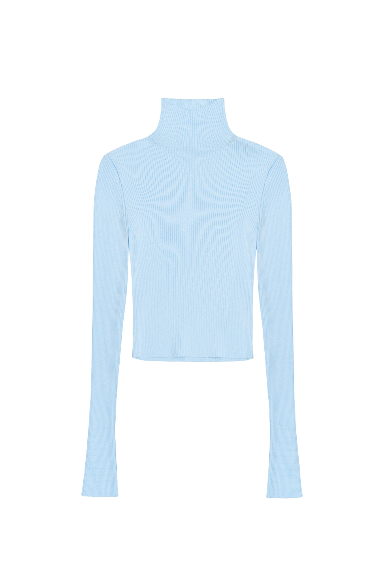 Укороченная трикотажная водолазка из вискозы. Модель приталенного силуэта, с длинными расклешенными рукавами и воротником-стойкой.