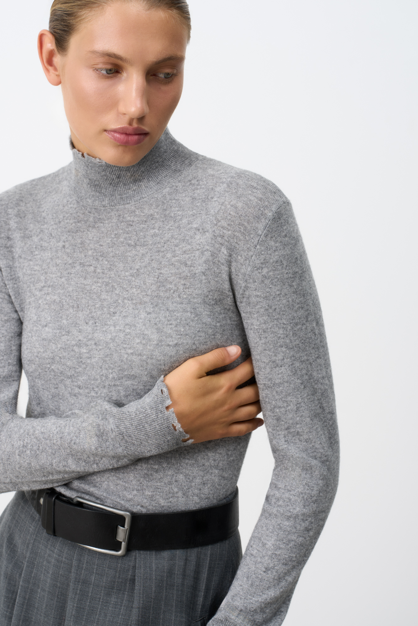 Трикотажная водолазка из шерсти с добавлением кашемира. Модель приталенного силуэта с длинным рукавом и воротником-стойкой. Манжеты рукавов, воротник и низ изделия с рваным краем.