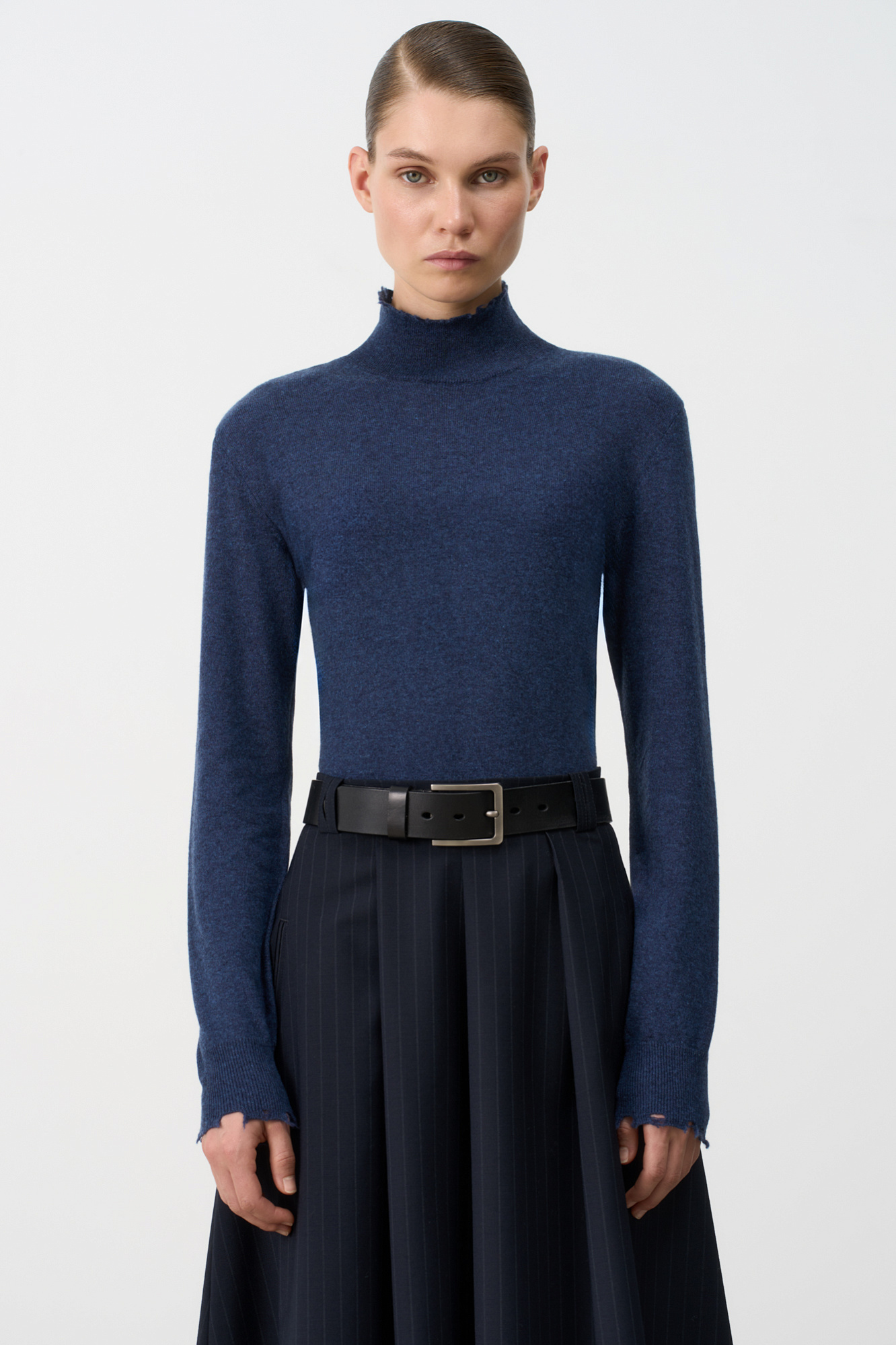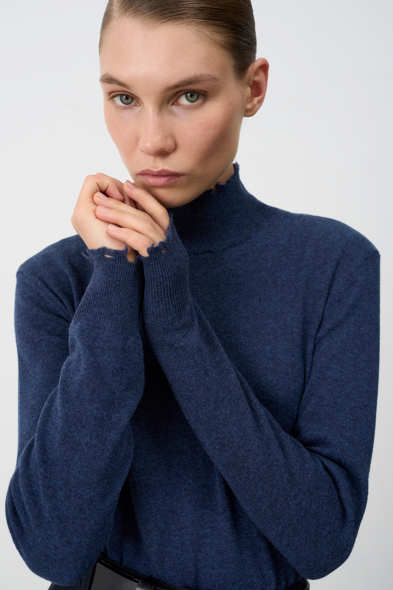 Трикотажная водолазка из шерсти с добавлением кашемира. Модель приталенного силуэта с длинным рукавом и воротником-стойкой. Манжеты рукавов, воротник и низ изделия с рваным краем.