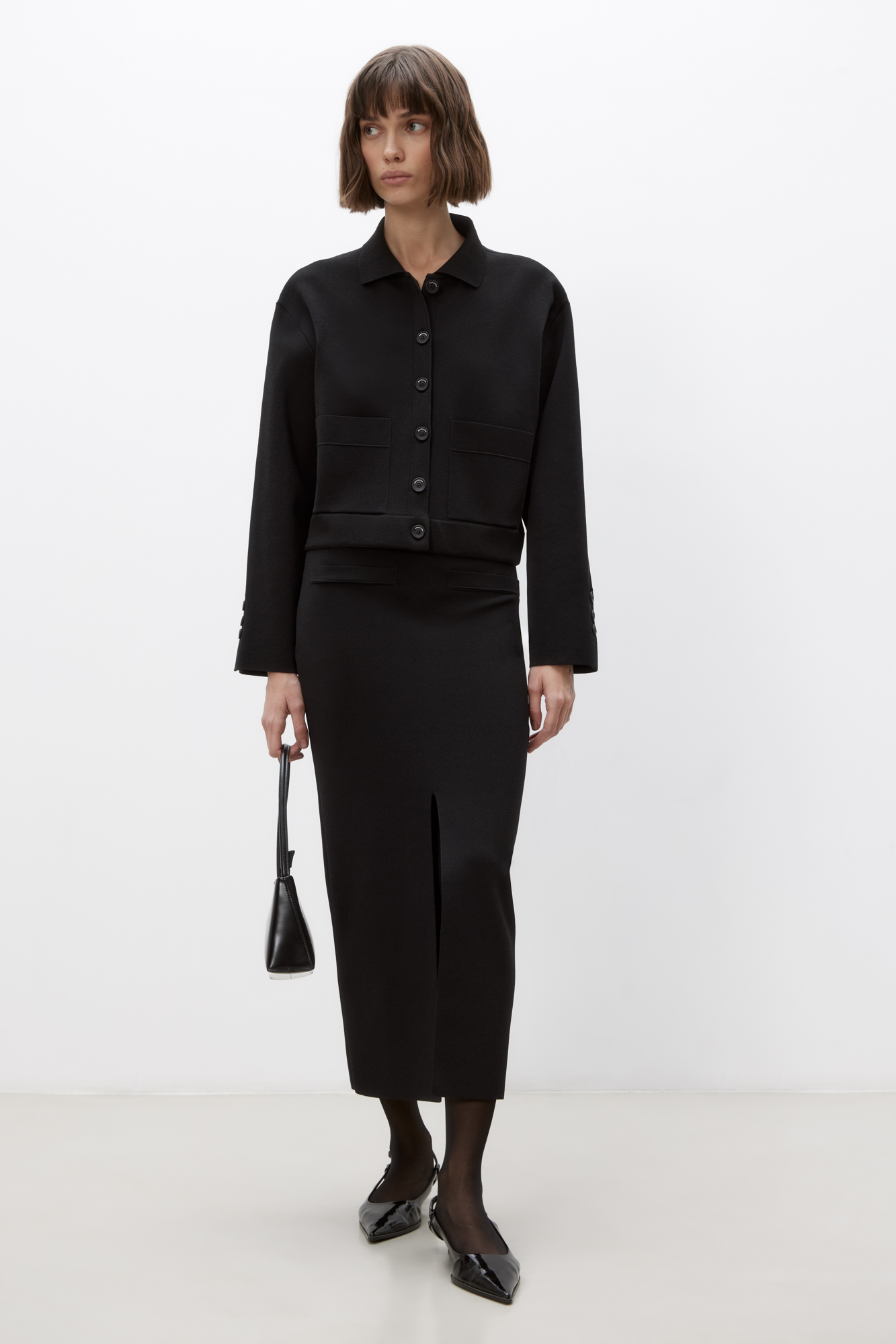 Трикотажная юбка-карандаш длины миди из вискозы. Модель приталенного силуэта с разрезом спереди, задними карманами и широким эластичным поясом.