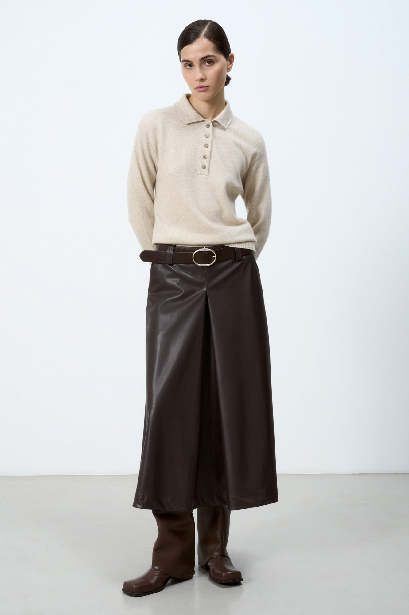 Юбка из экокожи длины миди со встречными складками, карманами и шлевками на поясе для ремня. Застежка на боковую молнию. Изделие без подкладки.
