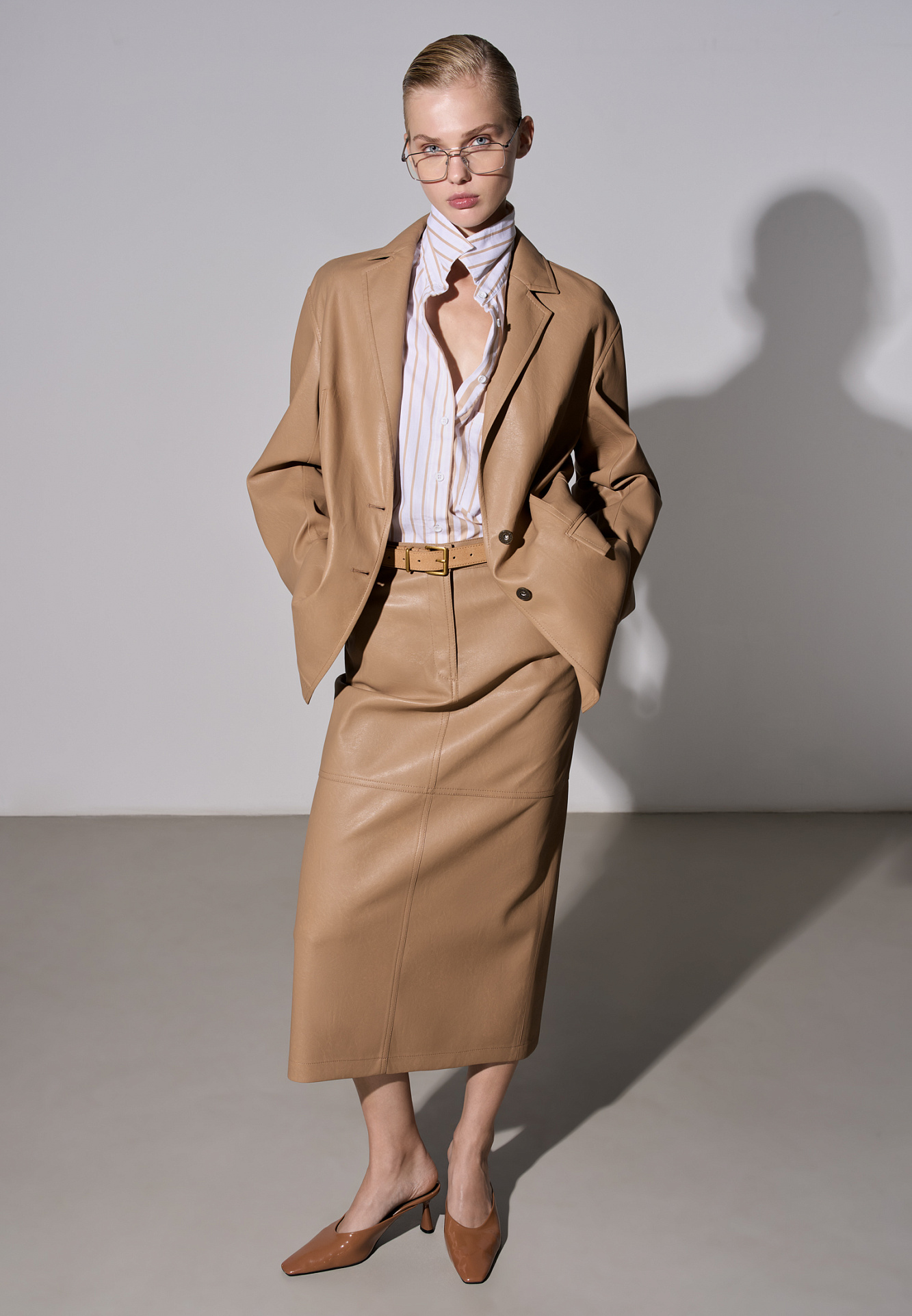 Юбка длины миди из двусторонней экокожи. Модель прямого кроя с разрезом сзади, карманами и шлевками на поясе для ремня. Застежка на пуговицу и молнию.
