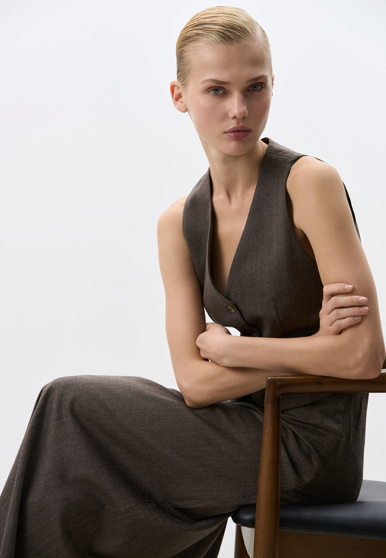 Температурный режим утюга — 150°С. Изделие на подкладке утюжат с лицевой стороны.