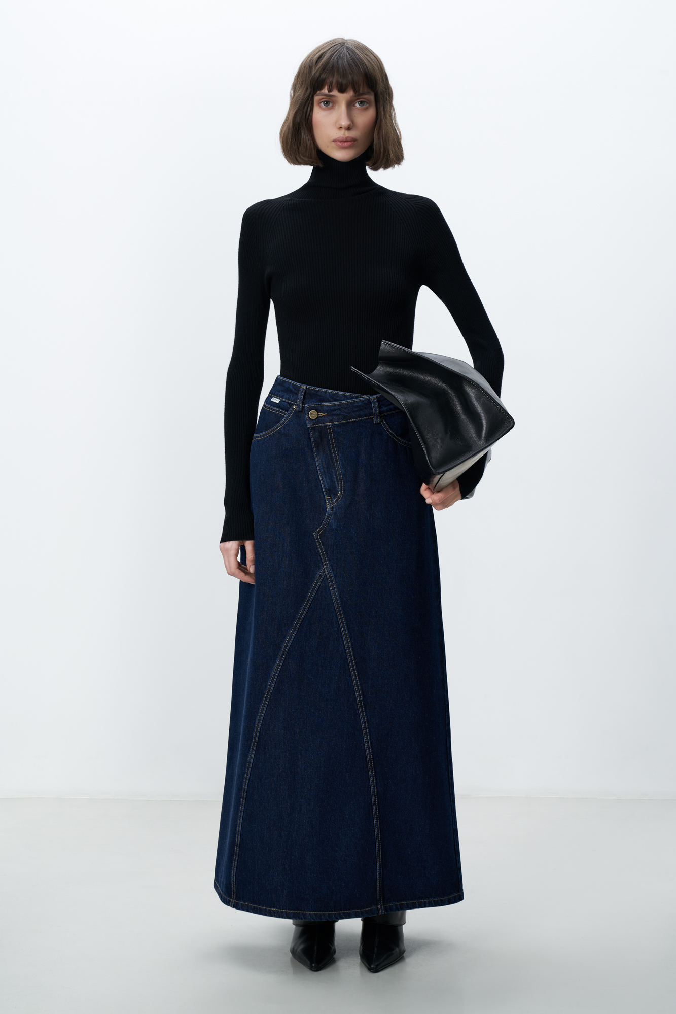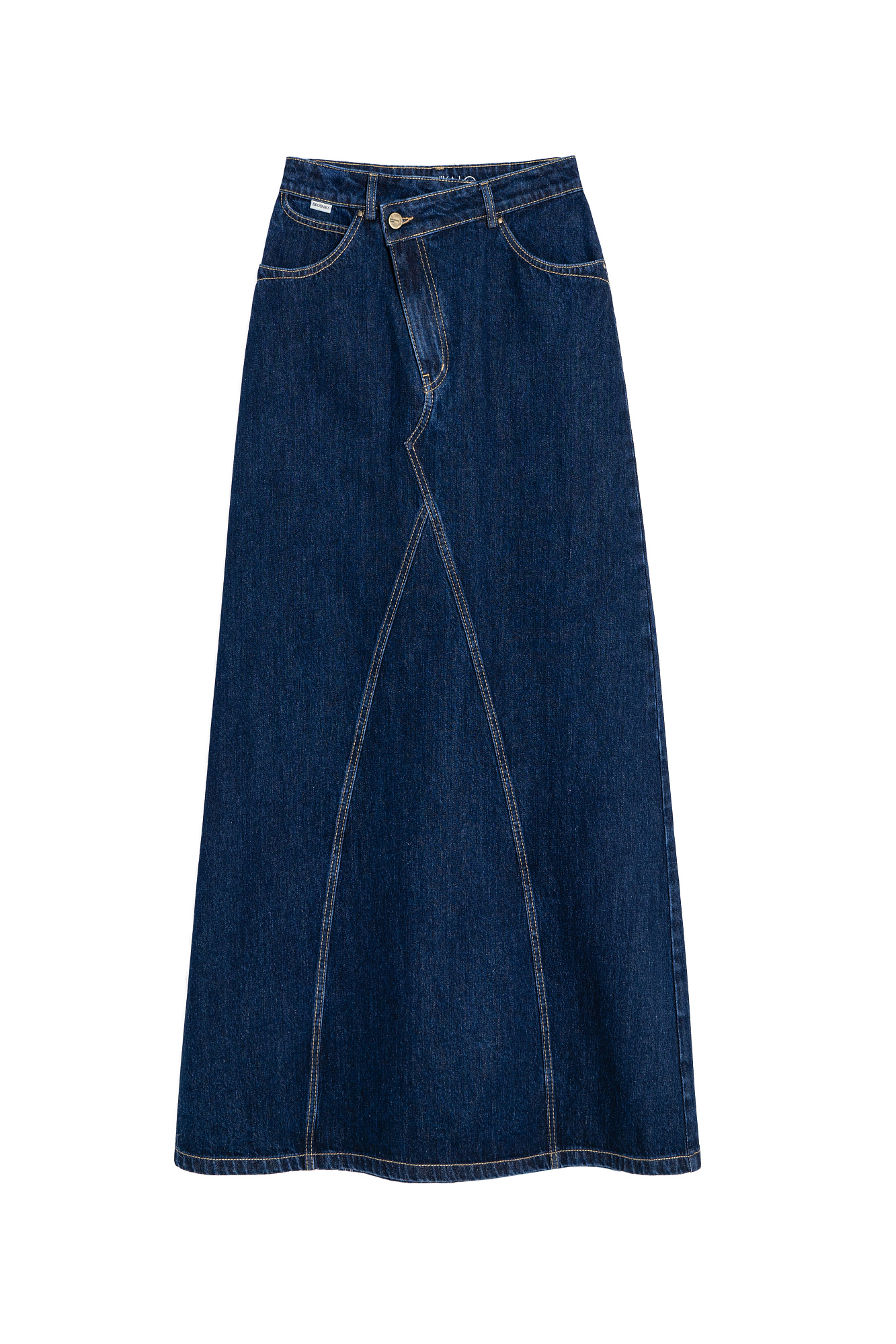 Джинсовая юбка длины миди. Модель приталенного силуэта с косой застежкой. Пять карманов.