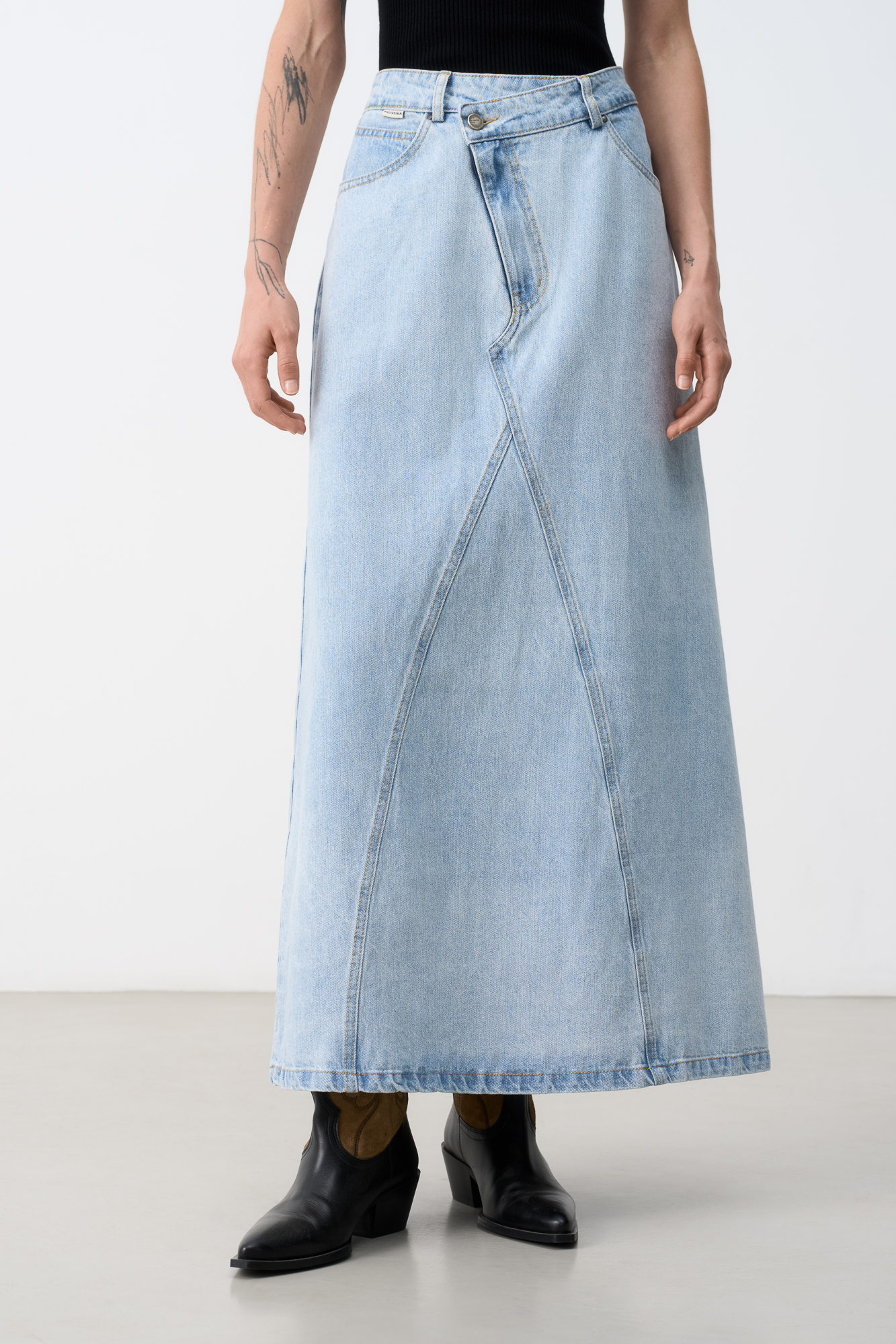 Джинсовая юбка длины миди. Модель приталенного силуэта с косой застежкой. Пять карманов.